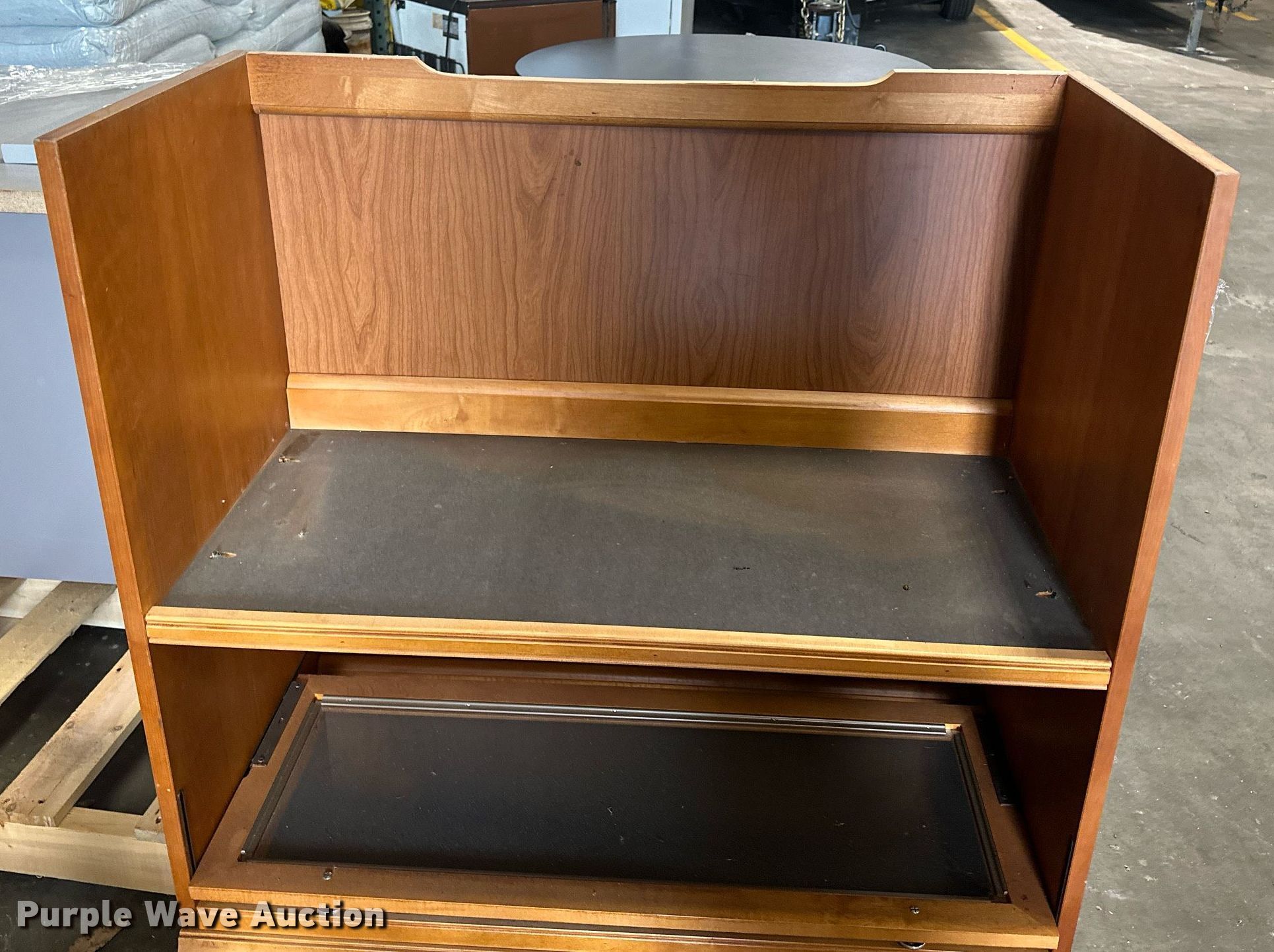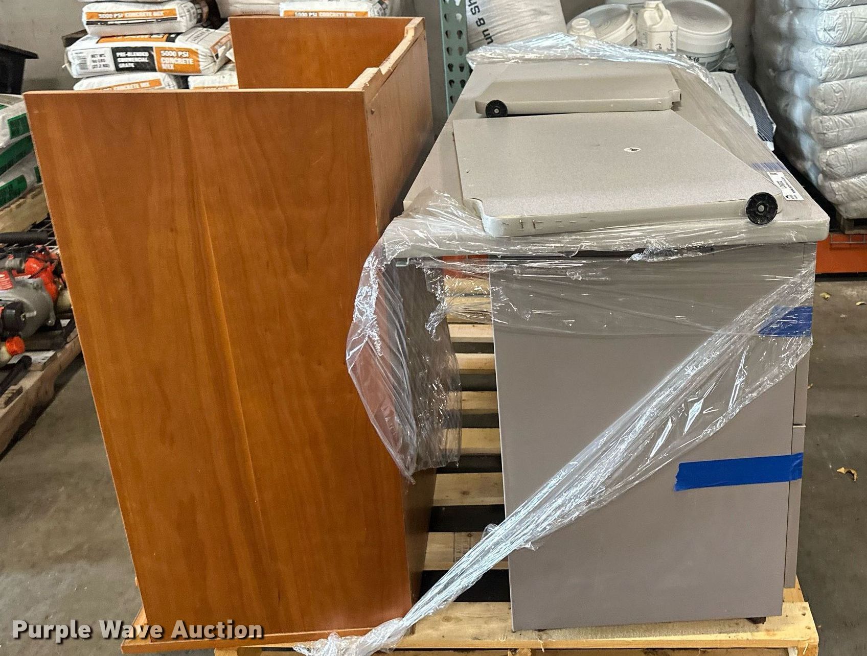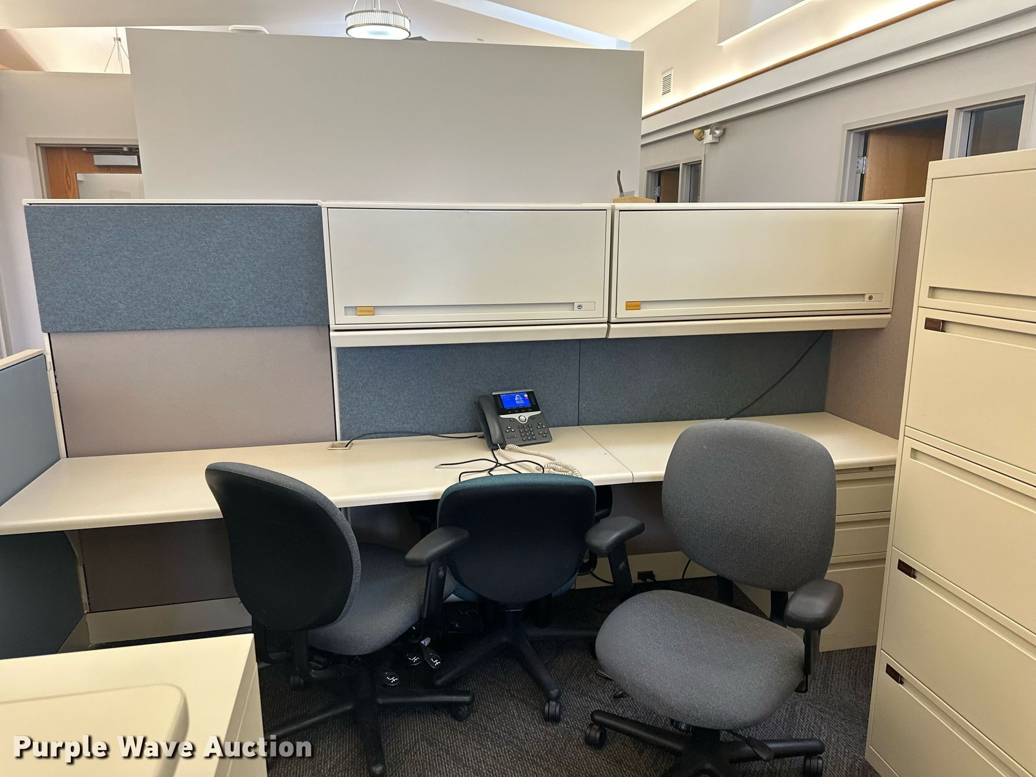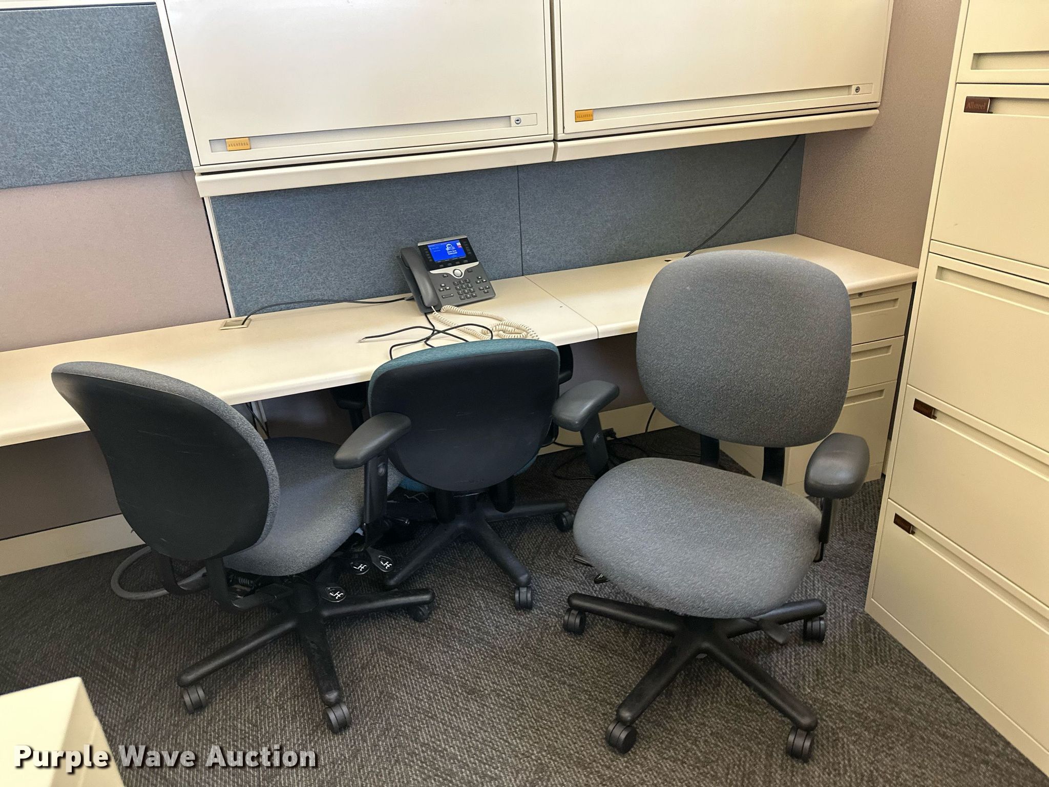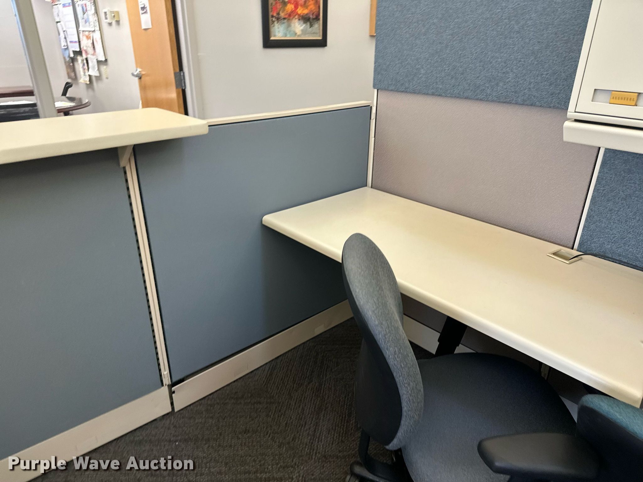 Purple Wave is selling a used Furniture in Minnesota. This item is a Furniture with the following: Cubicle, Desk, Filing cabinets, Chairs, Book shelf, Telephone not included