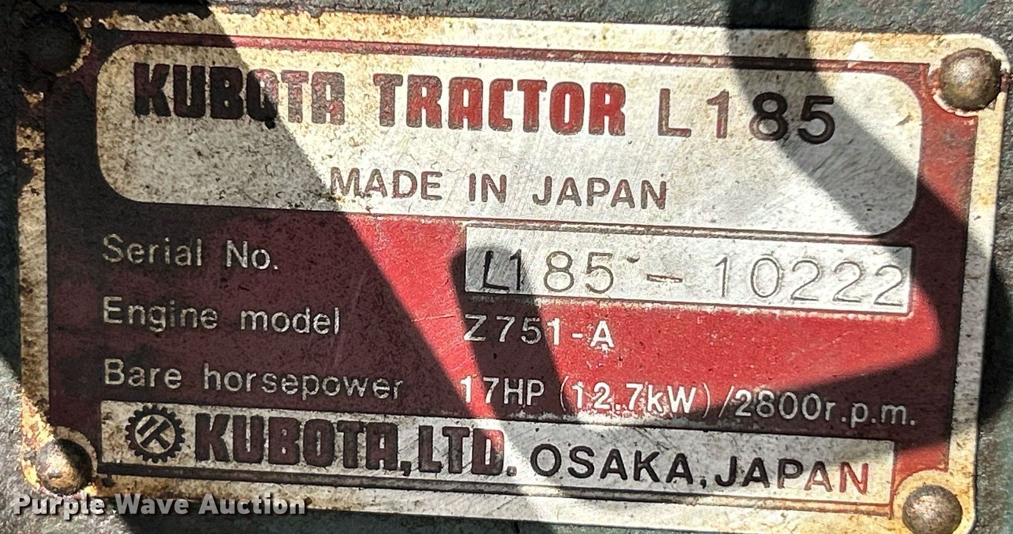 Purple Wave is selling a used Tractor in Missouri. This item is a Kubota L185 tractor with the following: Hours: 652 on meter, Serial: L185-10222