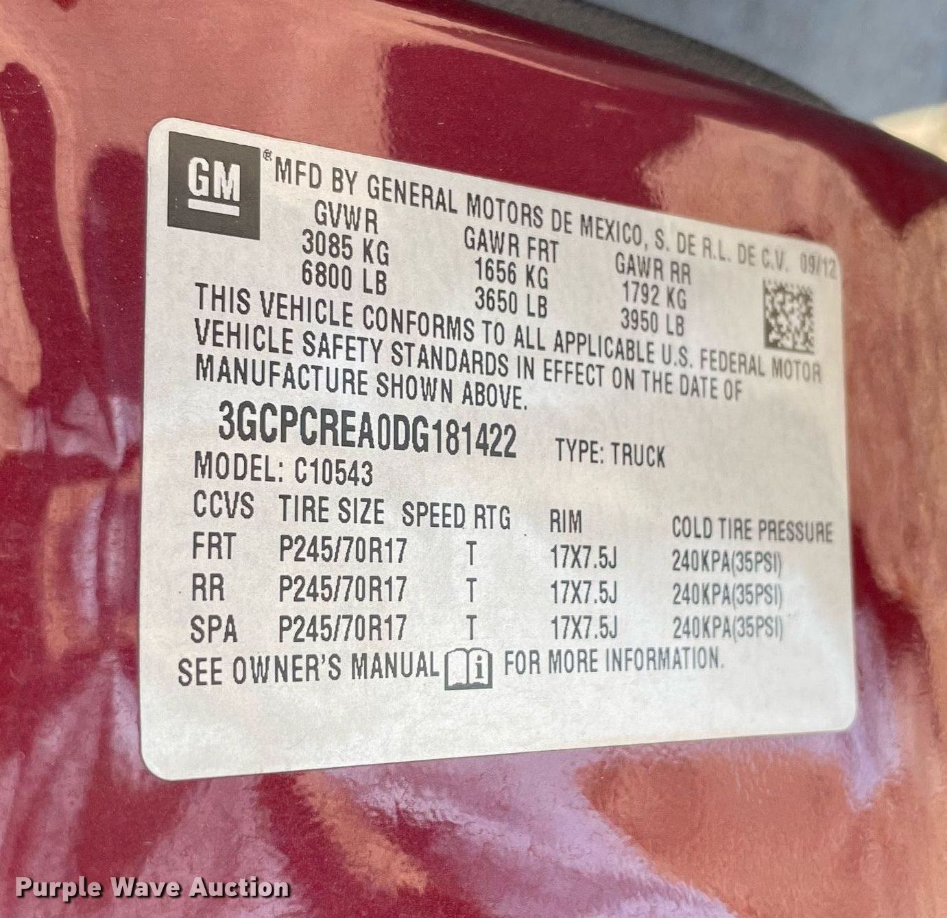2013 Chevrolet Silverado 1500 Crew Cab pickup truck. Miles: 192,448 on odometer, VIN: 3GCPCREA0DG181422. Engine Displacement: 4.8L V8 OHV, Cylinders: 8, Fuel type: Gas. Transmission Automatic. Interior AC, Heat, Power windows, Power locks, Cruise control. Tires Size: P265/70R17. Notes Dash warning indicator: Traction control, Hail damage. Texas title. Rusk County, TX. 210 West Charlevoix Street. Henderson, TX 75652