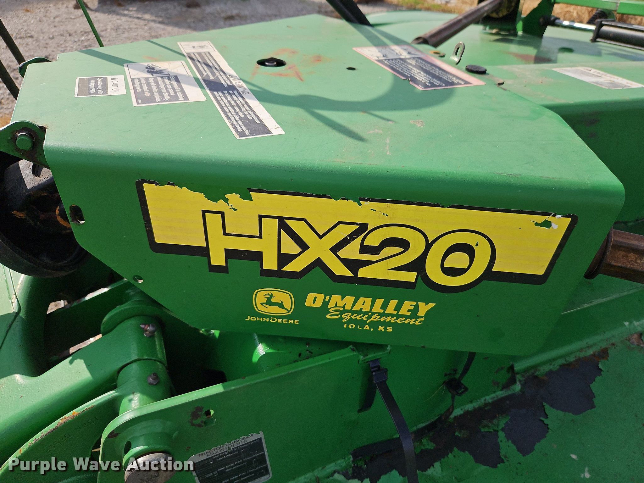 2008 John Deere HX20 batwing rotary mower. Serial: W0HX20F005348. Features Width: 20', Hydraulic lift, Hydraulic fold, PTO: 1000. Tires Size: 21x7-12, Foam filled. Mound City, KS 66056