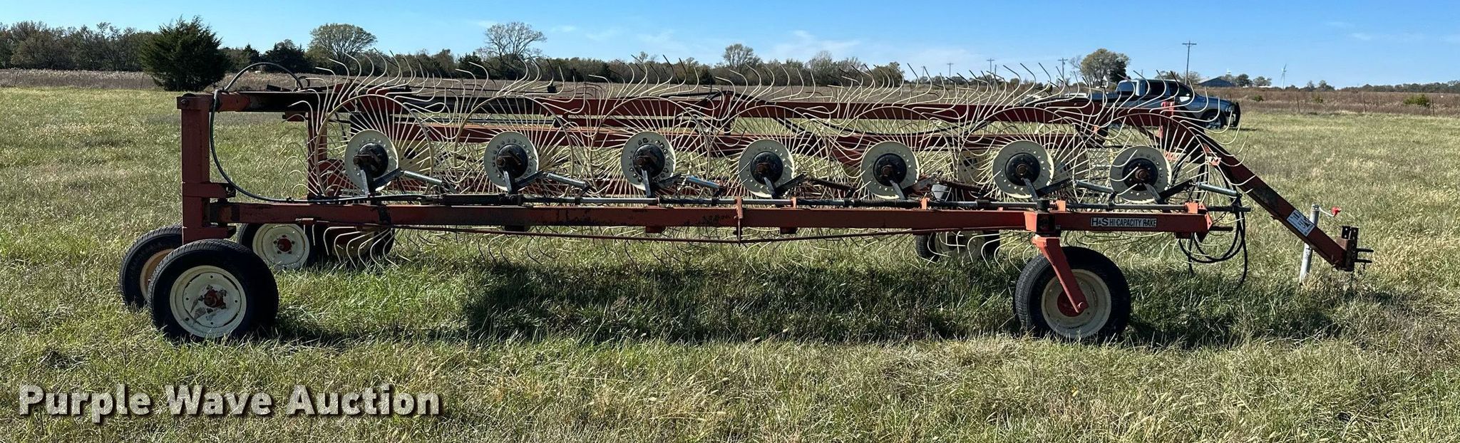 Purple Wave is selling a used Hay Rake in Kansas. This item is a H&S BF14HC hay rake with the following: Width: 50', Wheels: 14, Diameter: 55", Hydraulic lift, Hydraulic fold, Ground driven