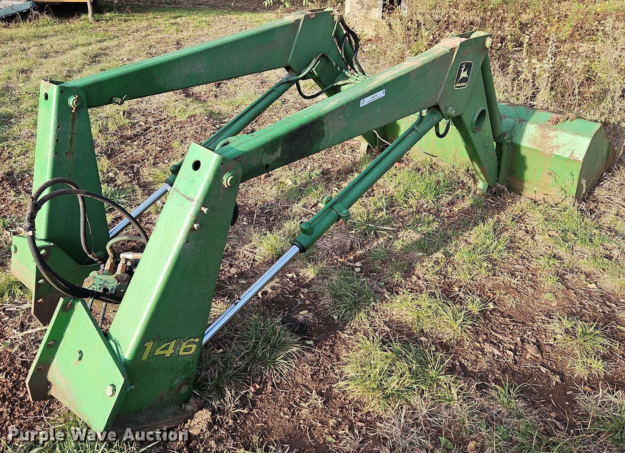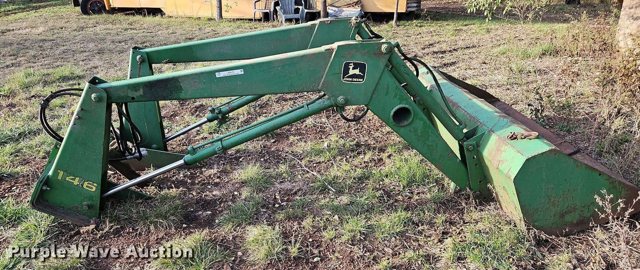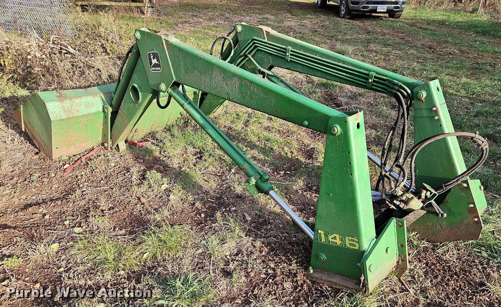 Purple Wave is selling a used Ag Tractor Loader or Attach. in Kansas. This item is a John Deere 146 loader arms with the following: Controls: Two lever, Bucket, Width: 60"