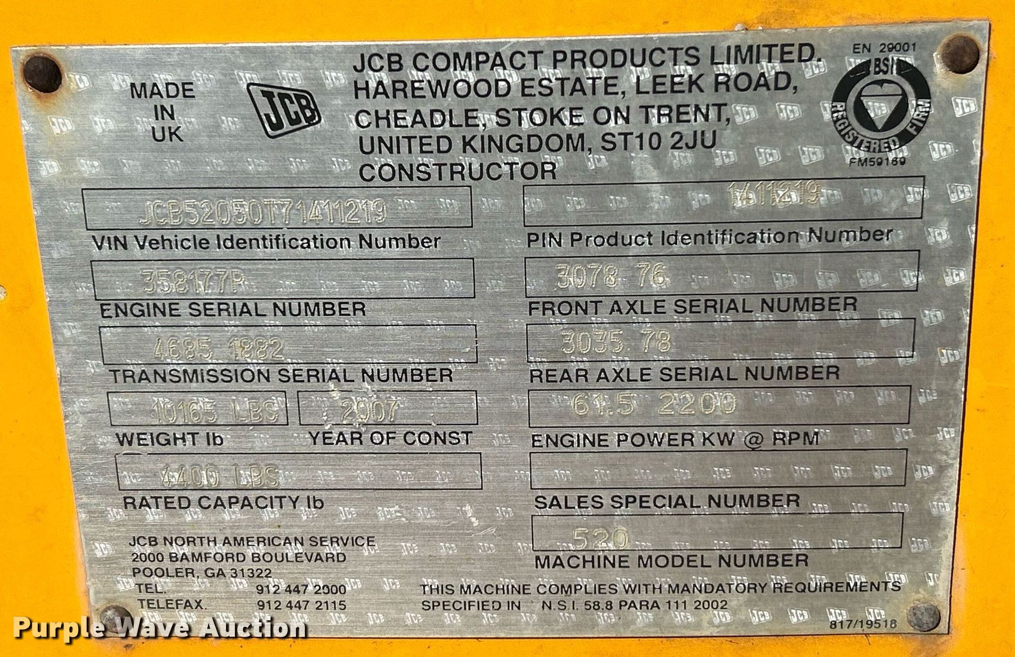 Purple Wave is selling a used Telehandler in Missouri. This item is a 2007 JCB 520 telehandler with the following: Hours: 4069 on meter, Hours: 5891 on second meter, Serial: 1411219