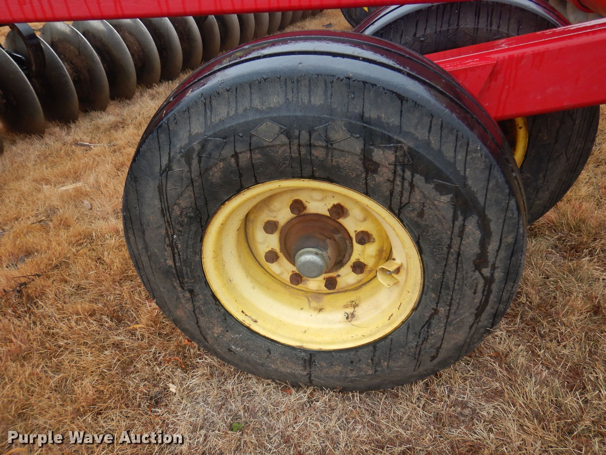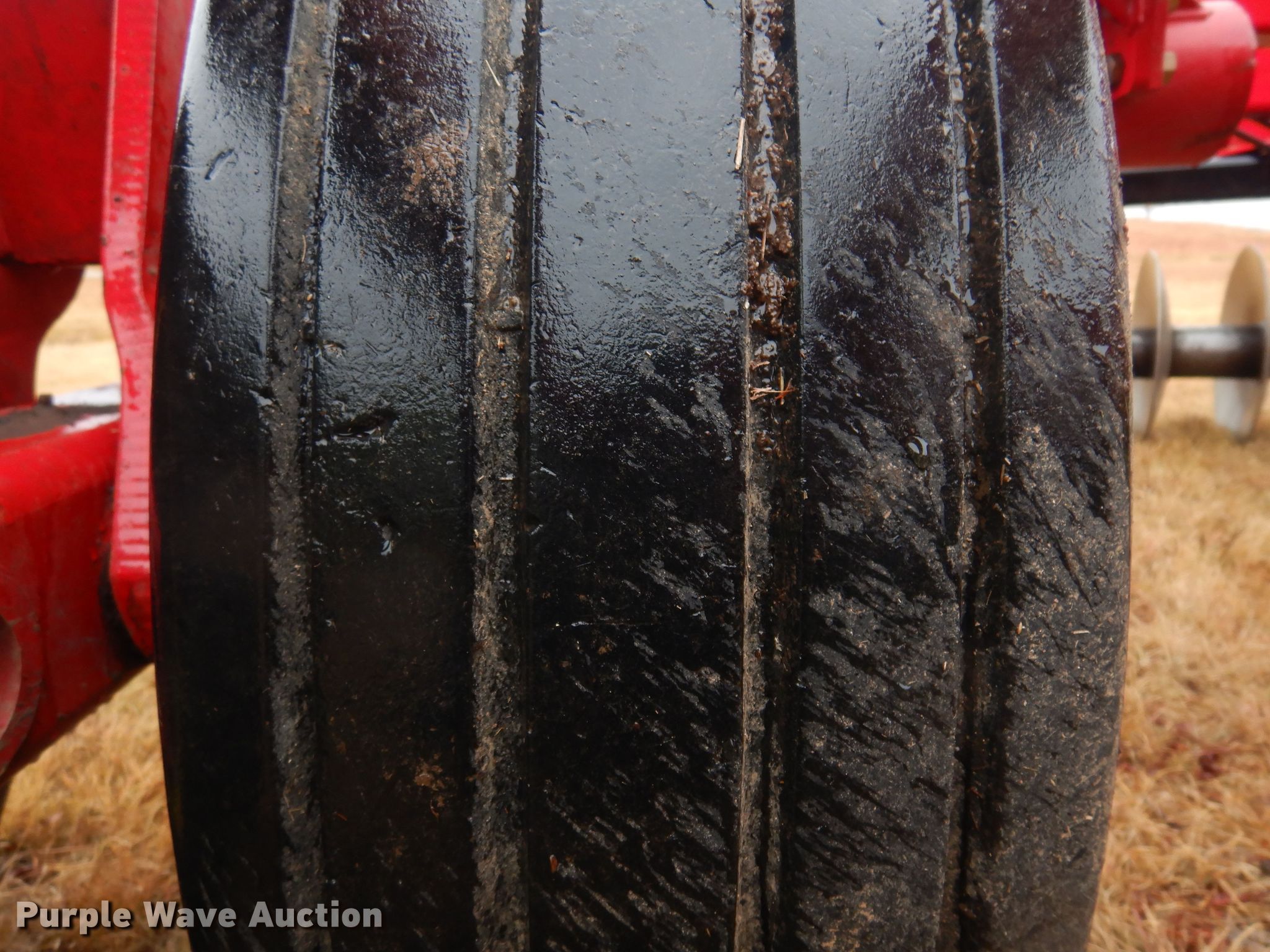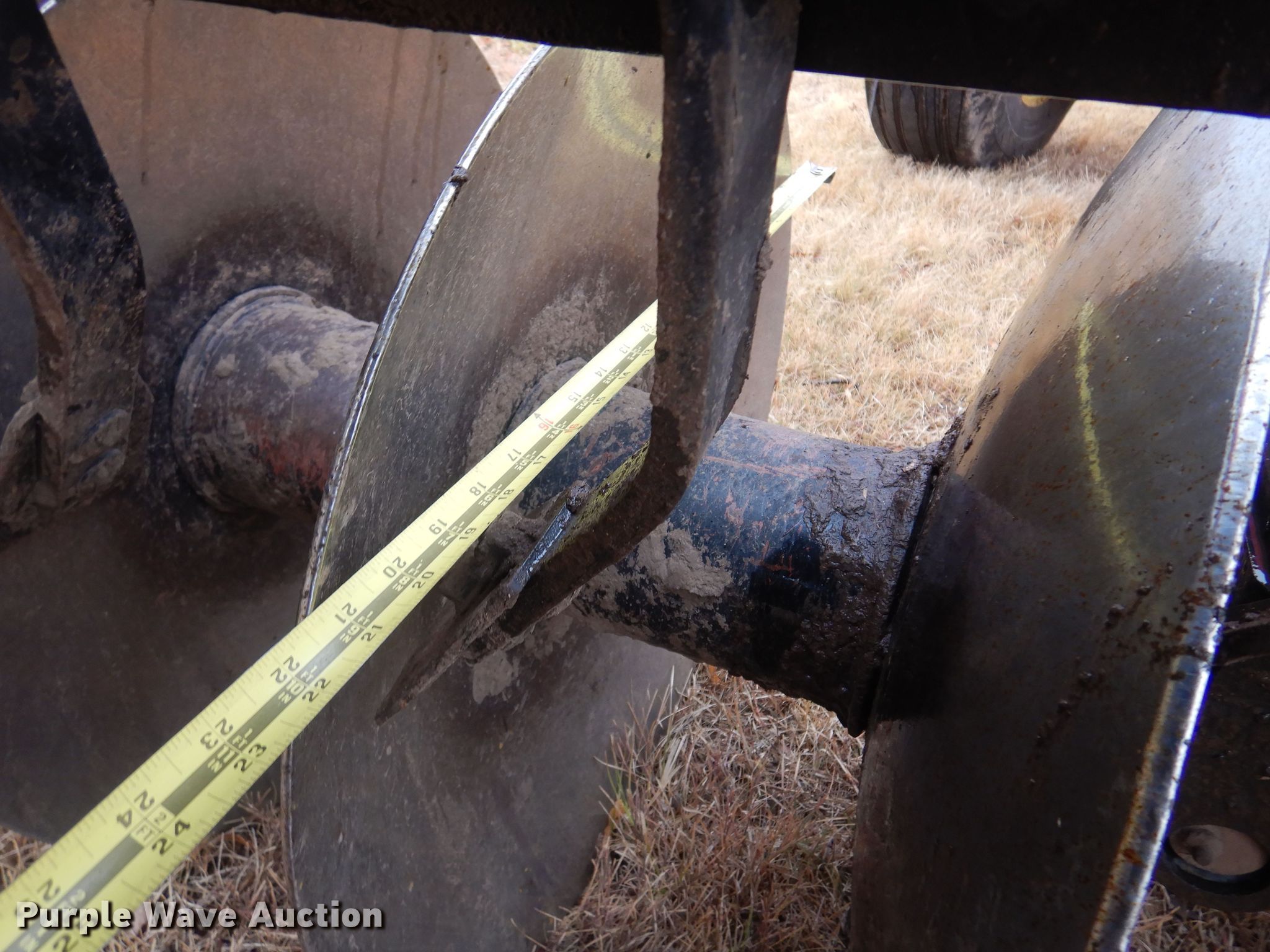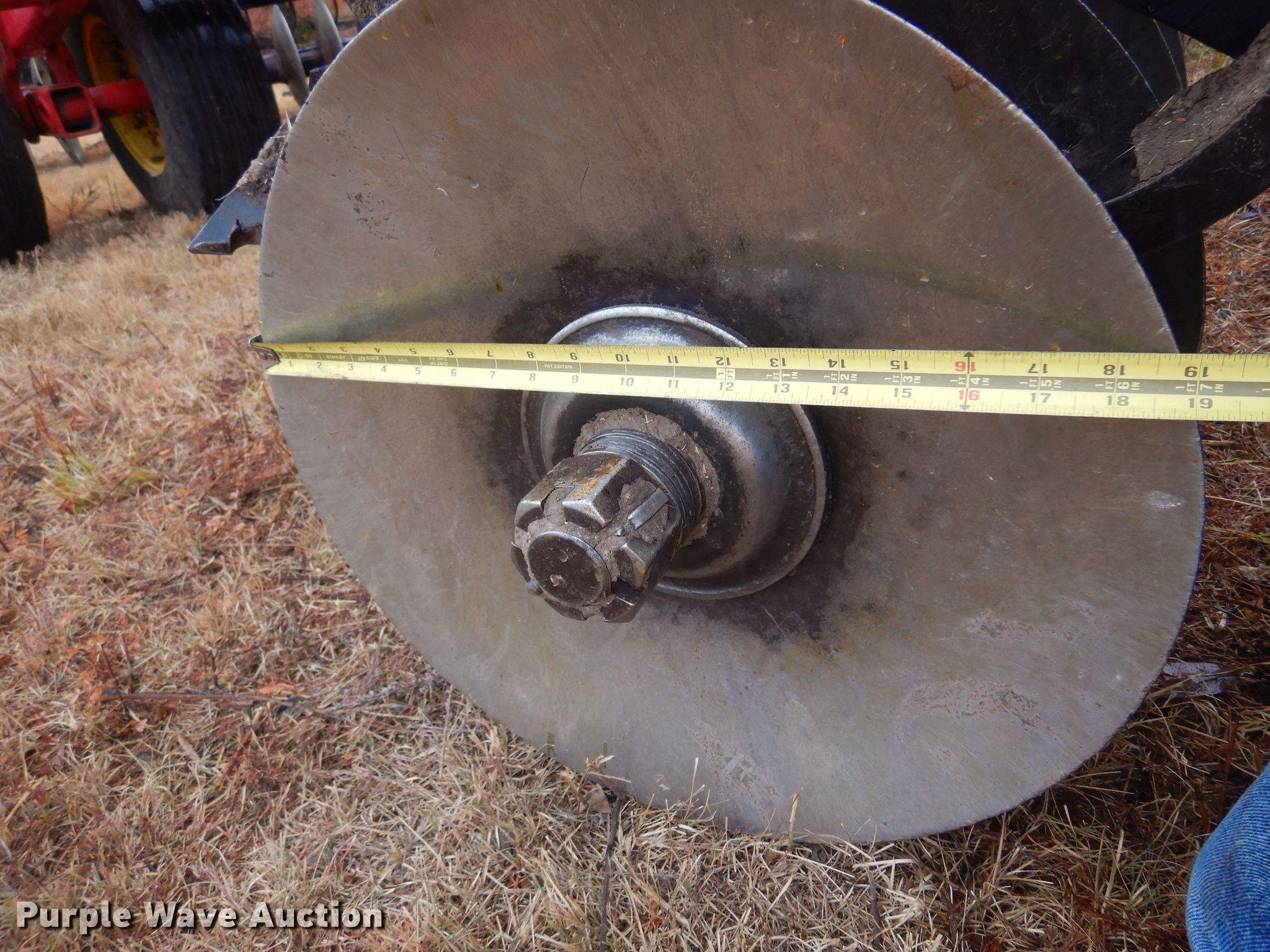 Sunflower 1435 double off-set disk. Overall width: 35', Serial: 1435E09344. Features Front blades Diameter: 19", Spacing: 8.5", Rear blades Diameter: 23", Spacing: 8.5", Disk scrapers, Operation Hydraulic lift, Hydraulic fold. Tires Tire size: 12.5-15. Julius Land and Cattle Co. Retirement Sale. Atlanta, KS 67008
