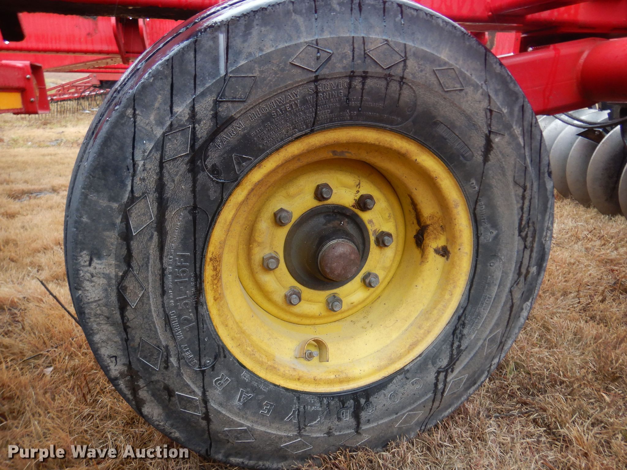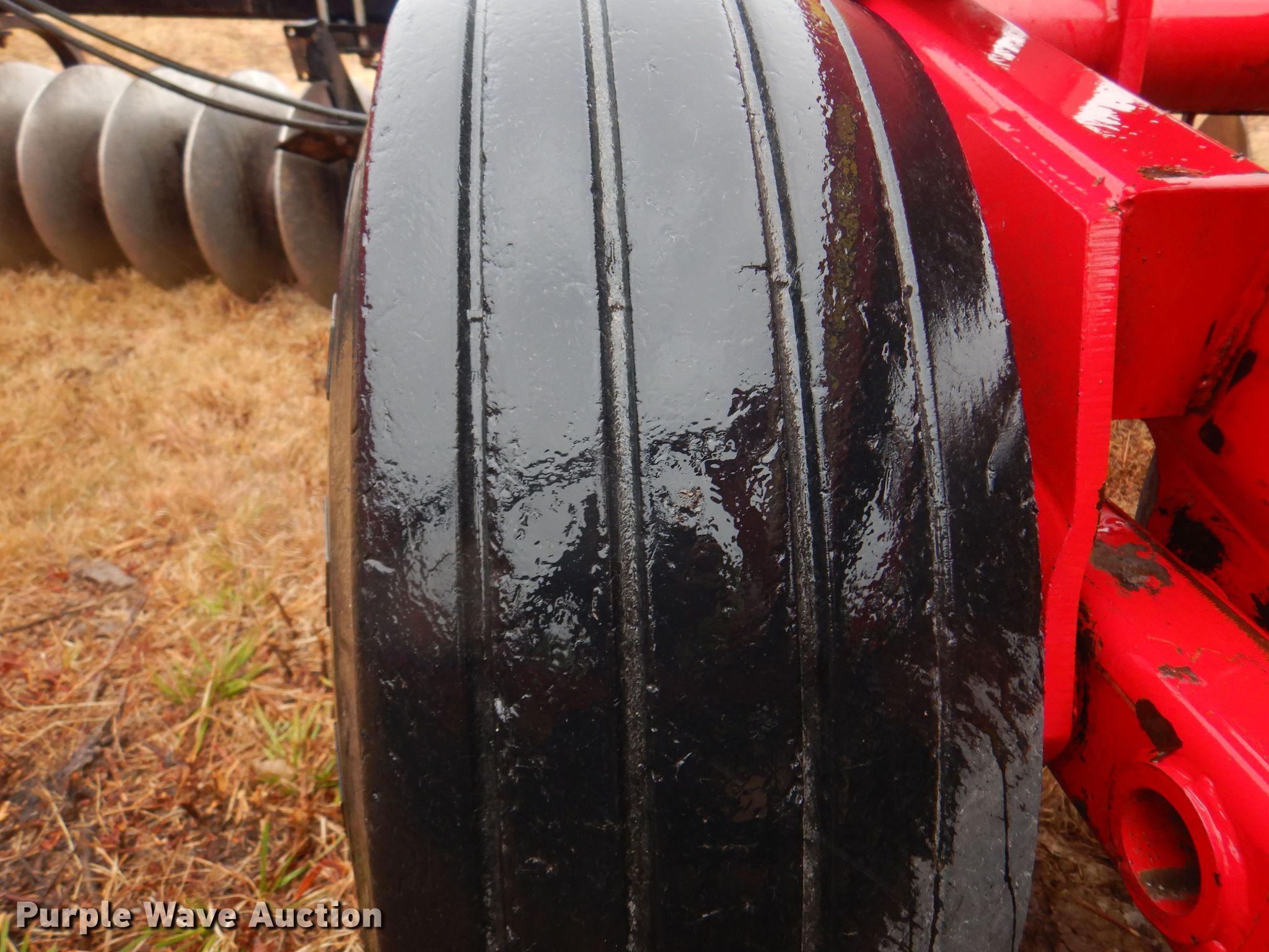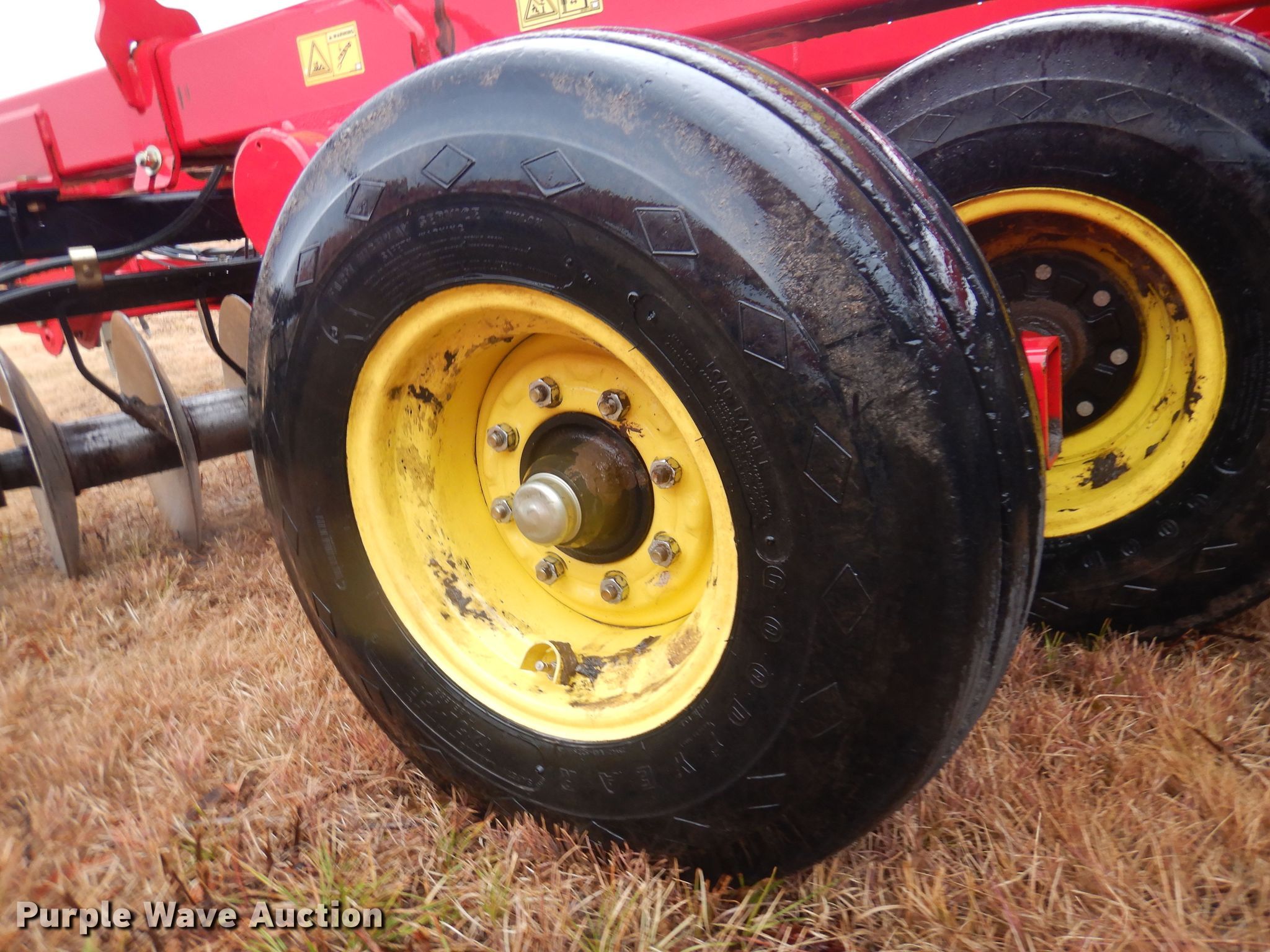 Sunflower 1435 double off-set disk. Overall width: 35', Serial: 1435E09344. Features Front blades Diameter: 19", Spacing: 8.5", Rear blades Diameter: 23", Spacing: 8.5", Disk scrapers, Operation Hydraulic lift, Hydraulic fold. Tires Tire size: 12.5-15. Julius Land and Cattle Co. Retirement Sale. Atlanta, KS 67008