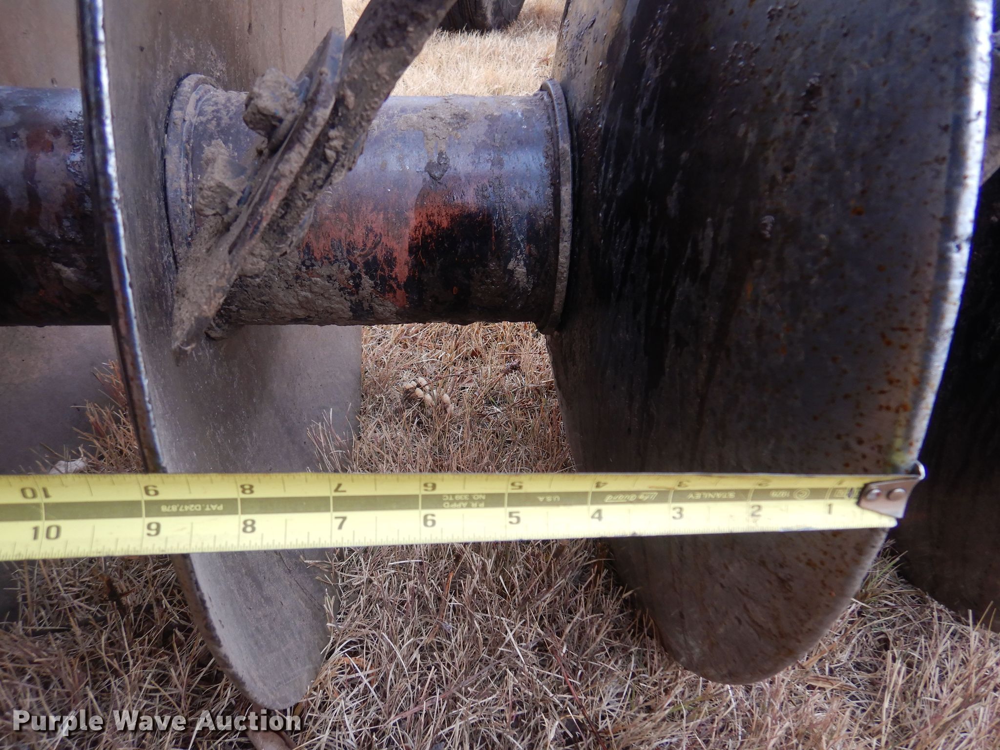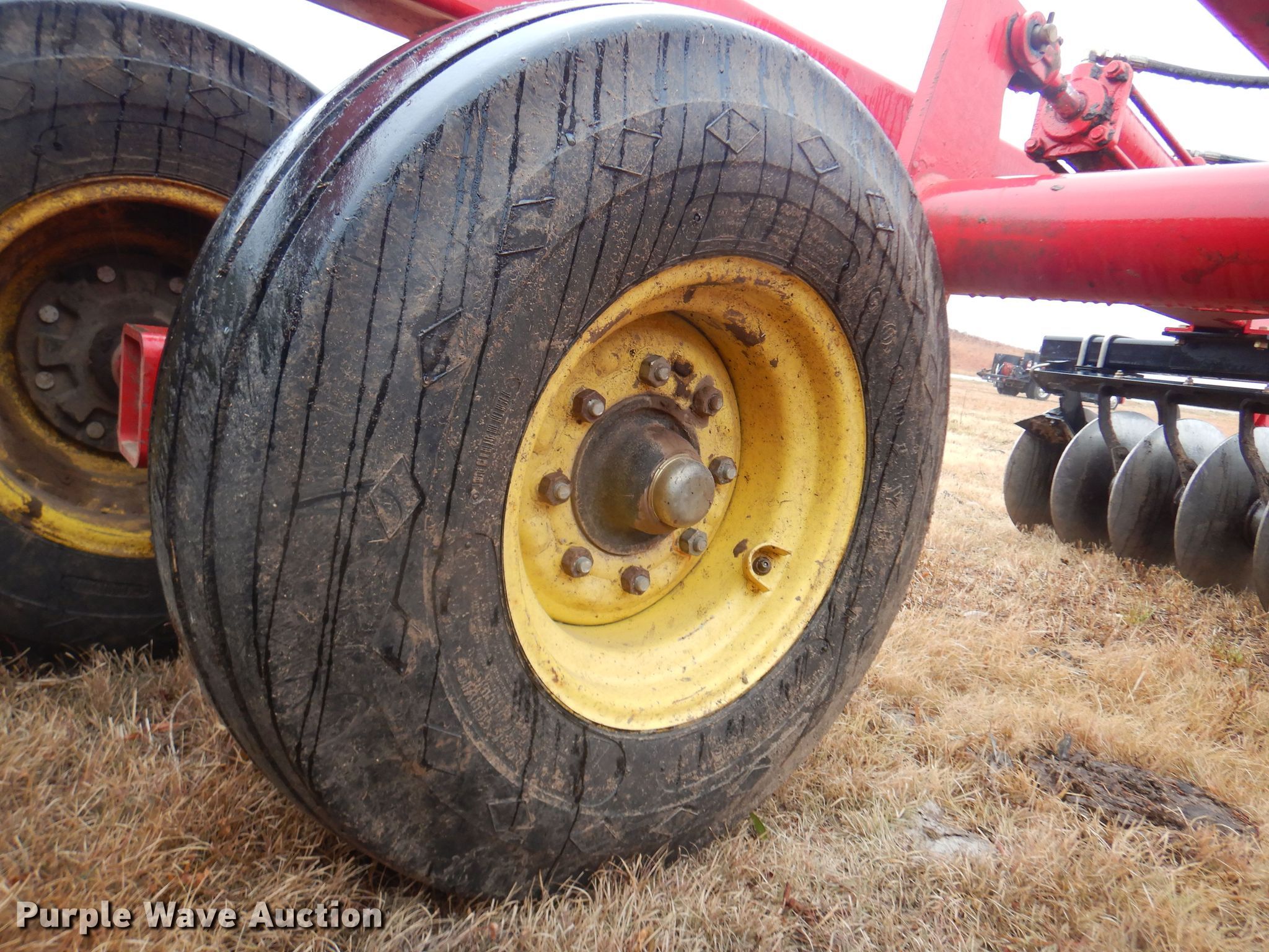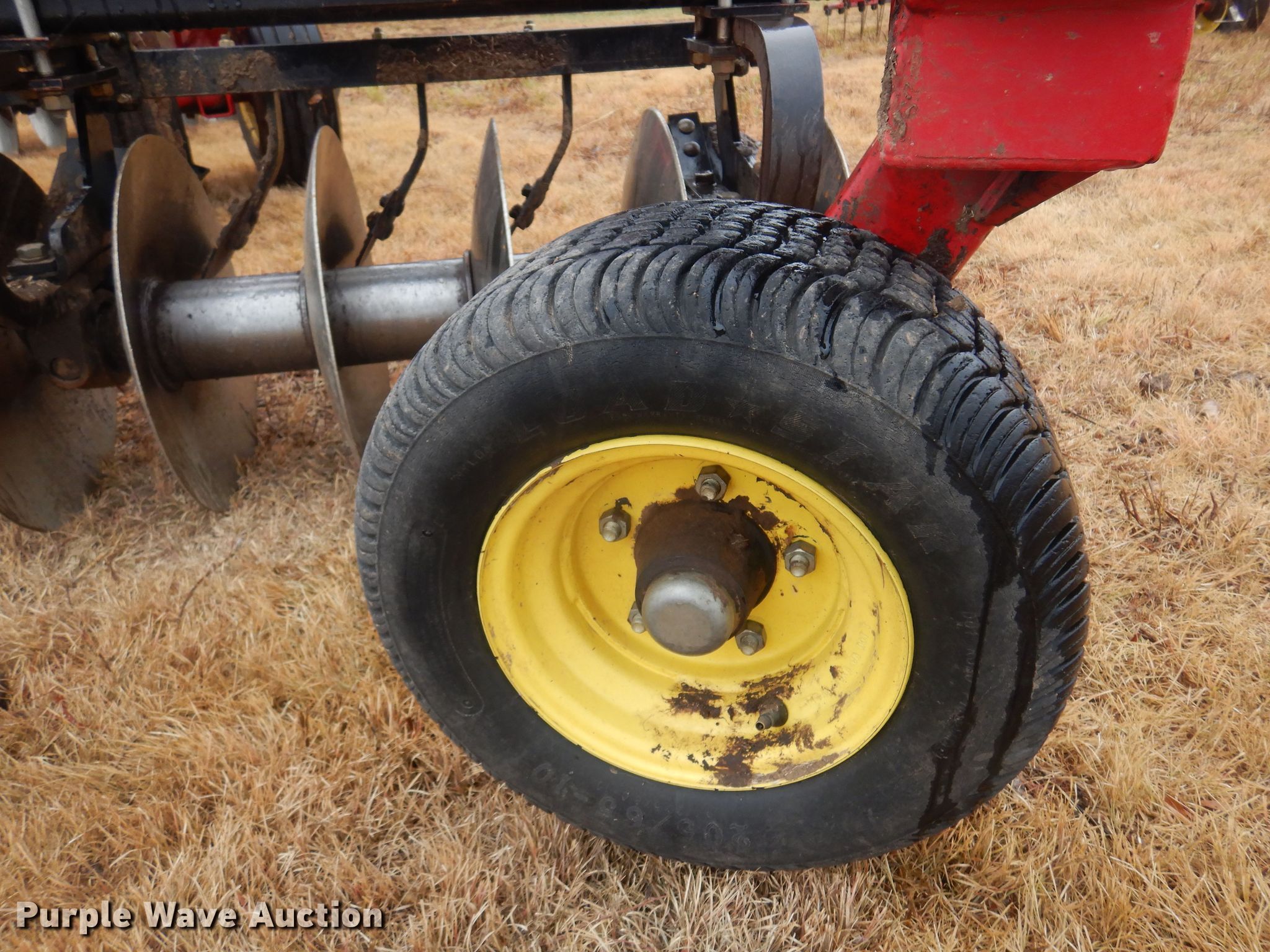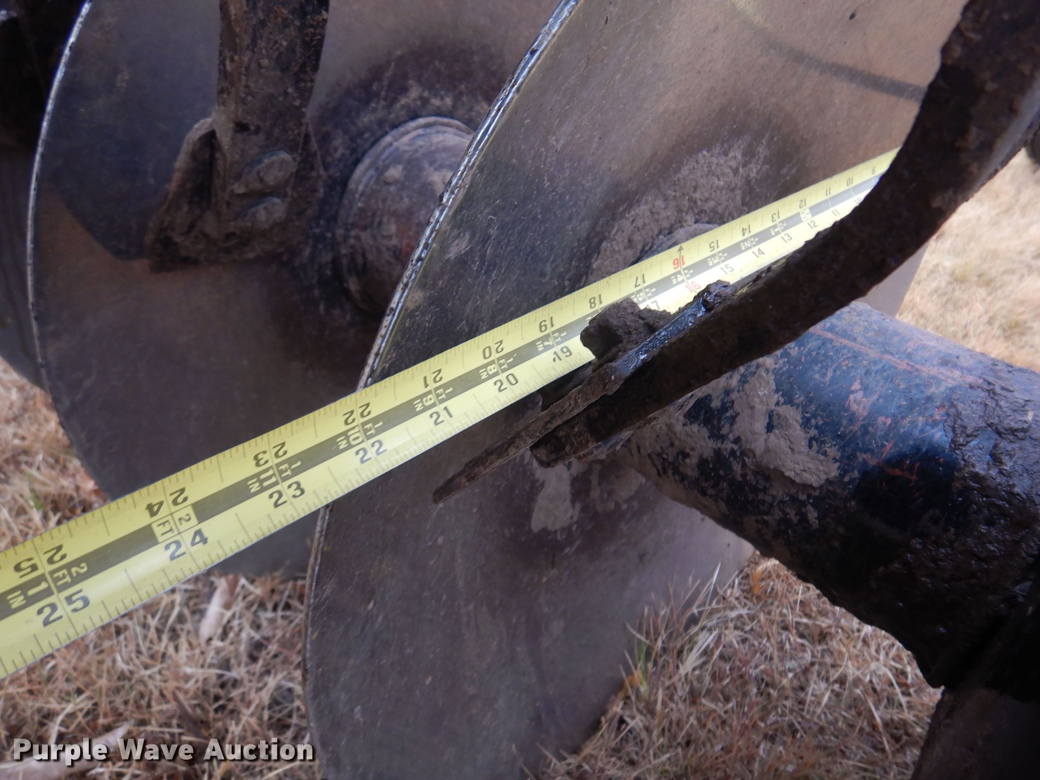 Sunflower 1435 double off-set disk. Overall width: 35', Serial: 1435E09344. Features Front blades Diameter: 19", Spacing: 8.5", Rear blades Diameter: 23", Spacing: 8.5", Disk scrapers, Operation Hydraulic lift, Hydraulic fold. Tires Tire size: 12.5-15. Julius Land and Cattle Co. Retirement Sale. Atlanta, KS 67008