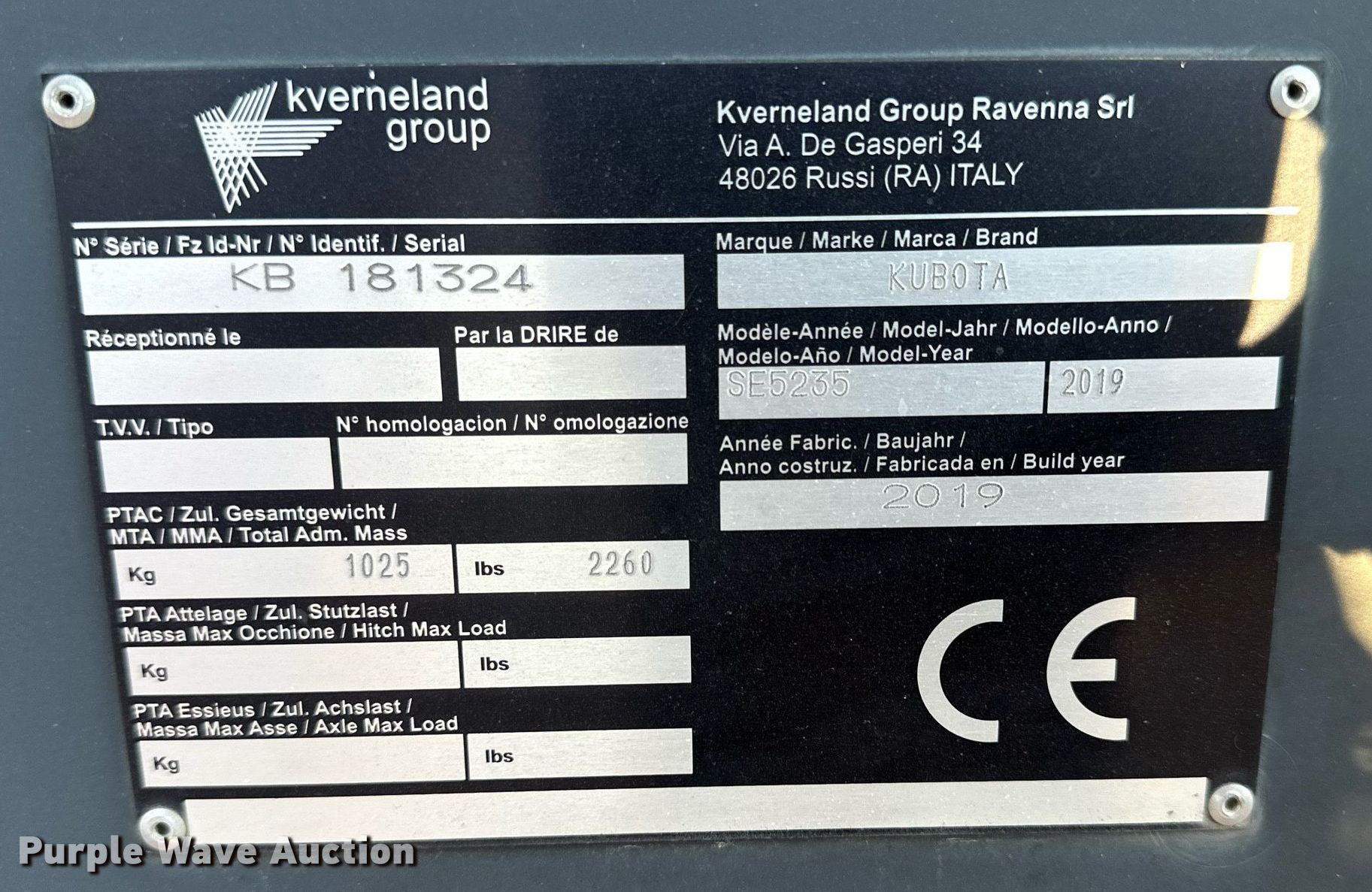 Purple Wave is selling a used Mower, Cutter, Shredder in Kansas. This item is a 2019 Kubota SE5235 flail mower with the following: Serial: KB181324, Width: 90", Hitch: Three point, PTO: 540