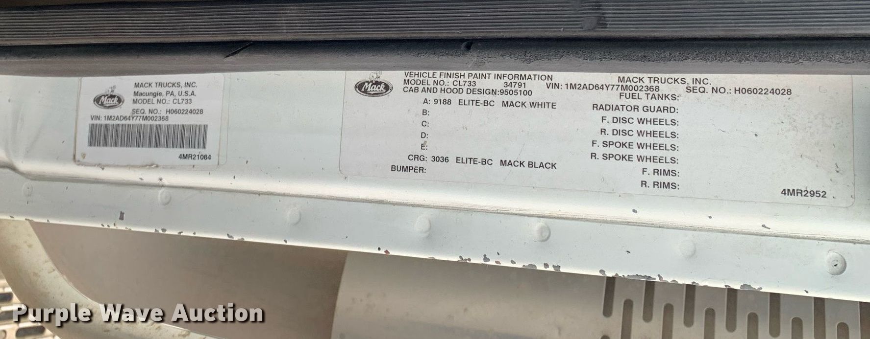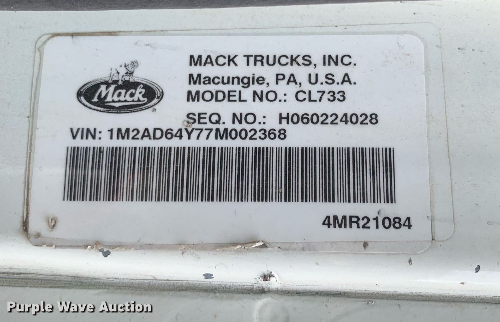 Purple Wave is selling a used Truck Tractor in Texas. This item is a 2007 Mack CL733 semi truck with the following: Miles: 982,775 on odometer, Hours: 33,263 on meter, Miles or hours may vary, unit still in use, VIN: 1M2AD64Y77M002368