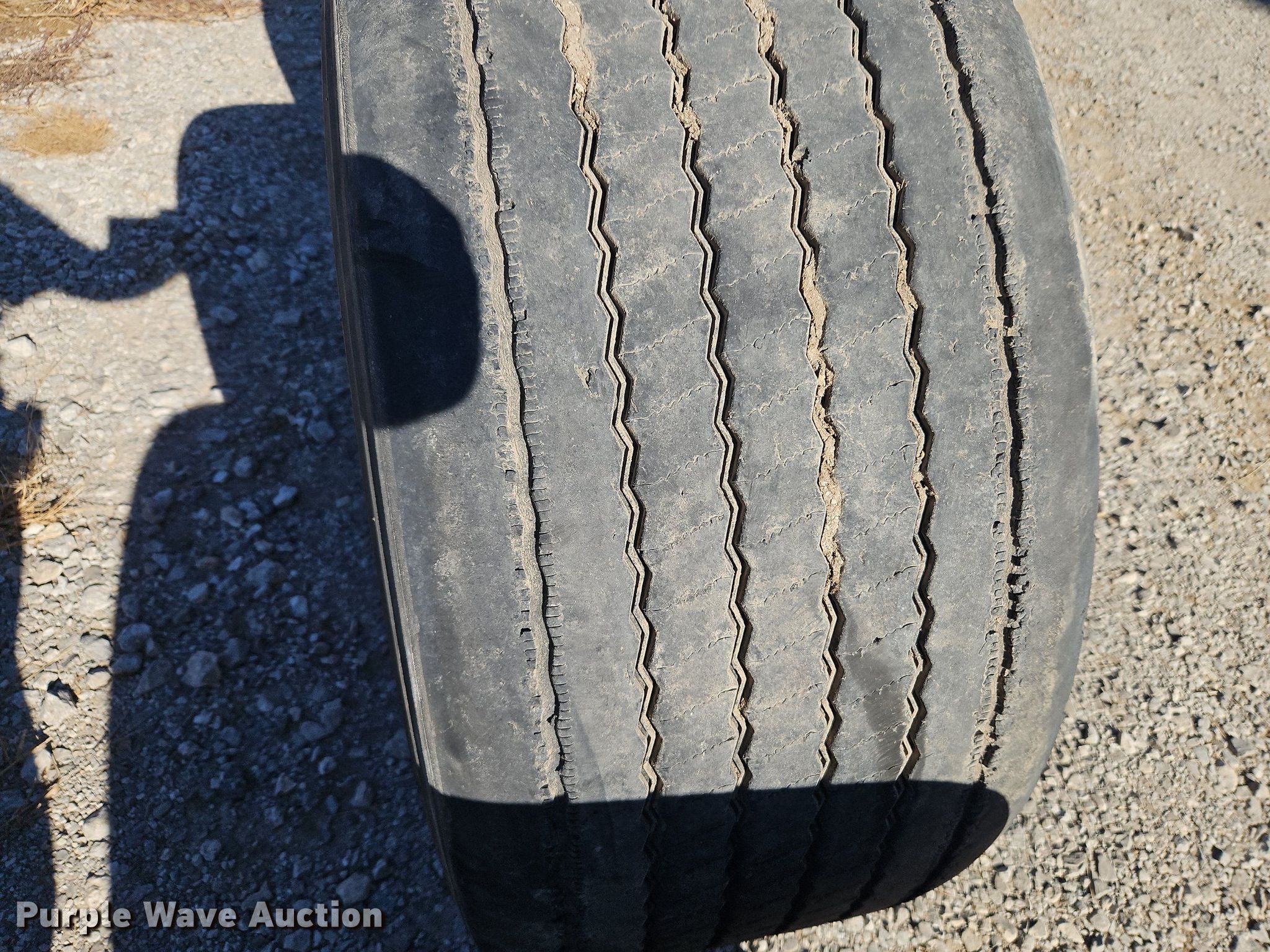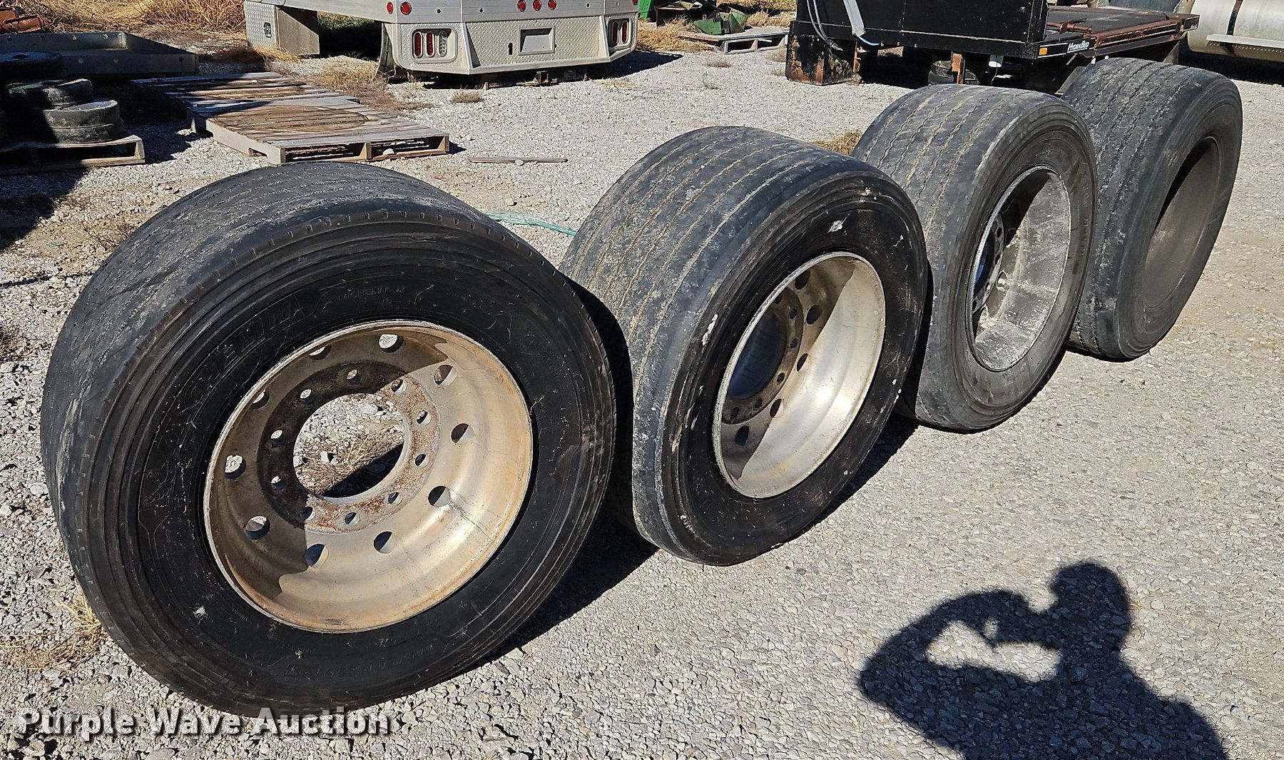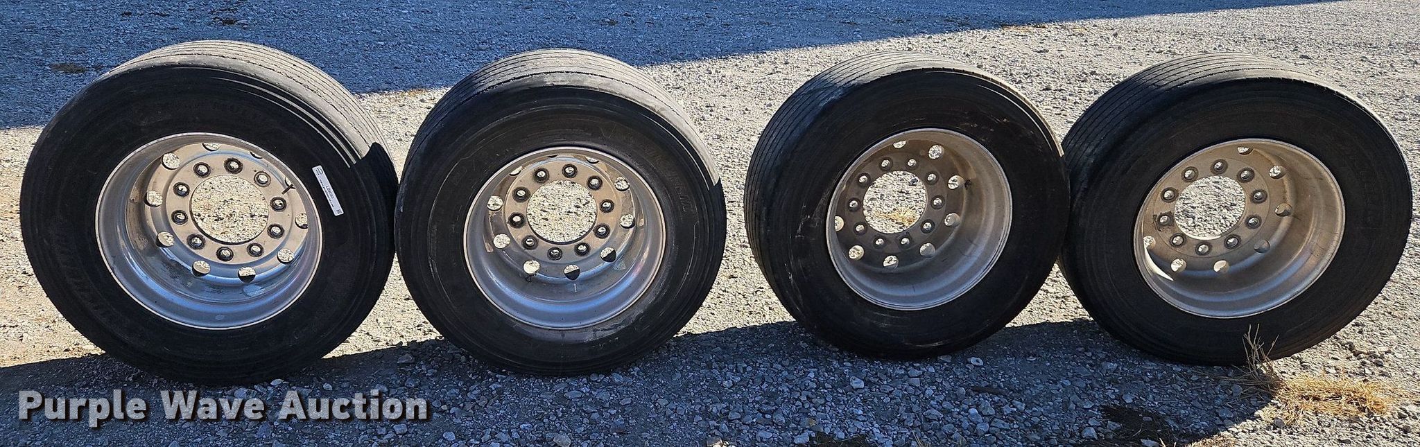 Purple Wave is selling a used Fleet Tires in Kansas. This item is a (4) Michelin X One tires and wheels with the following: Size: 445/50R22.5, Aluminum wheels