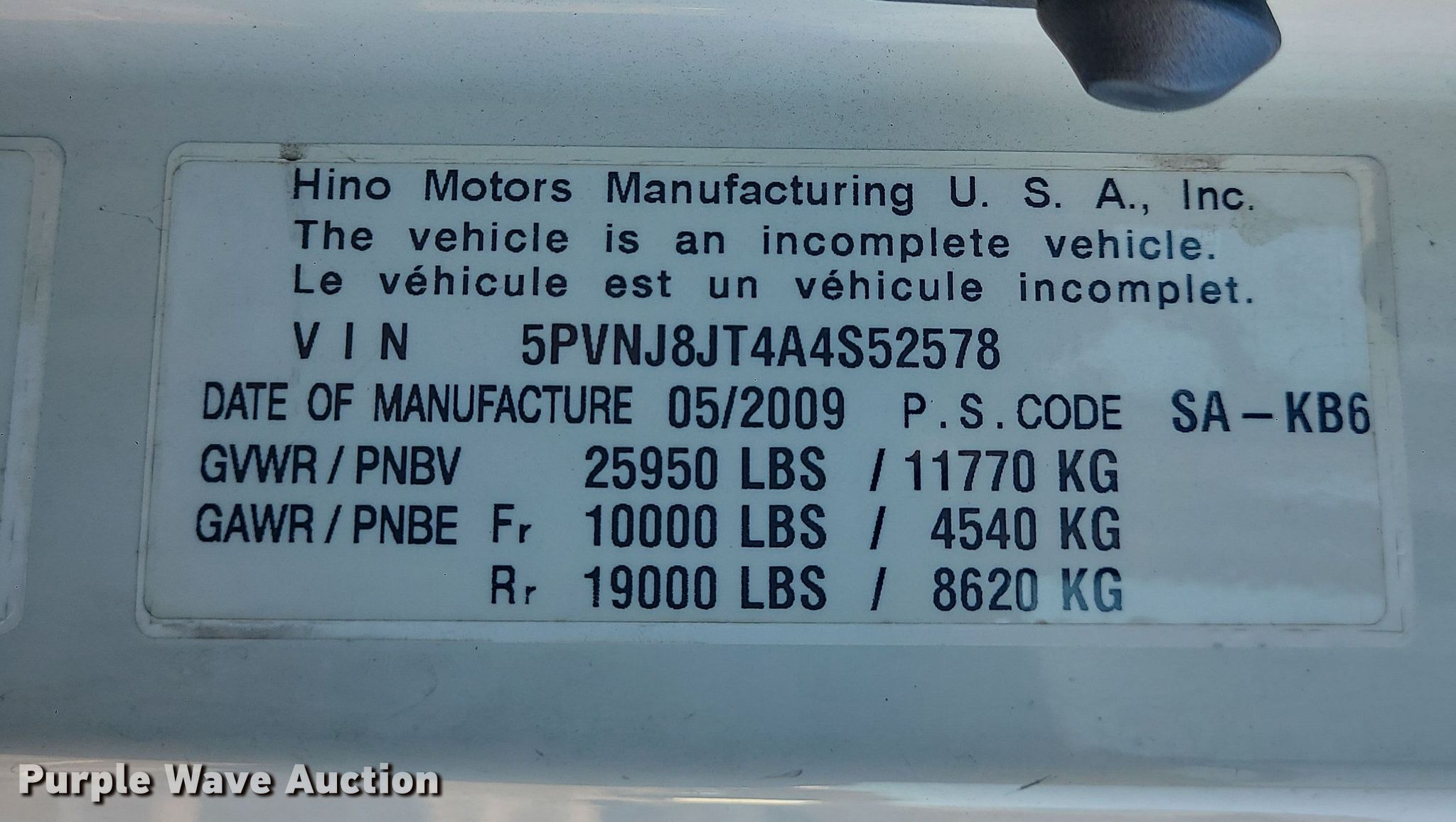 2010 Hino 268 box truck. Miles: 318,143 on odometer, VIN: 5PVNJ8JT4A4S52578. Engine Hino J08E-TV, Displacement: 7.6L, Cylinders: 6, Fuel type: Diesel, HP: 260. Transmission Automatic. Chassis Axles: Single, Suspension: Spring, Brakes: Air, GVWR: 25,980 lbs. Interior AC, Heat, Power windows, Power locks, Cruise control. Features Box bed Morgan , 26' L x 102" W x 96" H, Floor: Wood, End gate lift Palfinger.. Tires Size: 11R22.5. Notes Dash warning indicator: Check engine, Engine needs replaced, Pallet jack not included, Non-operational unit. Unit will need towed or hauled. Missouri title. Title distribution may be delayed up to 14 days from verification of funds. Crane Logistics LLC. 3220 U.S. 40. Blue Springs, MO 64015