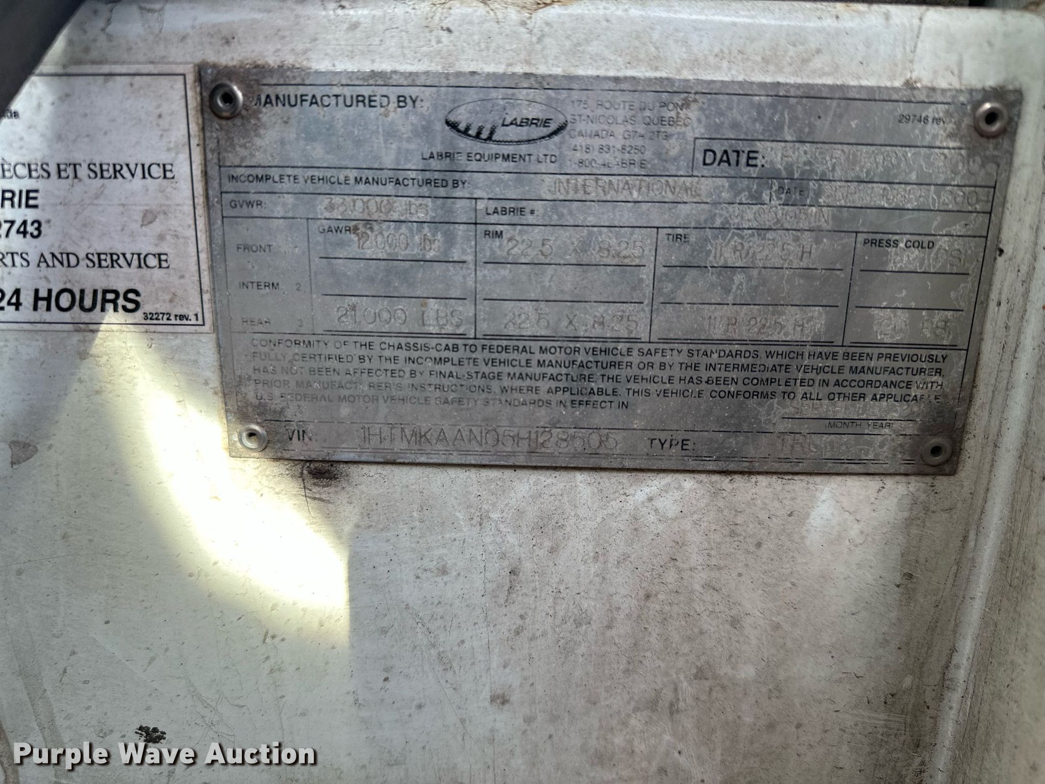 2005 International 4400 refuse truck. Miles: 148,217 on odometer, Hours: 19,640 on meter, VIN: 1HTMKAAN05H128505, Unit #: 29W. Engine International DT466, Cylinders: 6, Fuel type: Diesel, HP: 285. Transmission Allison 3500RDS, Automatic. Chassis Axles: Single, Suspension: Air, Brakes: Air, PTO, GVWR: 33,000 lbs. Interior AC, Heat, Heated mirrors, Cruise control, Backup camera. Features Refuse bed Labrie Expert 2000, Serial: CLO5105IIN, Capacity: 22 cu.yd., Load: Side, Cart tipper. Tires Size: 11R-22.5. Notes Dash warning indicator: ABS. Minnesota title. Title distribution may be delayed up to 14 days from verification of funds. Hartels Disposal. 930 U.S. Route 2. Proctor, MN 55810