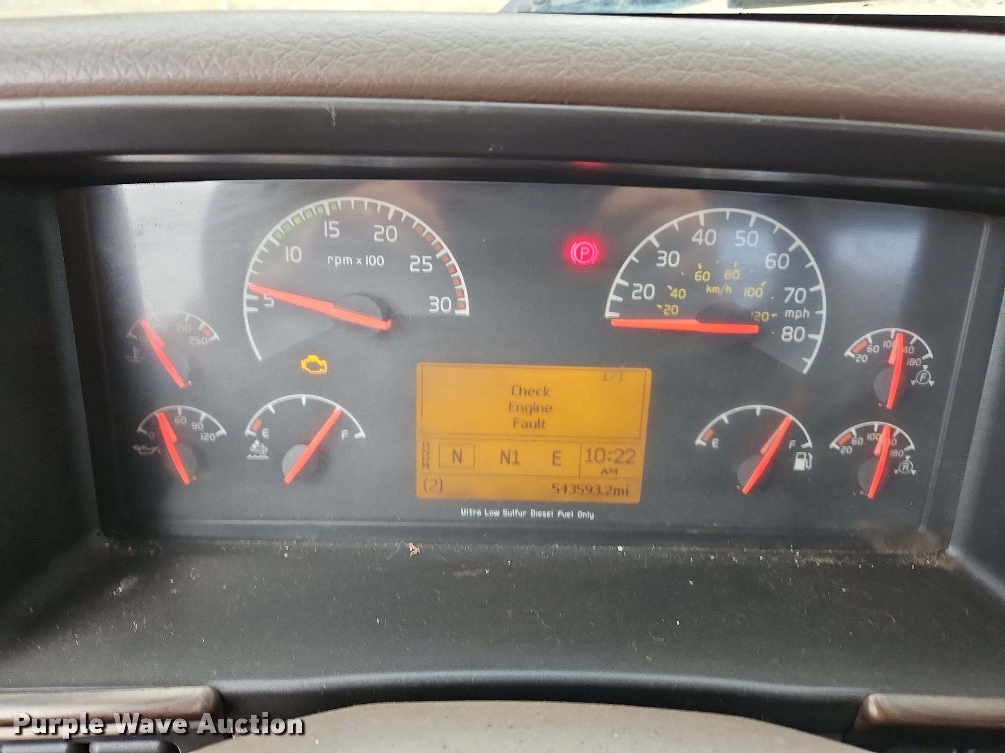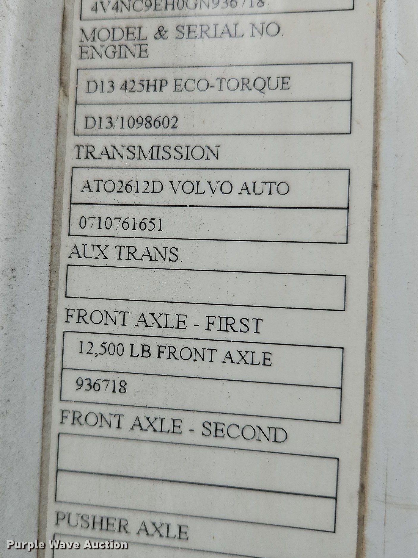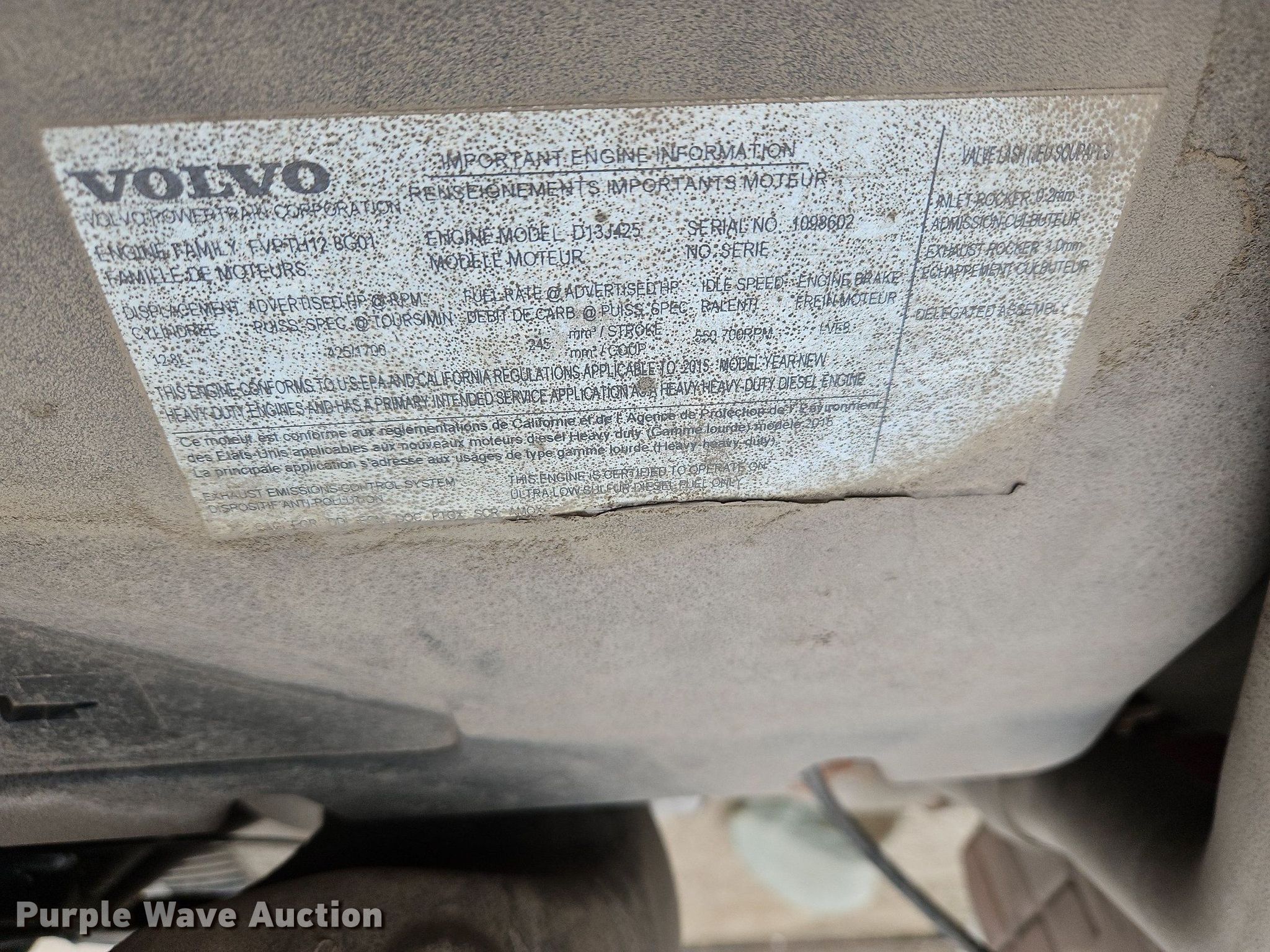 2016 Volvo VNL semi truck. Miles: 543,593 on odometer, VIN: 4V4NC9EH0GN936718, Unit #: 172. Engine Volvo D13, Displacement: 12.8L, Cylinders: 6, Fuel type: Diesel, HP: 425. Transmission Volvo ATO2612D, Automated manual. Chassis Axles: Tandem, Differential lock: Inter-axle, Suspension: Air, Brakes: Air. Interior AC, Heat, Cruise control. Features Deck plate: Aluminum, Fifth wheel type: Air operated, Sliding, Fuel tank: Dual. Tires Size: 295/75R22.5. Notes Dash warning indicator: Check engine, Windshield chipped or cracked, Fifth wheel plate missing. Michigan title. Title distribution may be delayed up to 14 days from verification of funds. 48649 Schooner Dr. Van Buren Township, MI 48111