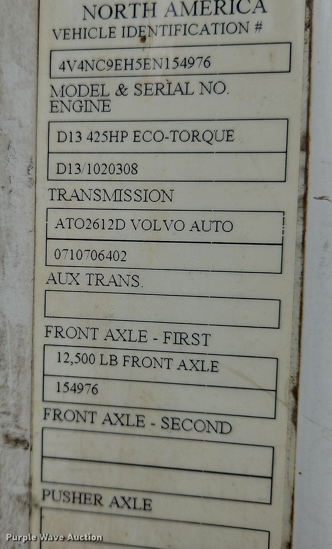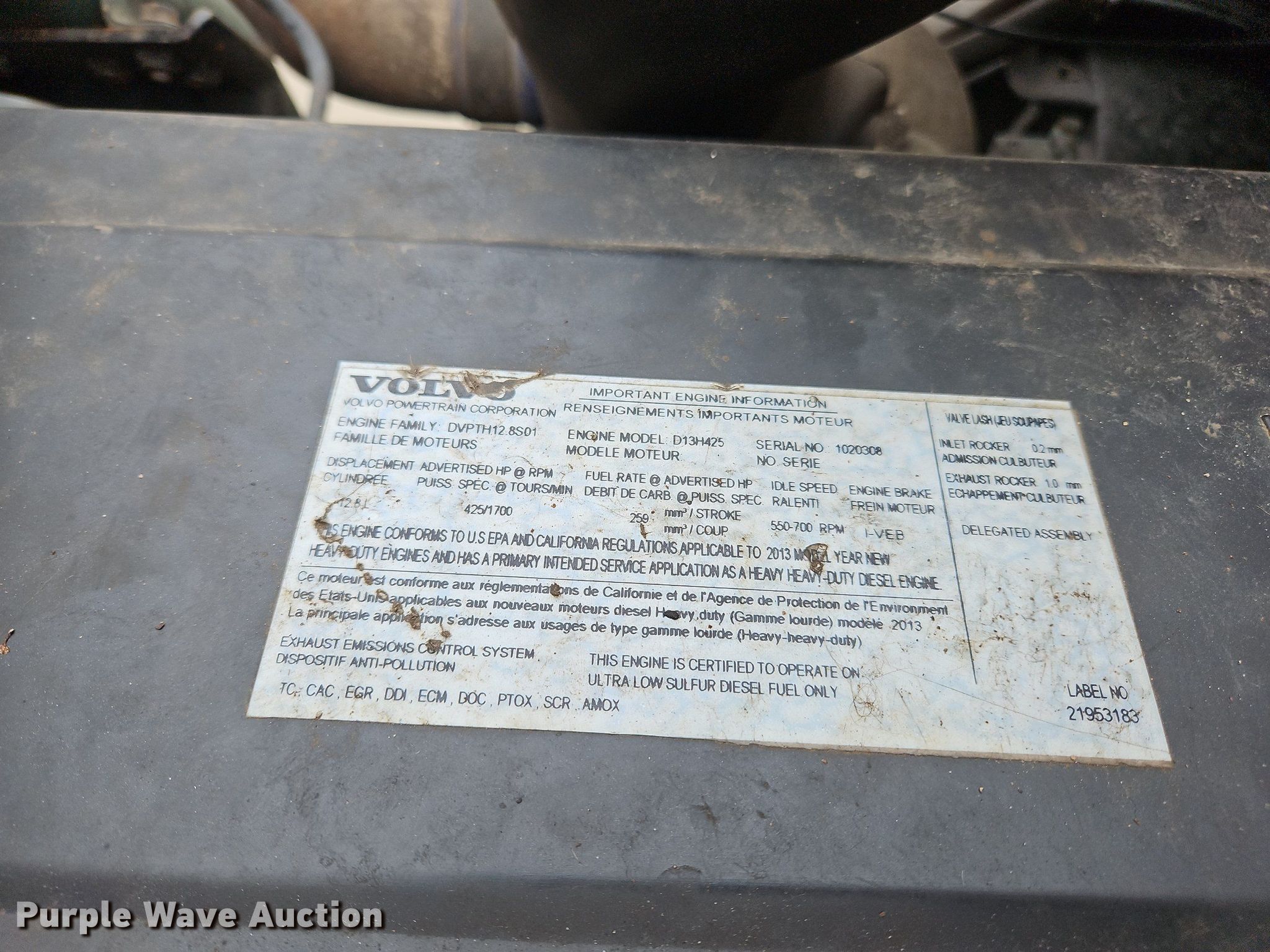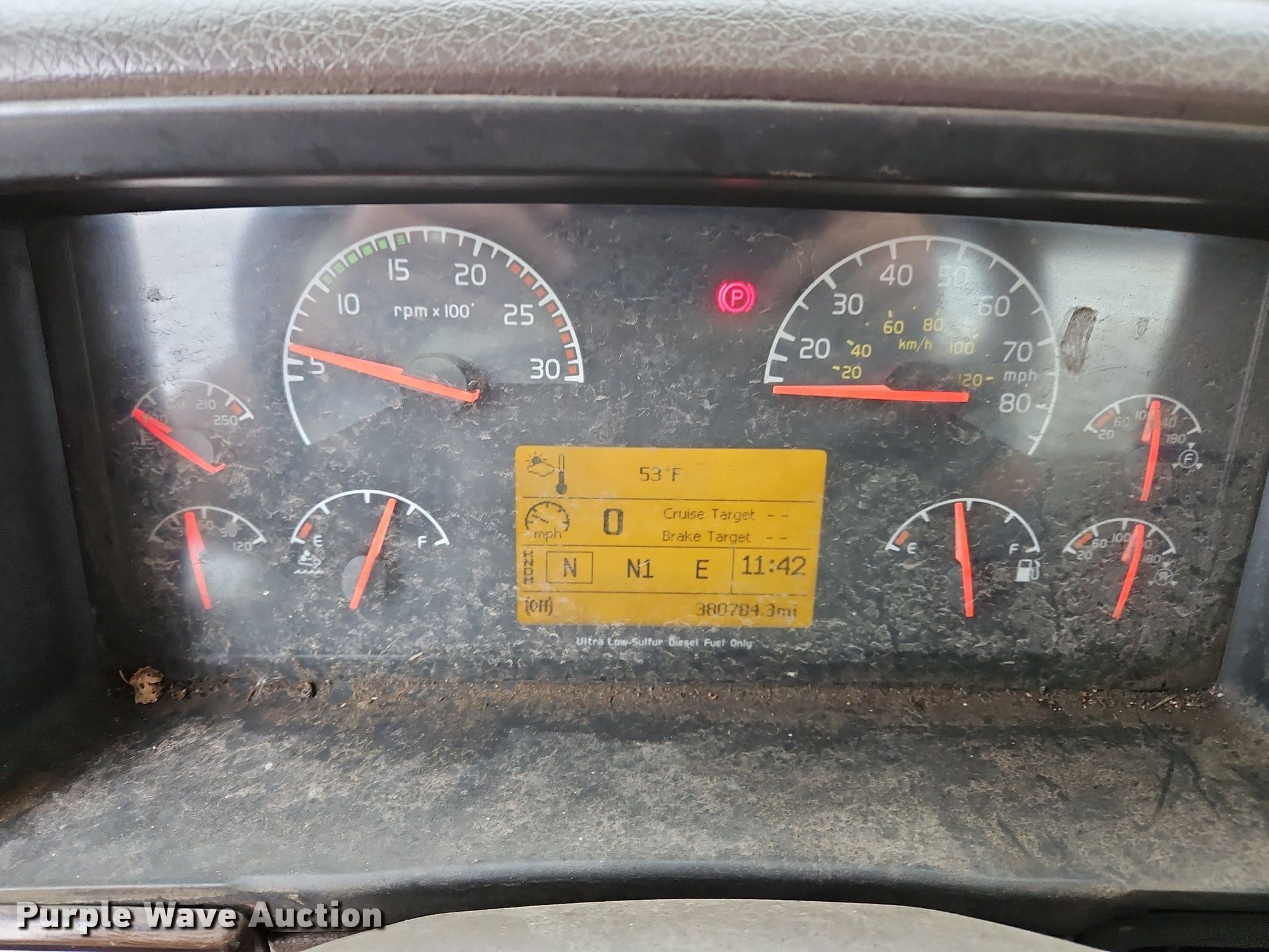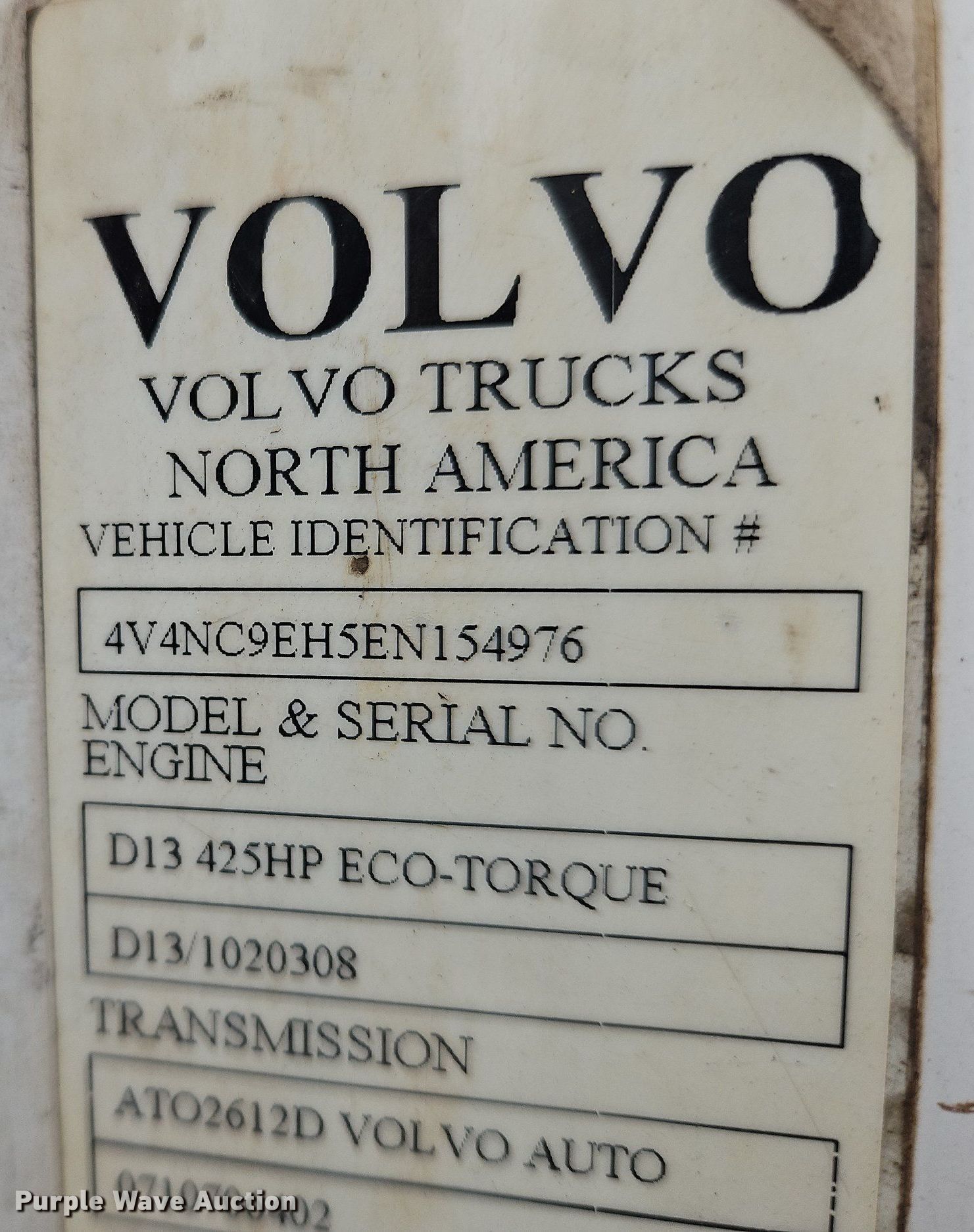 2014 Volvo VNL semi truck. Miles: 380,784 on odometer, VIN: 4V4NC9EH5EN154976, Unit #: 157. Engine Volvo D13, Displacement: 12.8L, Cylinders: 6, Fuel type: Diesel, HP: 425. Transmission Vovlo ATO2612D, Automated manual. Chassis Axles: Tandem, Differential lock: Inter-axle, Suspension: Air, Brakes: Air. Interior AC, Heat, Cruise control, Air ride cab. Features Deck plate: Aluminum, Fifth wheel type: Air operated, Sliding, Fuel tank: Dual. Tires Size: 295/75R22.5. Notes Dash warning indicator: Check engine. Michigan title. Title distribution may be delayed up to 14 days from verification of funds. 48649 Schooner Dr. Van Buren Township, MI 48111