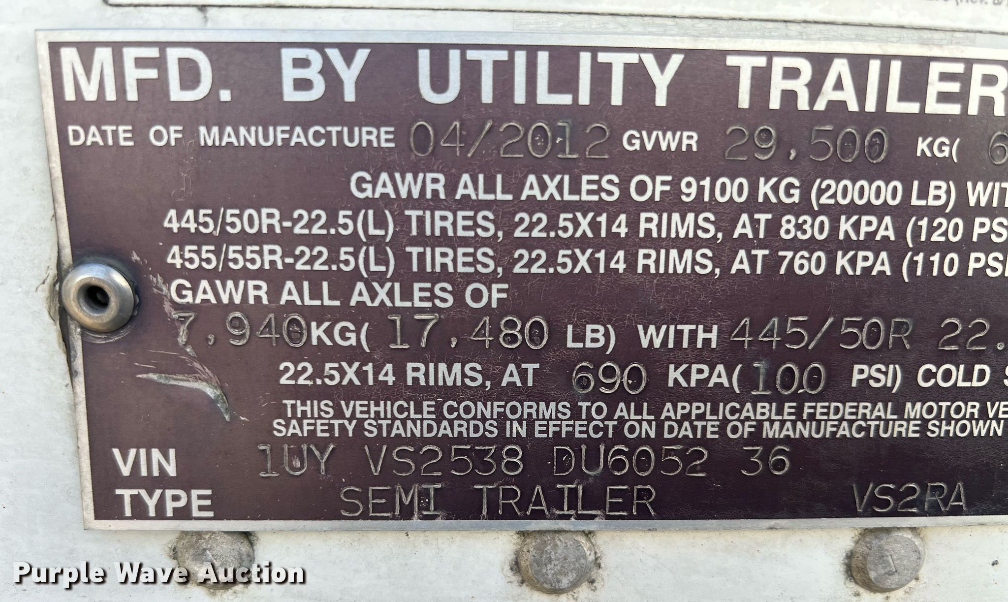 2013 Utility refrigerated van trailer. VIN: 1UYVS2538DU605236. Dimensions Overall: 53' L x 102" W. Features Deck type: Aluminum, Refrigeration unit Carrier X2 100 Advance. Chassis Landing gear: Dual, Suspension: Air, Brakes: Air, Axles: Tandem, Sliding, GVWR: 65,000 lbs. Tires Aluminum wheels, Size: 445/50R22.5. Kansas title. Title distribution may be delayed up to 14 days from verification of funds. JJT Logistics LLC. 2333 165th Rd. Wathena, KS 66090