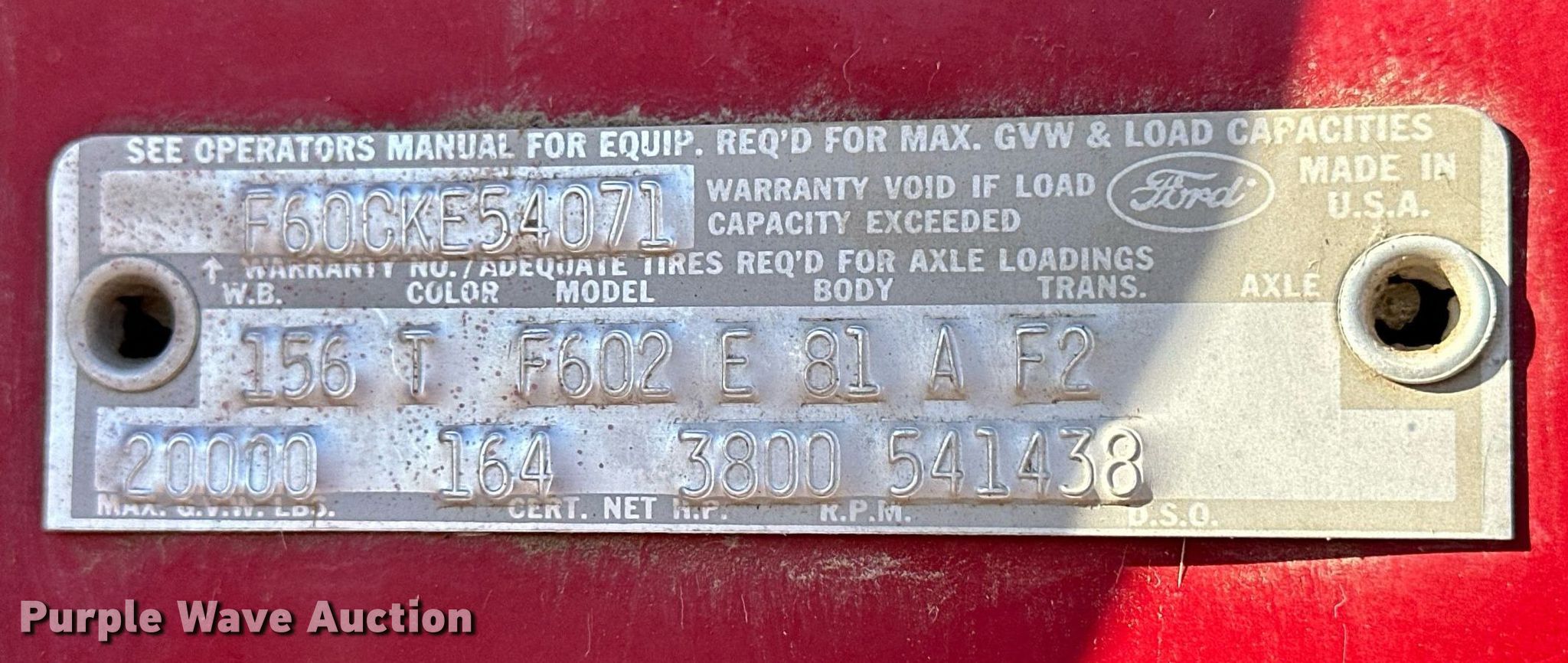 Purple Wave is selling a used Grain Truck in Nebraska. This item is a 1969 Ford F600 grain truck with the following: Miles: 93,033 on odometer, VIN: F60CKE54071
