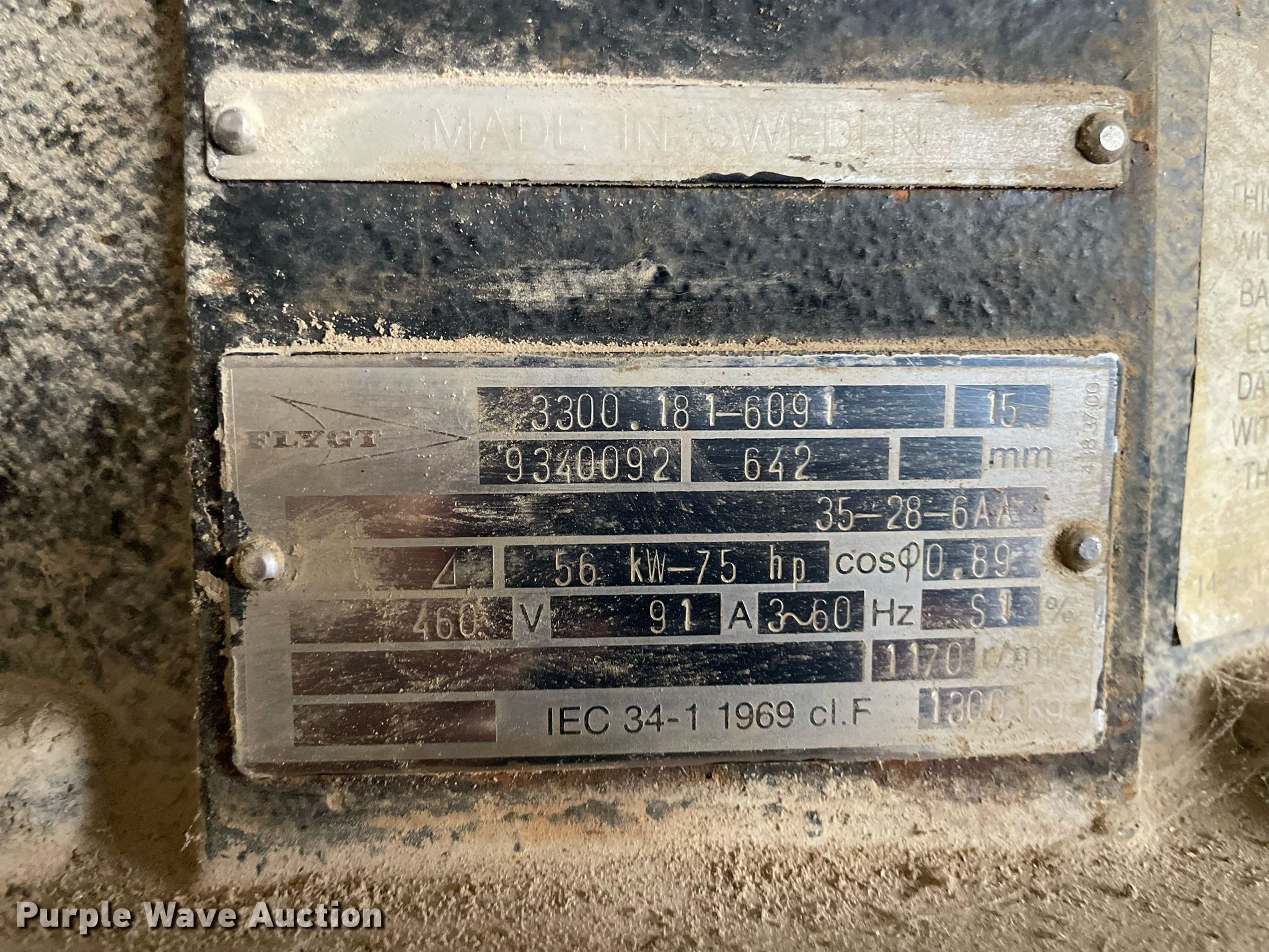 Purple Wave is selling a used Pump in Kansas. This item is a Flygt water pump with the following: Phase: Three, Hp: 75, Kw: 56, Volts: 460, Check valve, Control panel