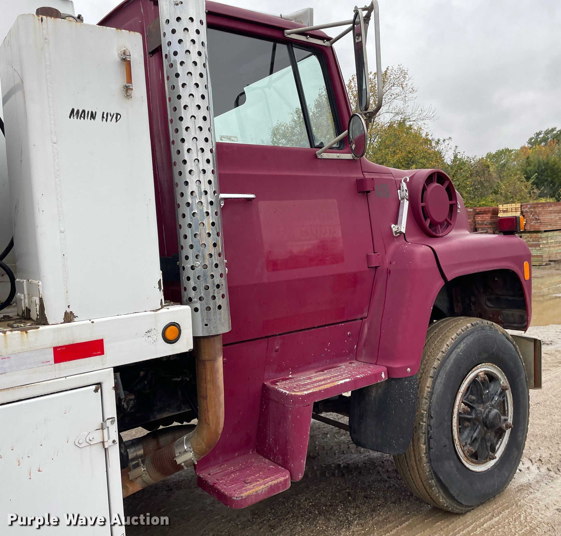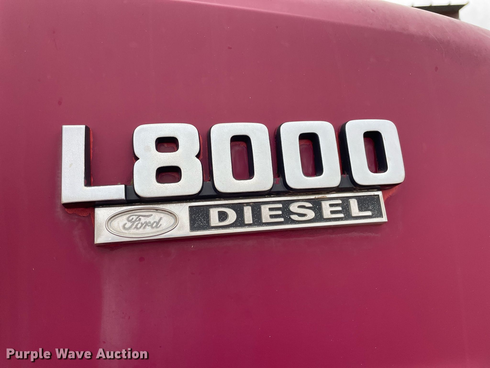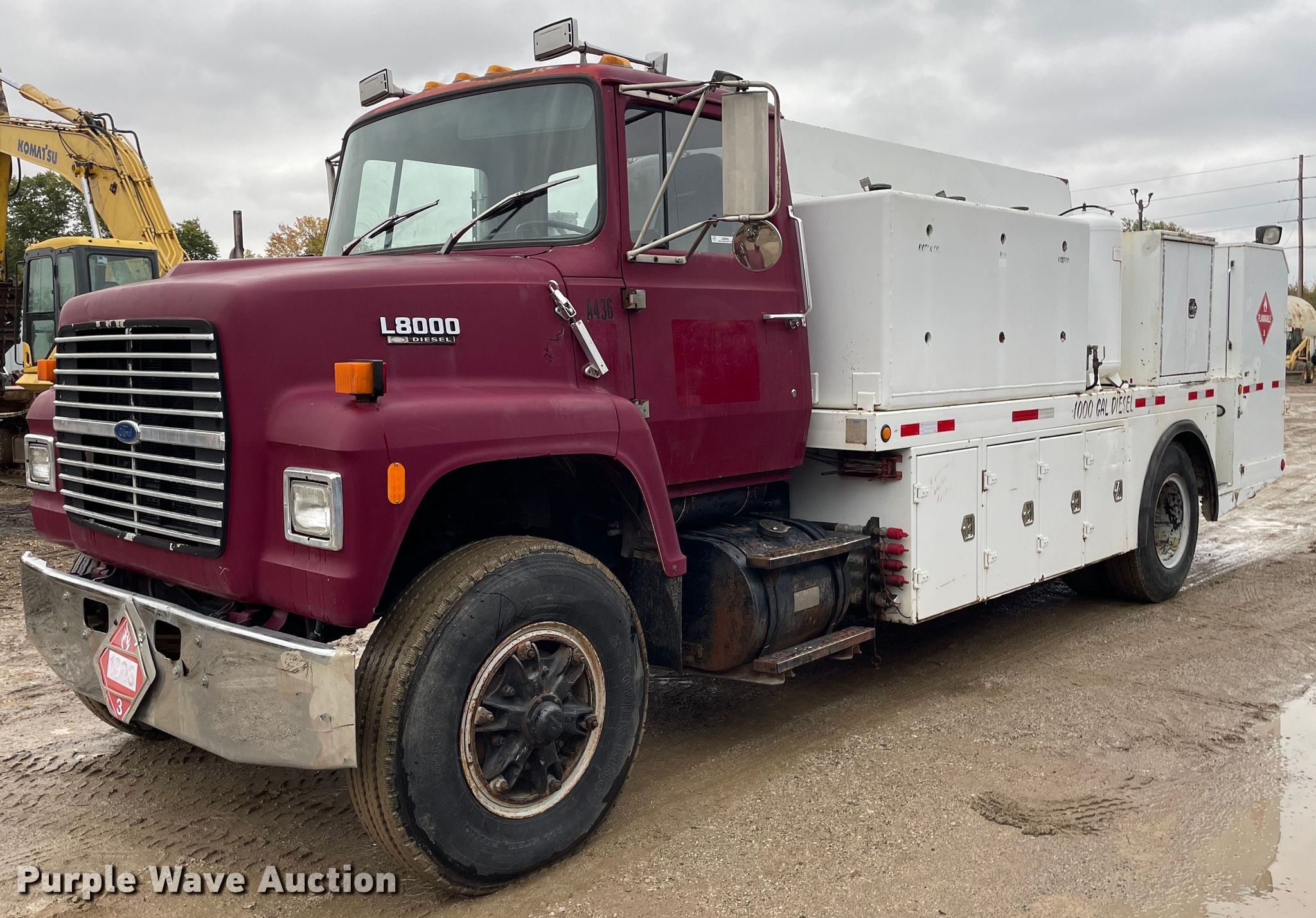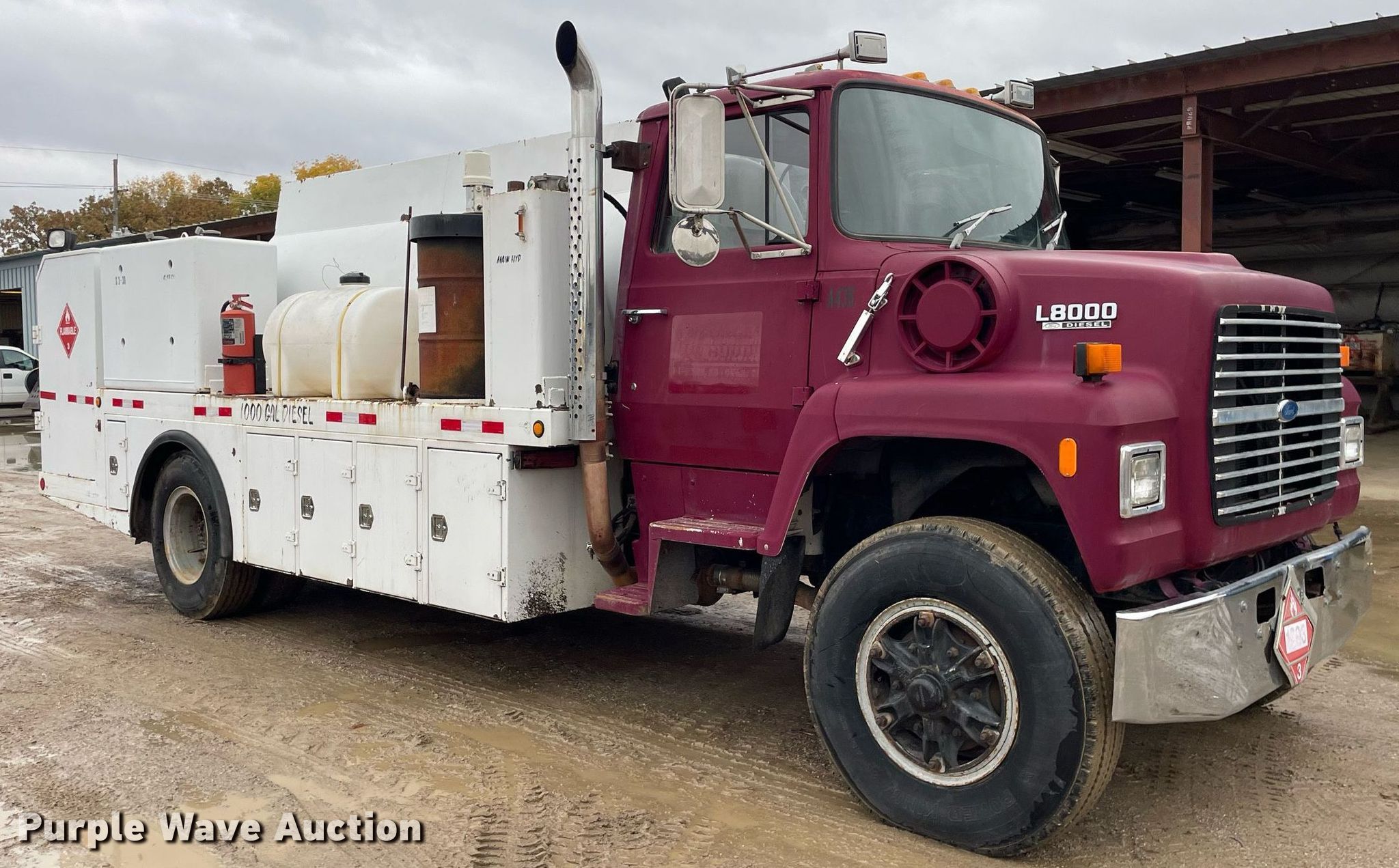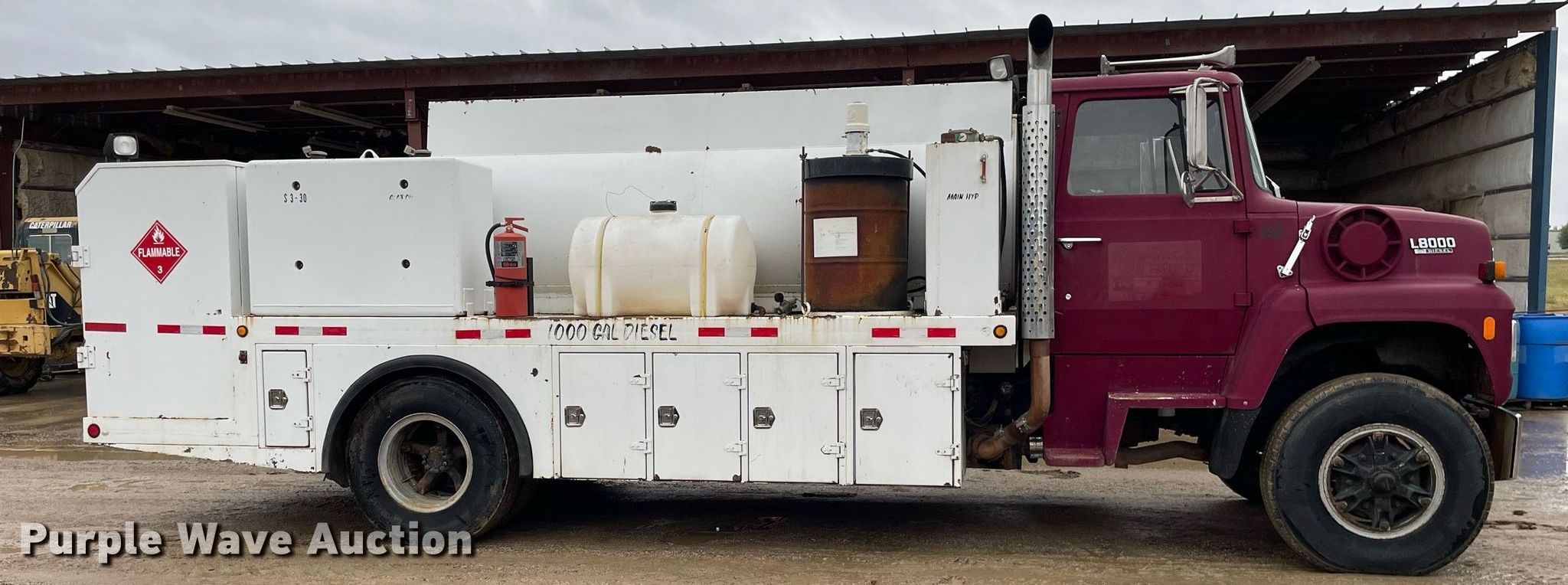 1990 Ford L8000 fuel / lube truck. Miles: 16,178 on odometer, VIN: 1FDXR82A1LVA09530, Unit #: A-436. Engine Displacement: 7.8L, Cylinders: 6, Fuel type: Diesel. Transmission Manual, Speed: 5, plus 2. Chassis Axles: Single, Suspension: Spring, Brakes: Air, PTO, GVWR: 29,000 lbs. Interior Heat. Features Bed / tank Southwestern Products, 18' 3" L x 96" W, Compartments: 1, Hose reels: 8, Nozzles, Metered pumps: 1, Oil/lube reservoirs Hydraulic fluid, Grease, Motor oil, Used oil, Glendale Welding diesel tank Capacity: 1000 gallon, Air compressor. Tires Front: 11.00R20, Rear: 10.00R20. Kansas title. Title distribution may be delayed up to 14 days from verification of funds. LaForge & Budd Construction Retirement - Open Inspection December 6 - Sales tax exempt. 2020 North 21st Street. Parsons, KS 67357