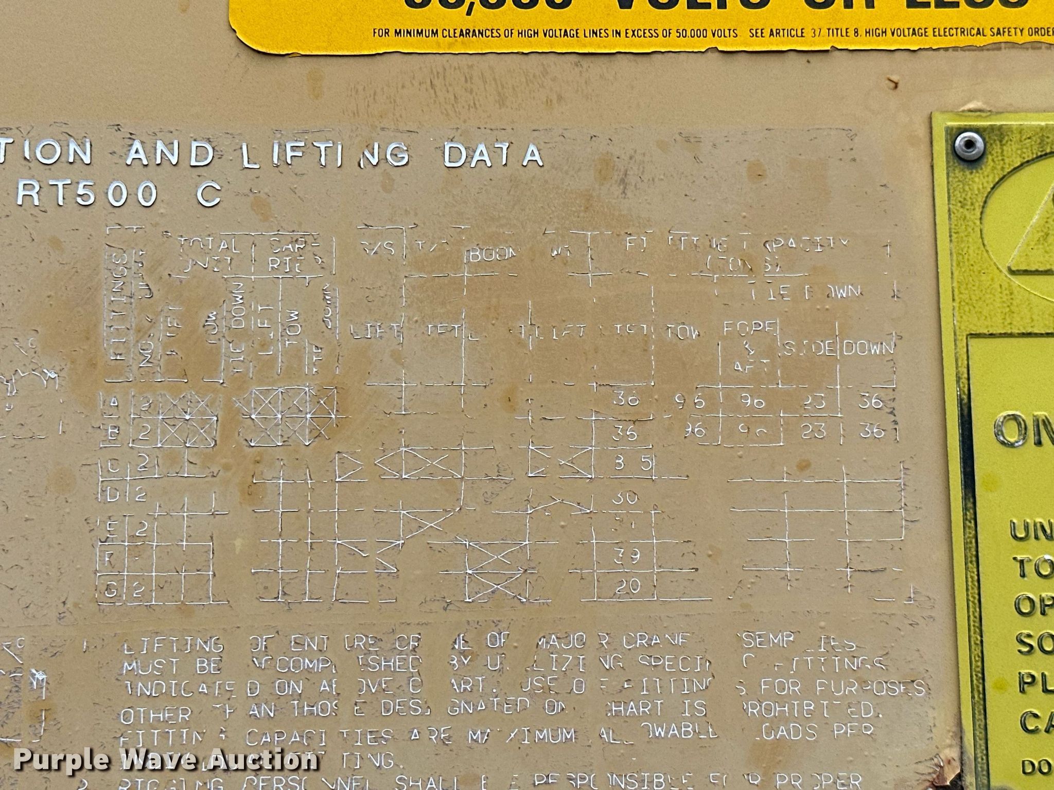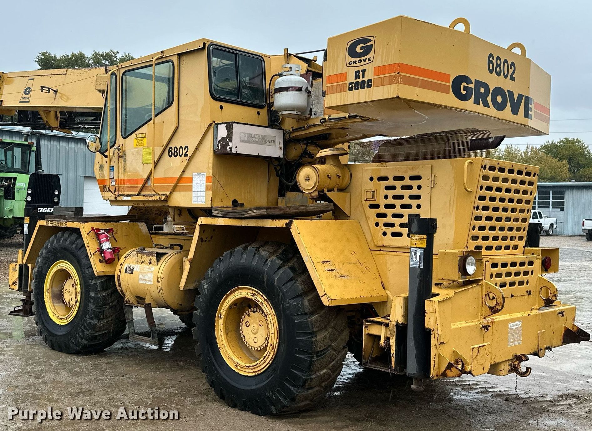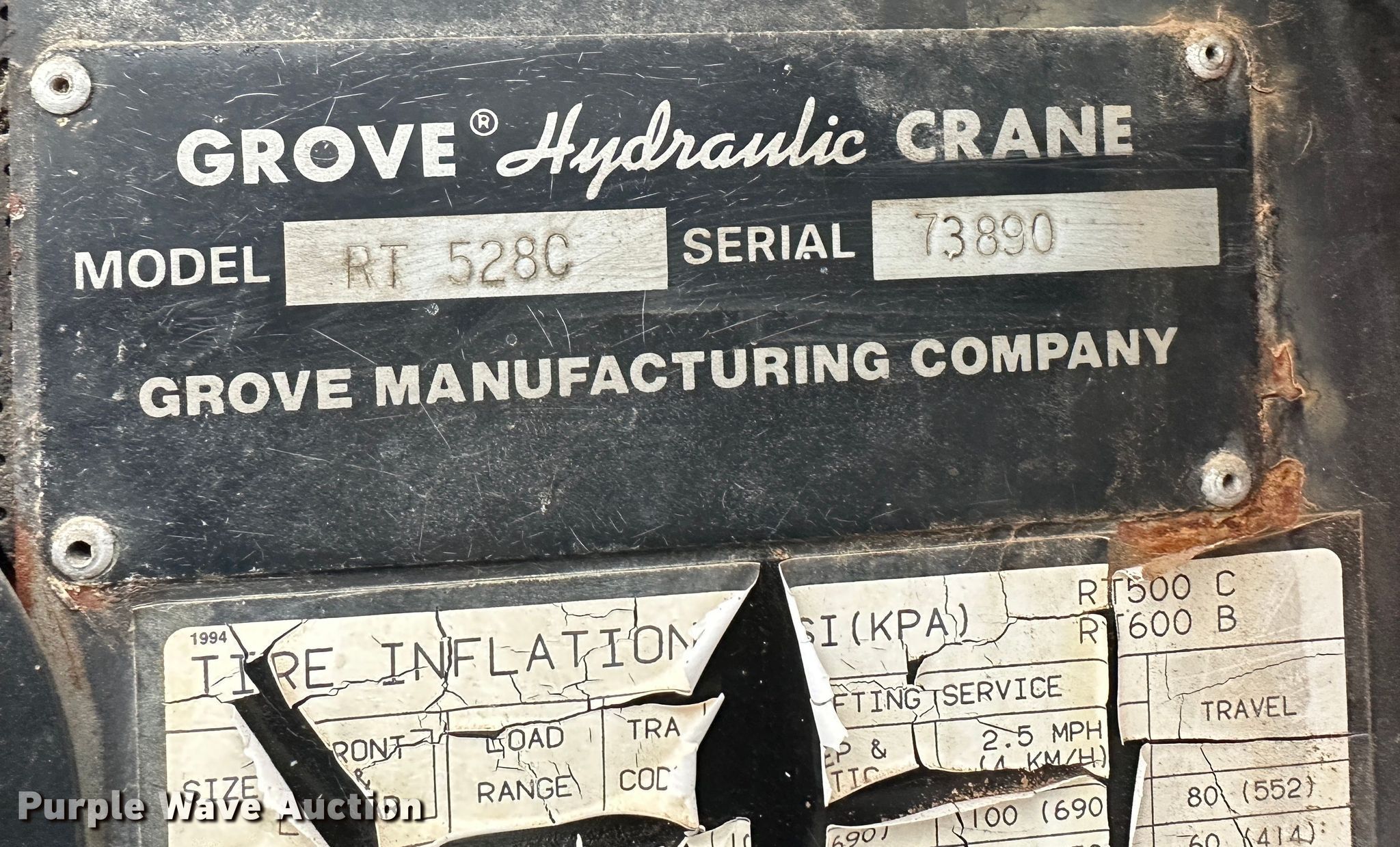 1990 Grove RT528C crane. Miles: 3,972 on odometer, Serial: 73890, Unit #: B-0608. Engine Cylinders: 6, Fuel type: Diesel. Transmission Powershift, 3F - 3R. Chassis Axles: Single, Suspension: Spring, Brakes: Hydraulic. Operators station Enclosed cab, Crane controls: Stick. Features Boom Telescopic, Maximum boom length: 70' Sections: 3, Maximum lift capacity: 56,000 lbs, Stabilizers: 4, Boom controls In-cab, Crane block, Crane ball & hook, Manuals, Lift chart. Tires Size: 20.5-25. Notes Unknown operating condition. LaForge & Budd Construction Retirement - Open Inspection December 6 - Sales tax exempt. 2020 North 21st Street. Parsons, KS 67357