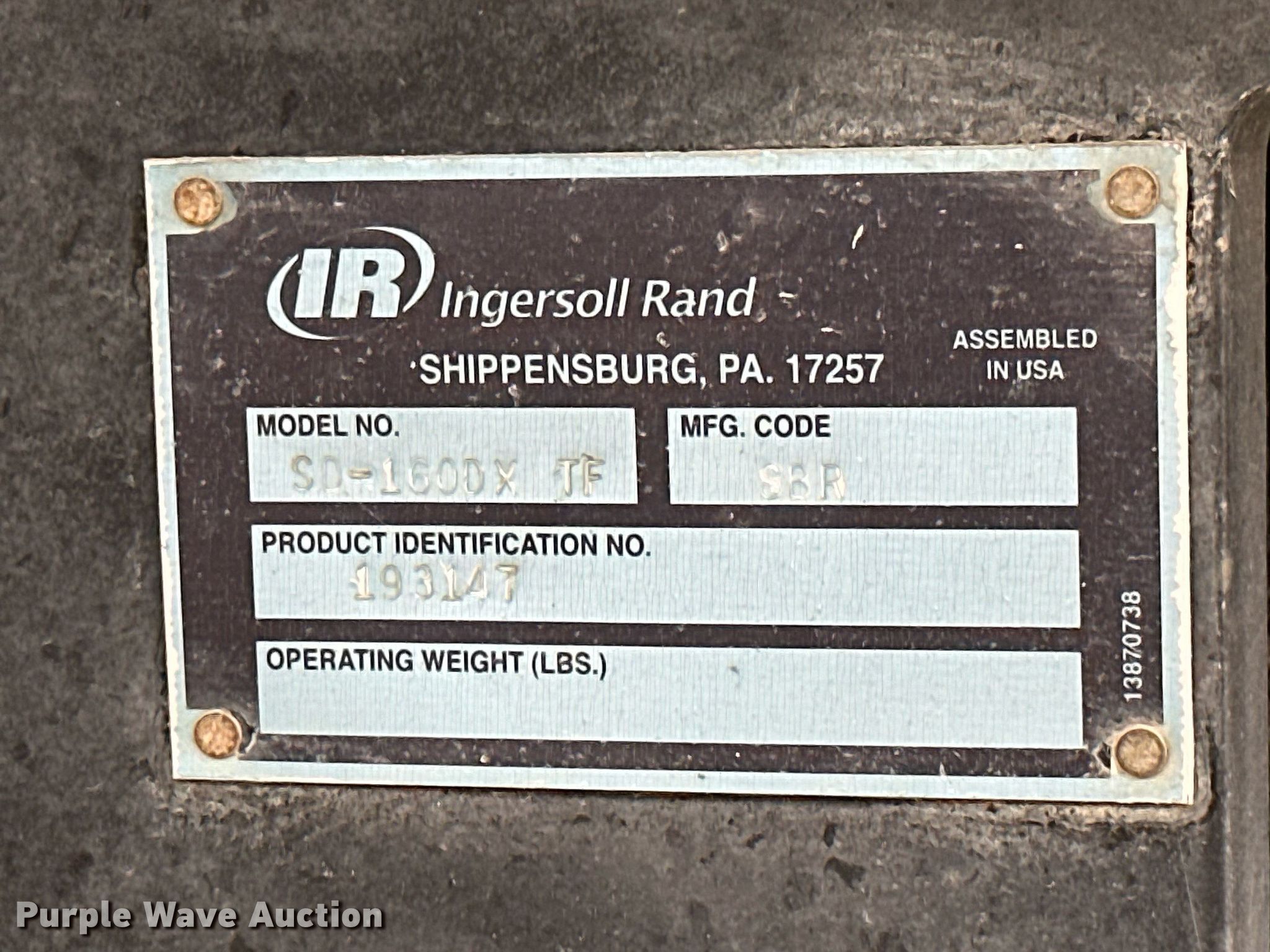 Purple Wave is selling a used Single Drum Roller Compactor in Kansas. This item is a 2007 Ingersoll Rand SD-160DX single drum vibratory roller with the following: Hours: 881 on meter, Serial: 193147, Unit #: B-0725