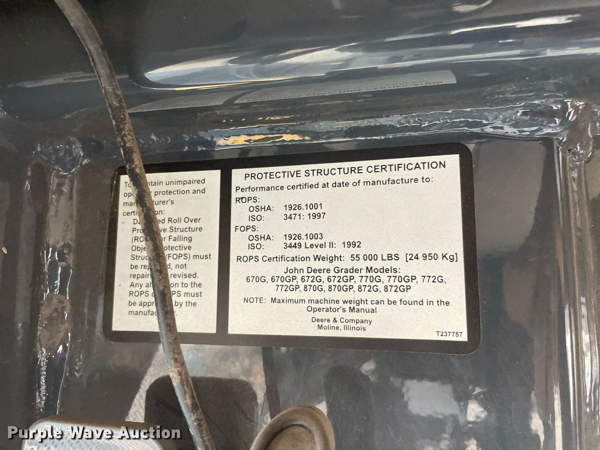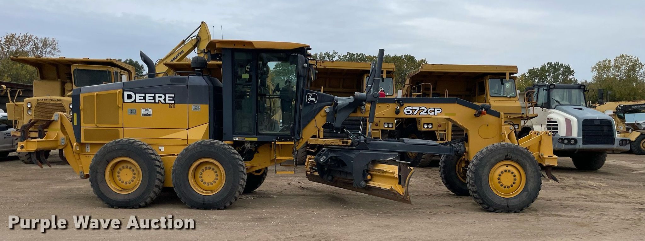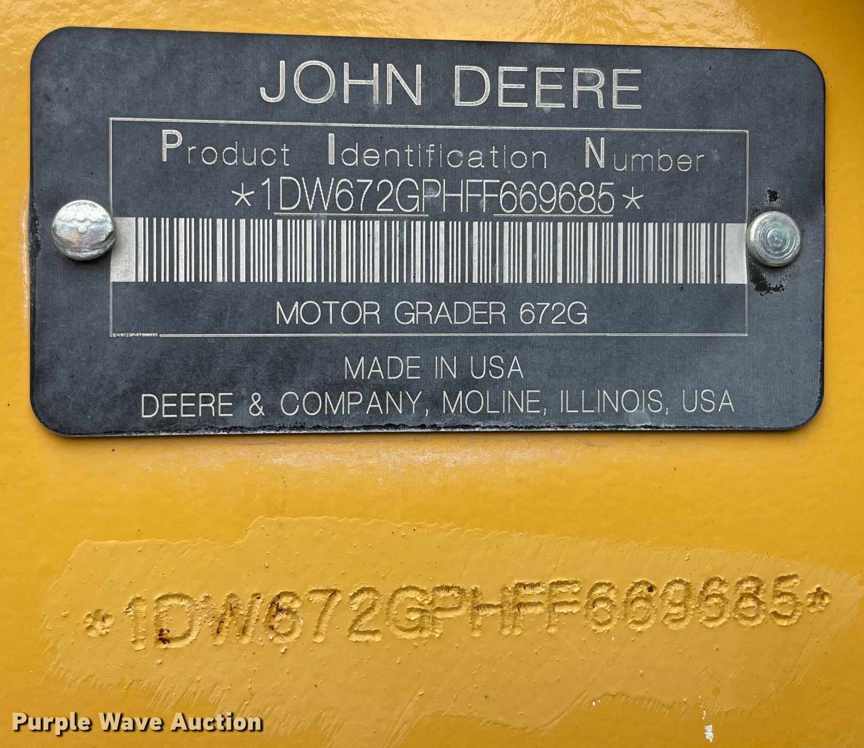 Purple Wave is selling a used Motor Grader in Kansas. This item is a 2015 John Deere 672GP motor grader with the following: Hours: 3,249 on meter, Serial: 1DW672GPHFF669685, Unit #: B-0216