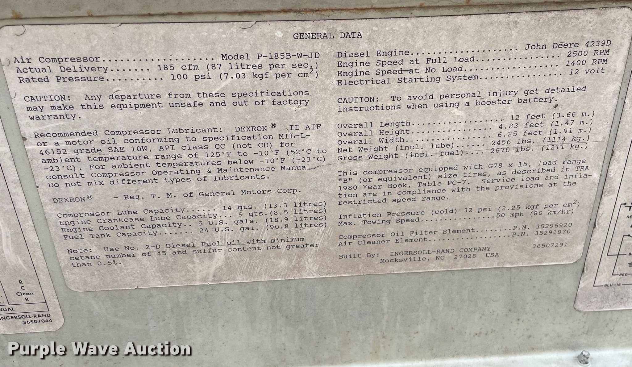 1992 Ingersoll Rand air compressor. Hours: 198 on meter, Serial: 165673-U88-329, Unit #: C-0717. Engine John Deere 4239D, Cylinders: 4, Fuel type: Diesel. Features Air compressor CFM: 185, PSI: 100. Trailer Ball hitch size: 2 5/16", Suspension: Spring, Axles: Single, Tire size: 205/70R15. Transfer of ownership documentation will be a bill of sale. LaForge & Budd Construction Retirement - Open Inspection December 6 - Sales tax exempt. 2020 North 21st Street. Parsons, KS 67357