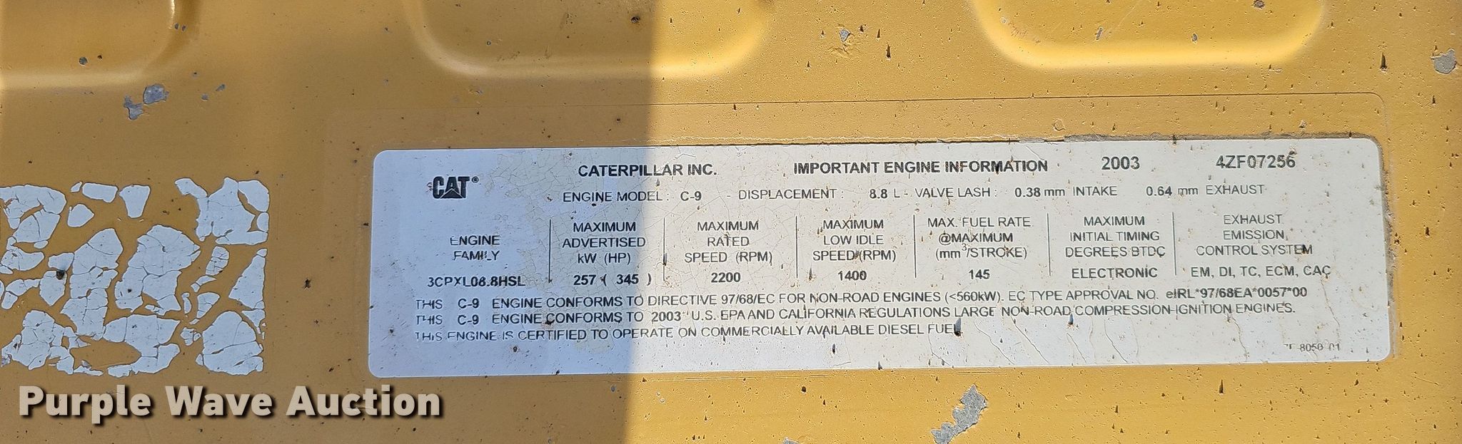 2003 Caterpillar 330C excavator. Hours: 18,206 on meter, Serial: CAT0330CKDKY01444, Unit #: 80. Engine Caterpillar C-9, Serial: 4ZF07256, Displacement: 8.8L, Cylinders: 6, Fuel type: Diesel, HP: 345, kW: 257. Transmission Hydrostatic, Two speed travel. Operators station Enclosed cab, AC, Heat. Features Auxiliary hydraulics Standard, Boom Standard, Stick Stick length: 12' 6", Thumb: Hydraulic Dynax, Bucket Caterpillar, Width: 54", Teeth: 6, Bucket Caterpillar, Width: 60", Teeth: 6. Tracks Width: 33.5", Grouser pads: Triple. LeGrande Excavating - Open inspection December 08, 2023. 7601 South 1st Street. Lincoln, NE 68512