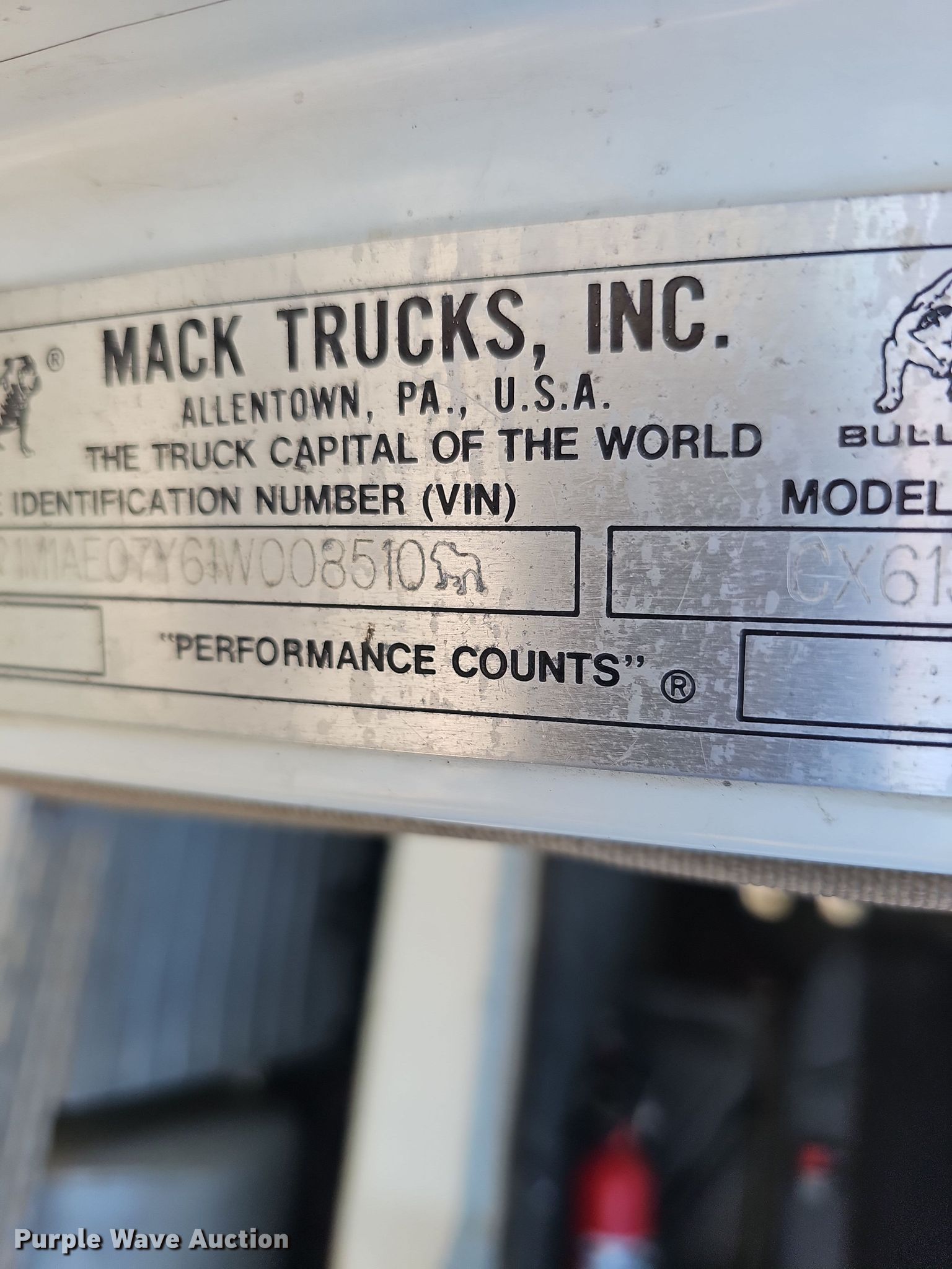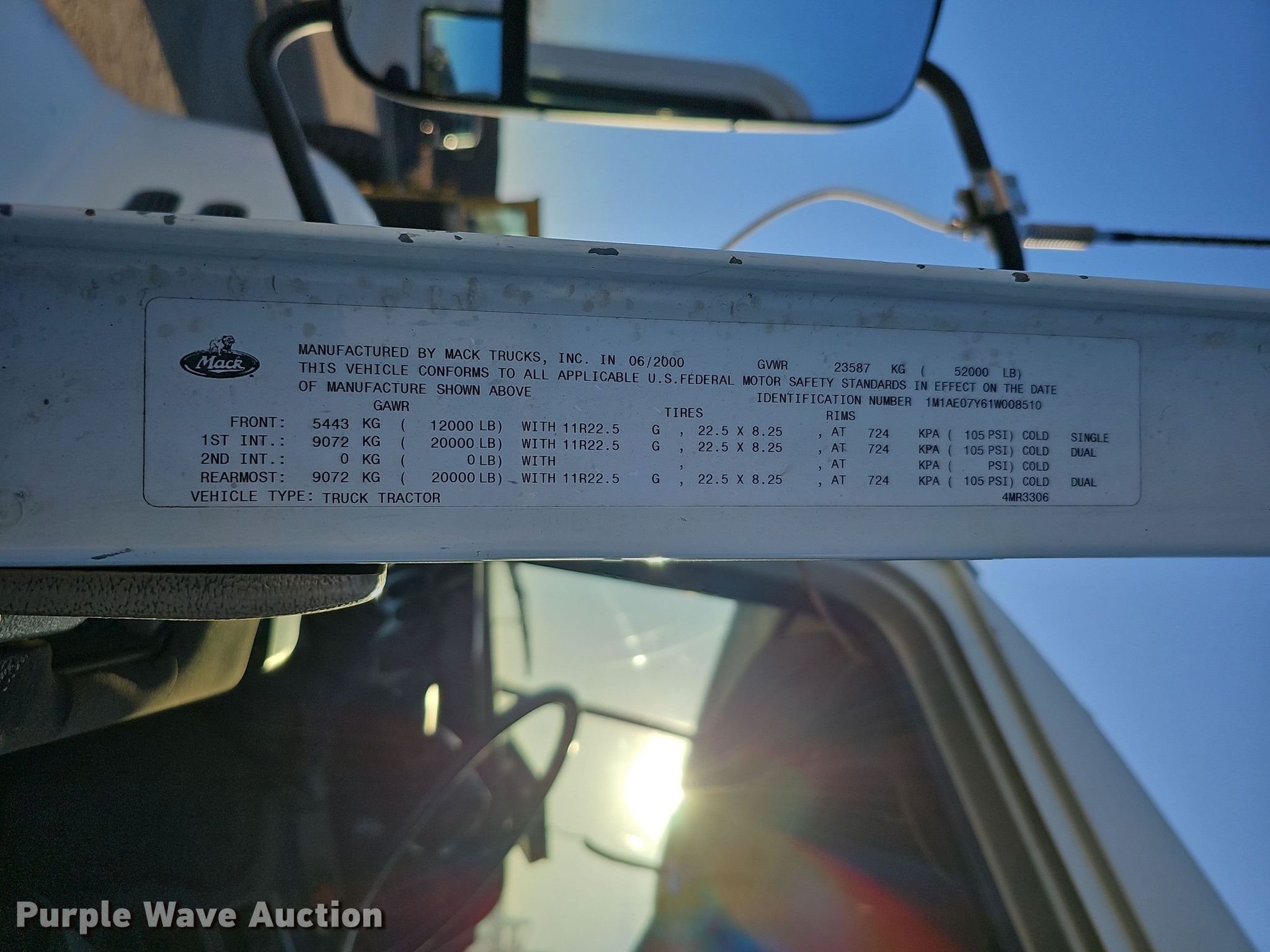 Purple Wave is selling a used Truck Tractor in Nebraska. This item is a 2001 Mack CX613 Vision semi truck with the following: Miles: 791,401 on odometer, Hours: 31,890 on meter, Miles or hours may vary, unit still in use, VIN: 1M1AE07Y61W008510, Unit #: 238