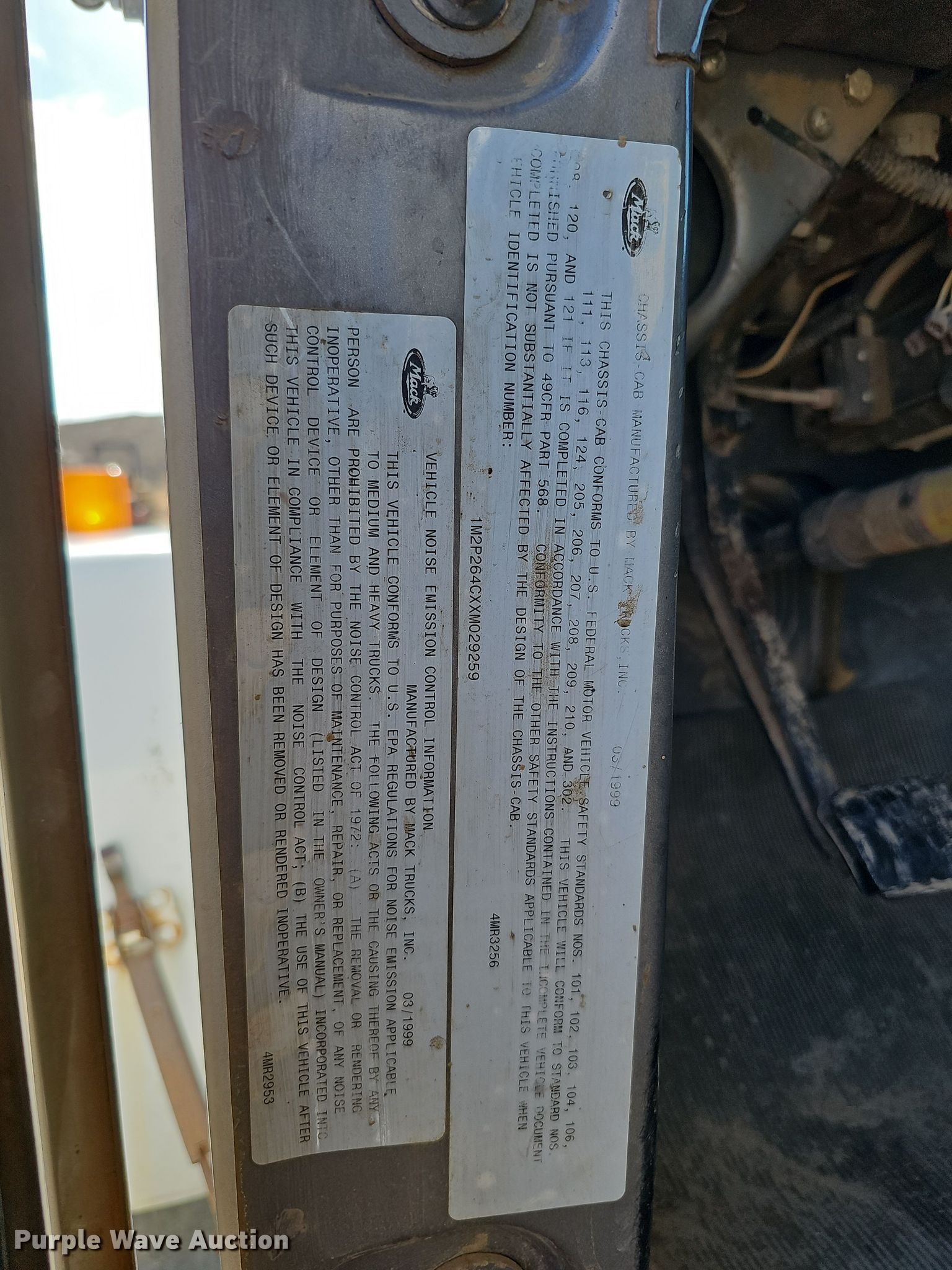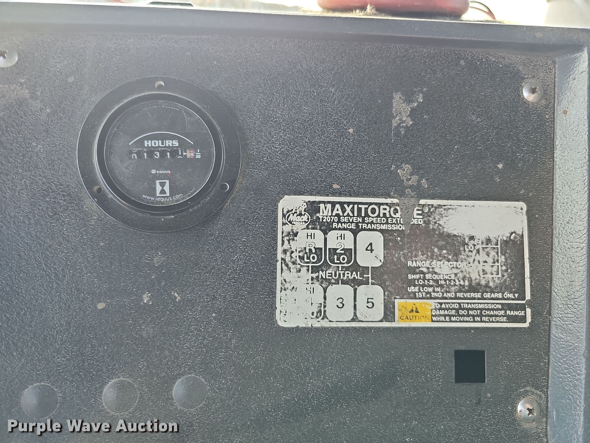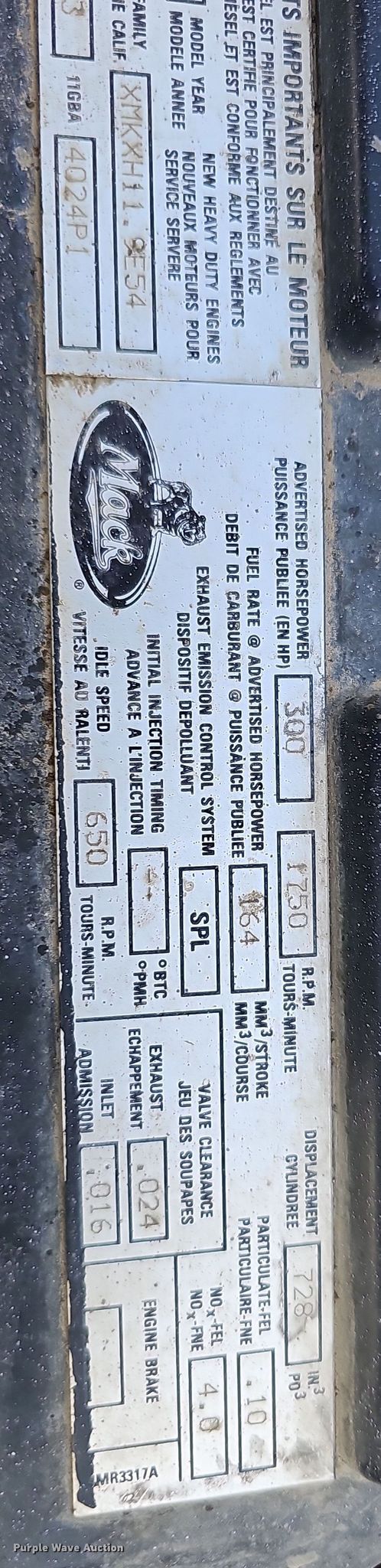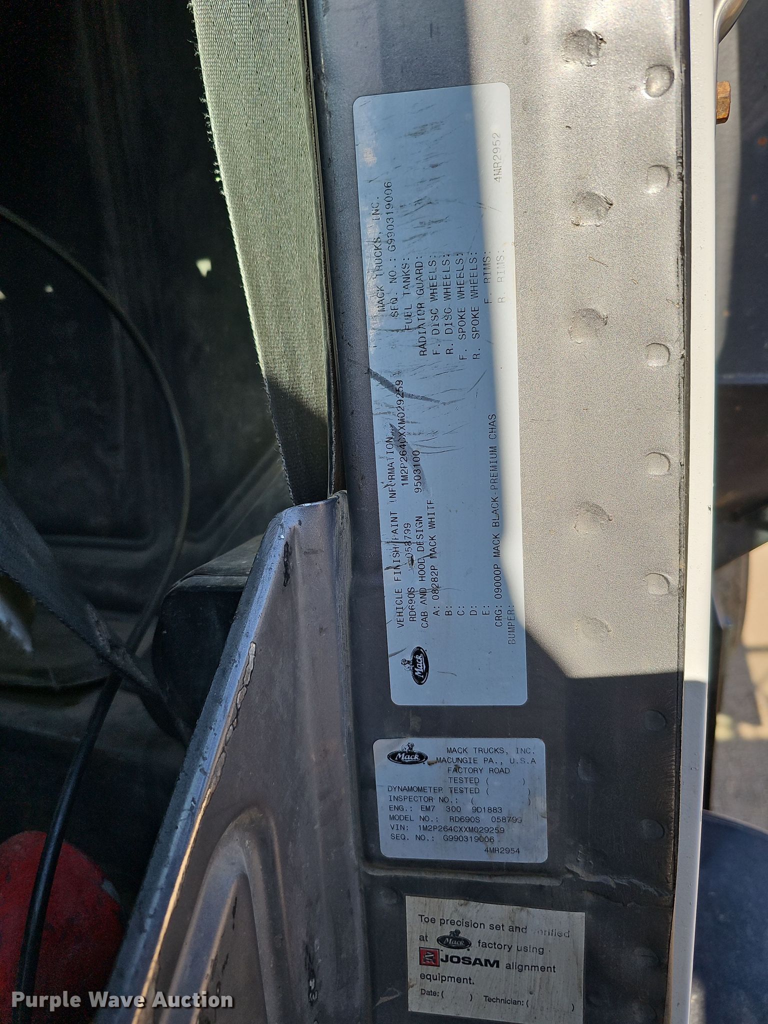 1999 Mack RD690S dump truck. Miles: 501,037 on odometer, Hours: 29,388 on meter, VIN: 1M2P264CXXM029259, Unit #: 142. Engine Mack EM7-300, Serial: 9D183, Displacement: 12.0L, Cylinders: 6, Fuel type: Diesel, HP: 300. Transmission Mack MaxiTorque T2070, Manual, Speed: 7. Chassis Axles: Tandem, Suspension: Camelback, Brakes: Air, GVWR: 64,000 lbs FAWR: 18,000 lbs, IAWR: 23,000 lbs, RAWR: 23,000 lbs, Wheelbase: 230". Interior AC, Heat, Heated mirrors, Cruise control. Features Dump bed Model: BMT-400, 16' L x 96" W, Side height: 46", Bed type: Steel, Ram: Single, End gate: Air operated. Tires Front: 385/65R22.5, Rear: 11R22.5. Notes Windshield chipped or cracked. Nebraska title. Title distribution may be delayed up to 14 days from verification of funds. LeGrande Excavating - Open inspection December 08, 2023. 7601 South 1st Street. Lincoln, NE 68512