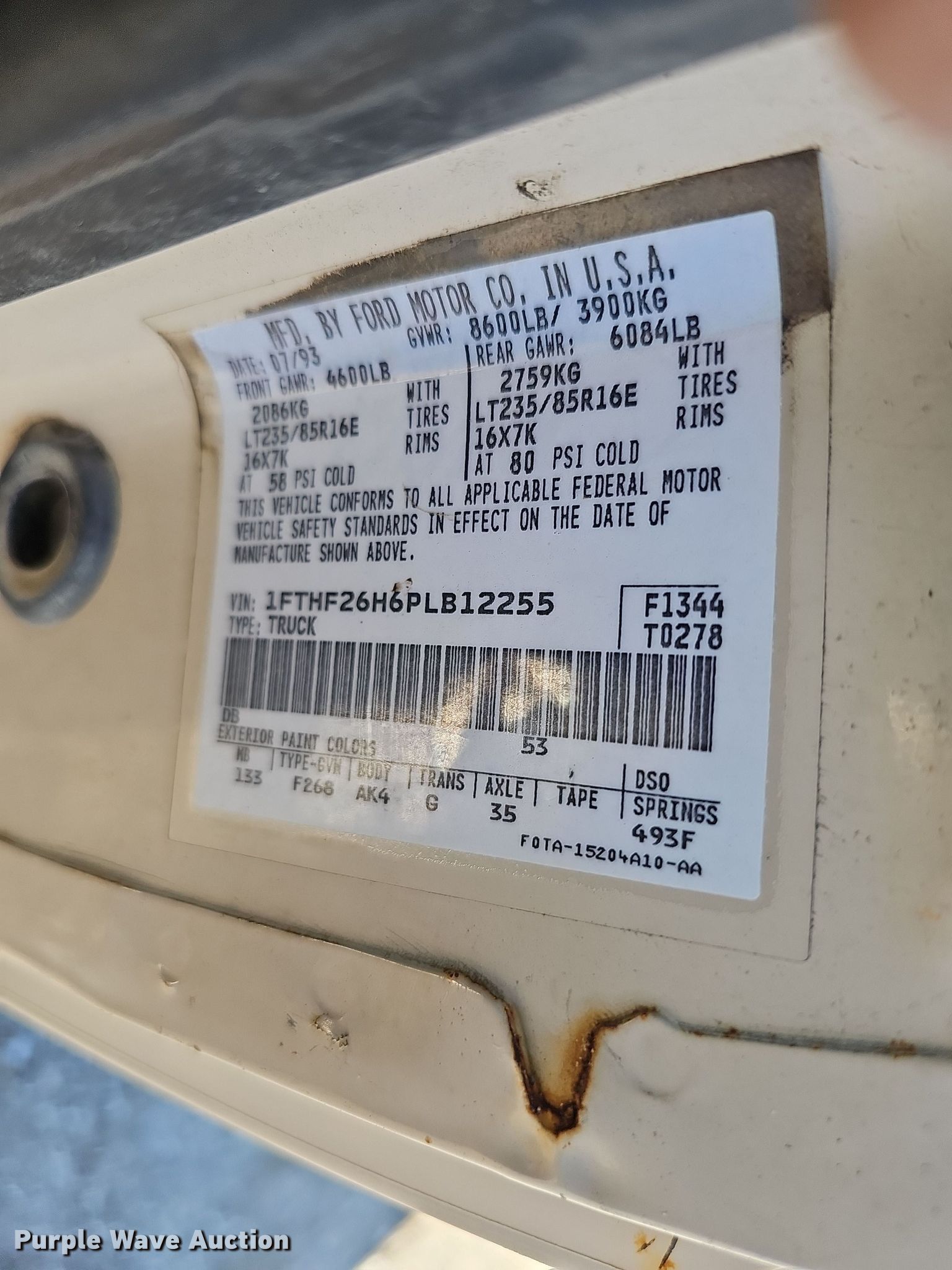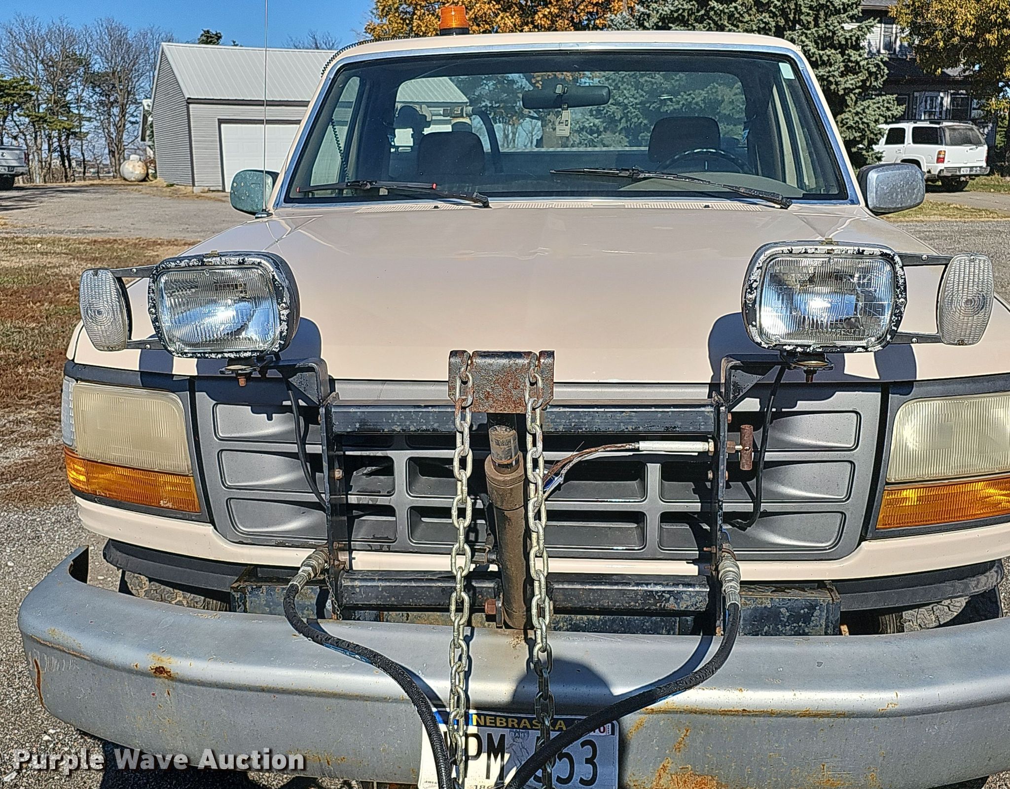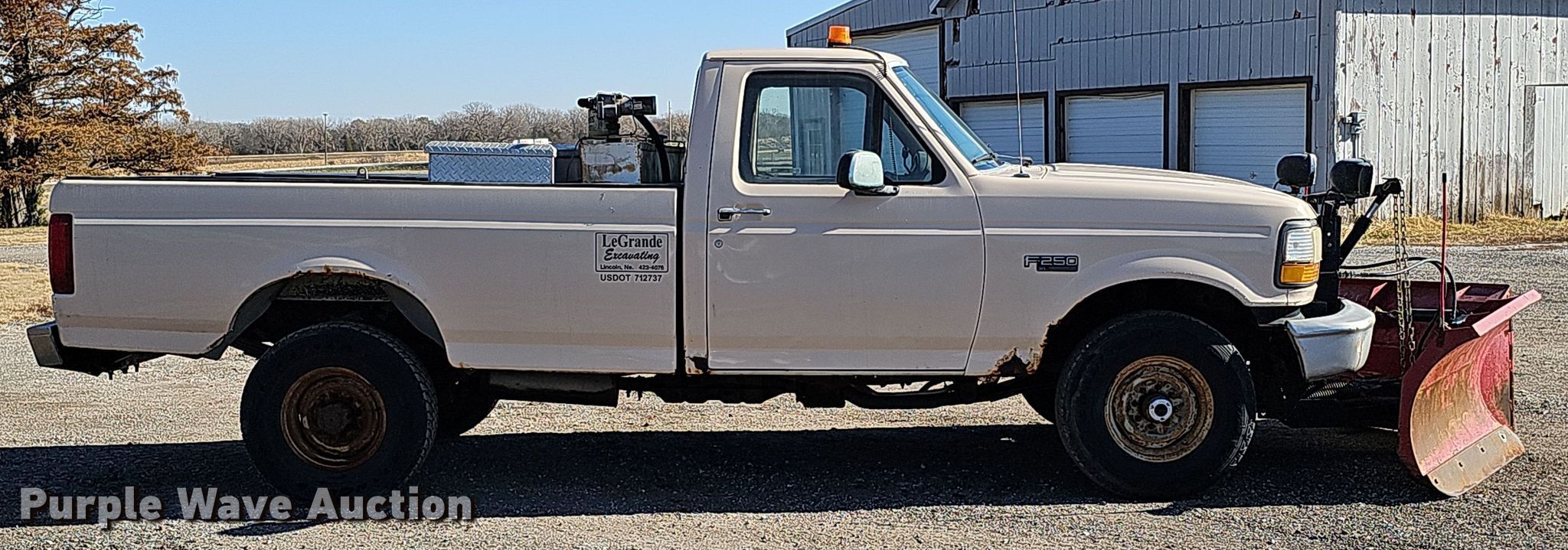 1993 Ford F250 XL pickup truck. Miles: 79,441 on odometer, VIN: 1FTHF26H6PLB12255, Unit #: 17. Engine Displacement: 5.8L V8 OHV, Cylinders: 8, Fuel type: Gas. Transmission Automatic, Four wheel drive. Interior AC, Heat. Features Boss snow plow Width: 98", Auxiliary fuel tank. Tires Size: LT235/85R16. Notes Dash warning indicator: Check engine, Windshield chipped or cracked, Rust damage. Nebraska title. Title distribution may be delayed up to 14 days from verification of funds. LeGrande Excavating - Open inspection December 08, 2023. 7601 South 1st Street. Lincoln, NE 68512