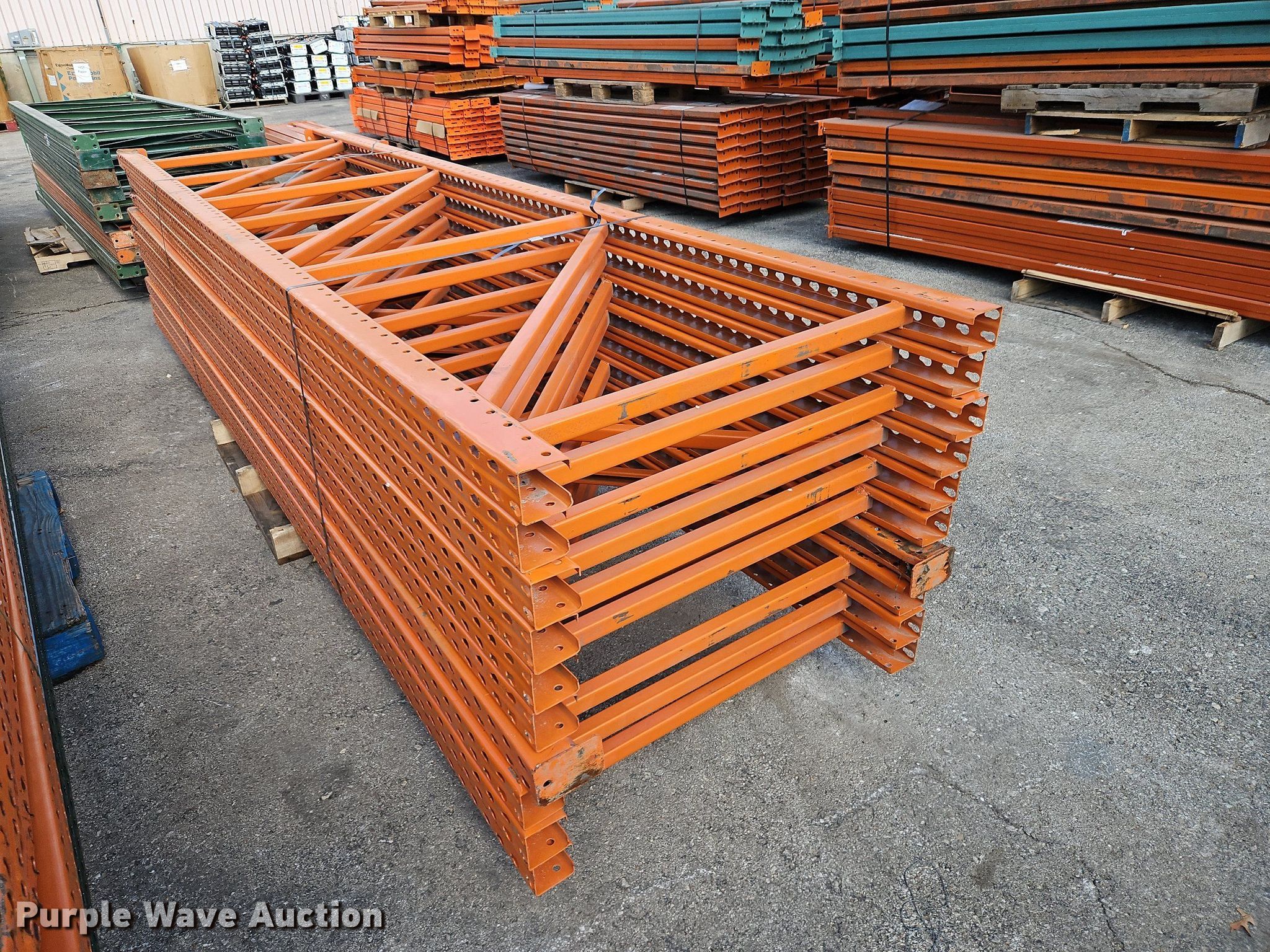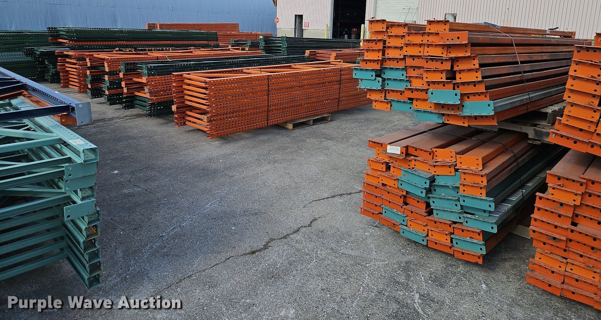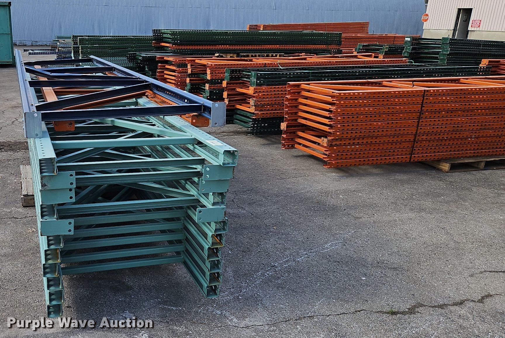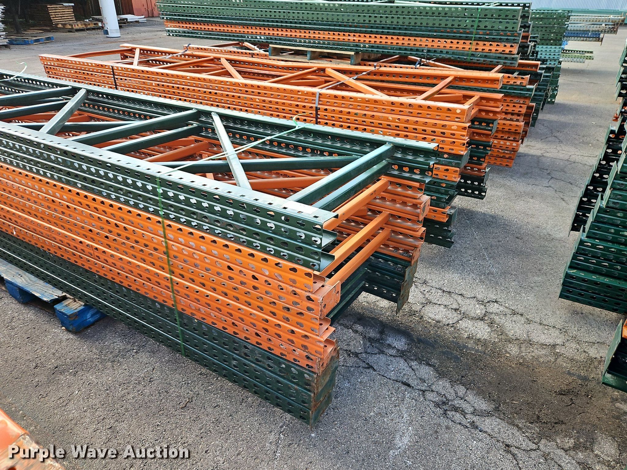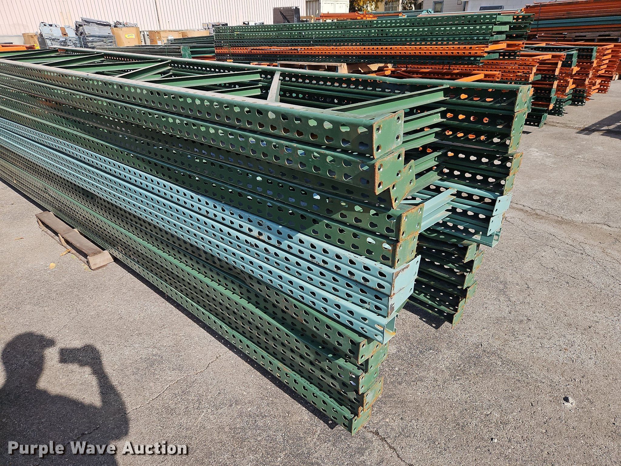 Purple Wave is selling a used Pallet Racking in Kansas. This item is a Pallet racking with the following: Approximately, (1200+) 10' horizontal beams, (16) 8' 6" horizontal beams, (20) 9' horizontal beams, (8) 7' horizontal beams, (4) 5' 6" horizontal beams, (32) 6' 6" horizontal beams, (186) 12' L x 36" W uprights, (25) 16' L x 26" W uprights, (8) 18' L x 42" W uprights, (4) 15' L x 42" W uprights, (2) pallets of 2x4 cross boards