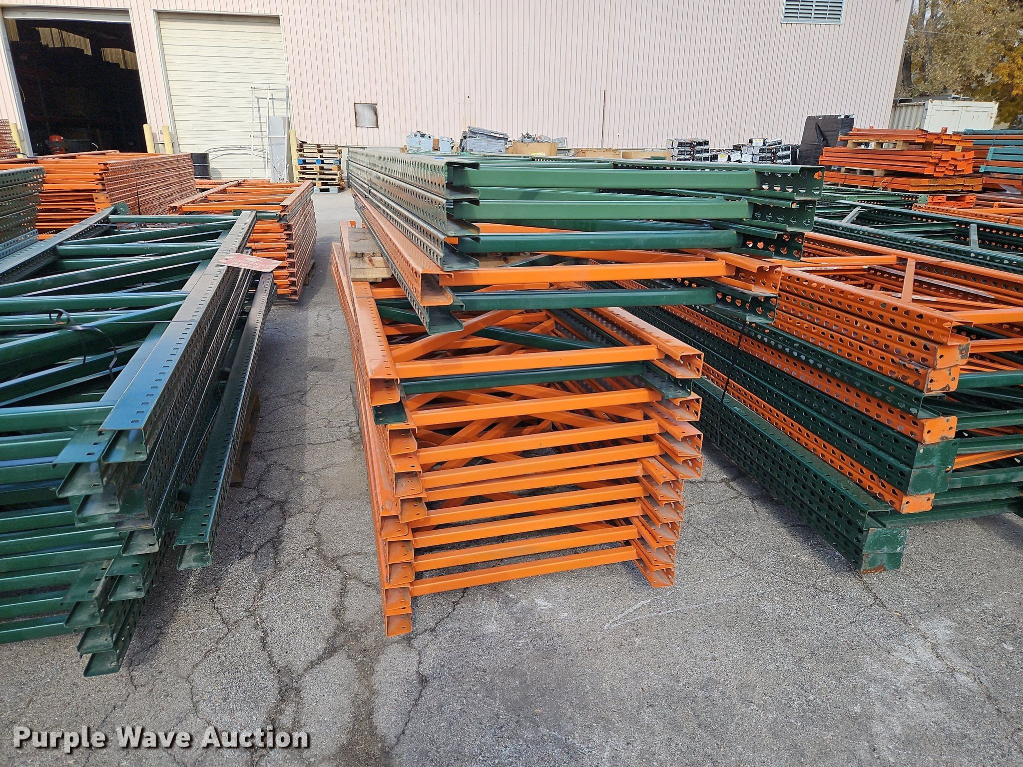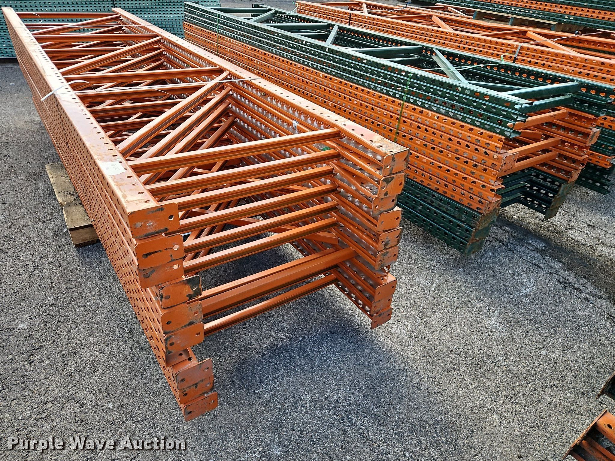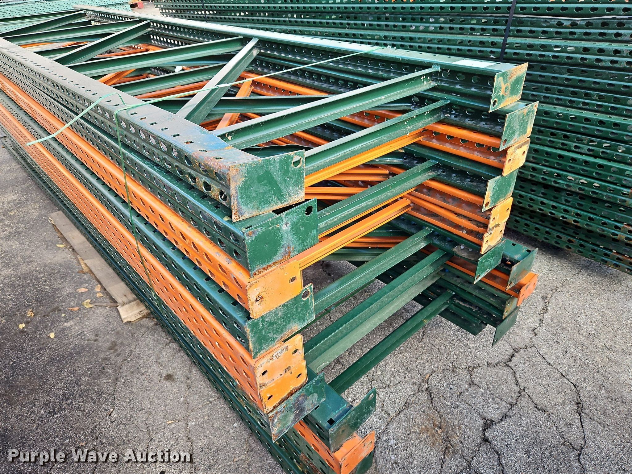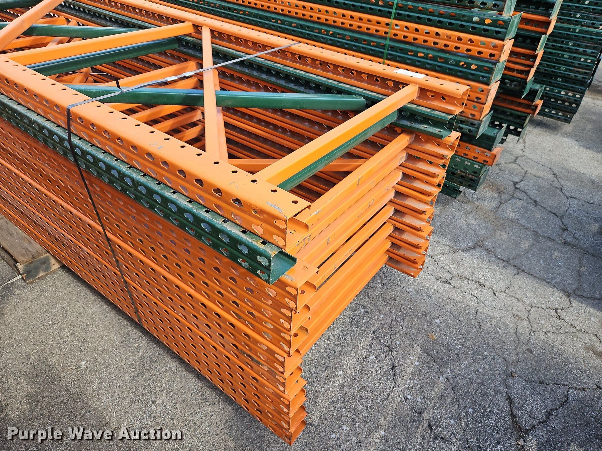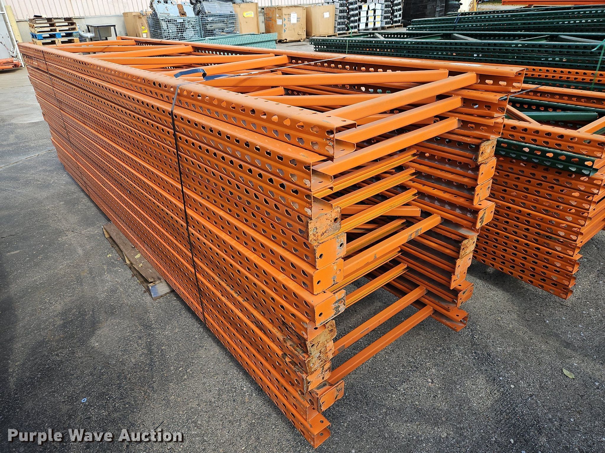 Purple Wave is selling a used Pallet Racking in Kansas. This item is a Pallet racking with the following: Approximately, (1200+) 10' horizontal beams, (16) 8' 6" horizontal beams, (20) 9' horizontal beams, (8) 7' horizontal beams, (4) 5' 6" horizontal beams, (32) 6' 6" horizontal beams, (186) 12' L x 36" W uprights, (25) 16' L x 26" W uprights, (8) 18' L x 42" W uprights, (4) 15' L x 42" W uprights, (2) pallets of 2x4 cross boards