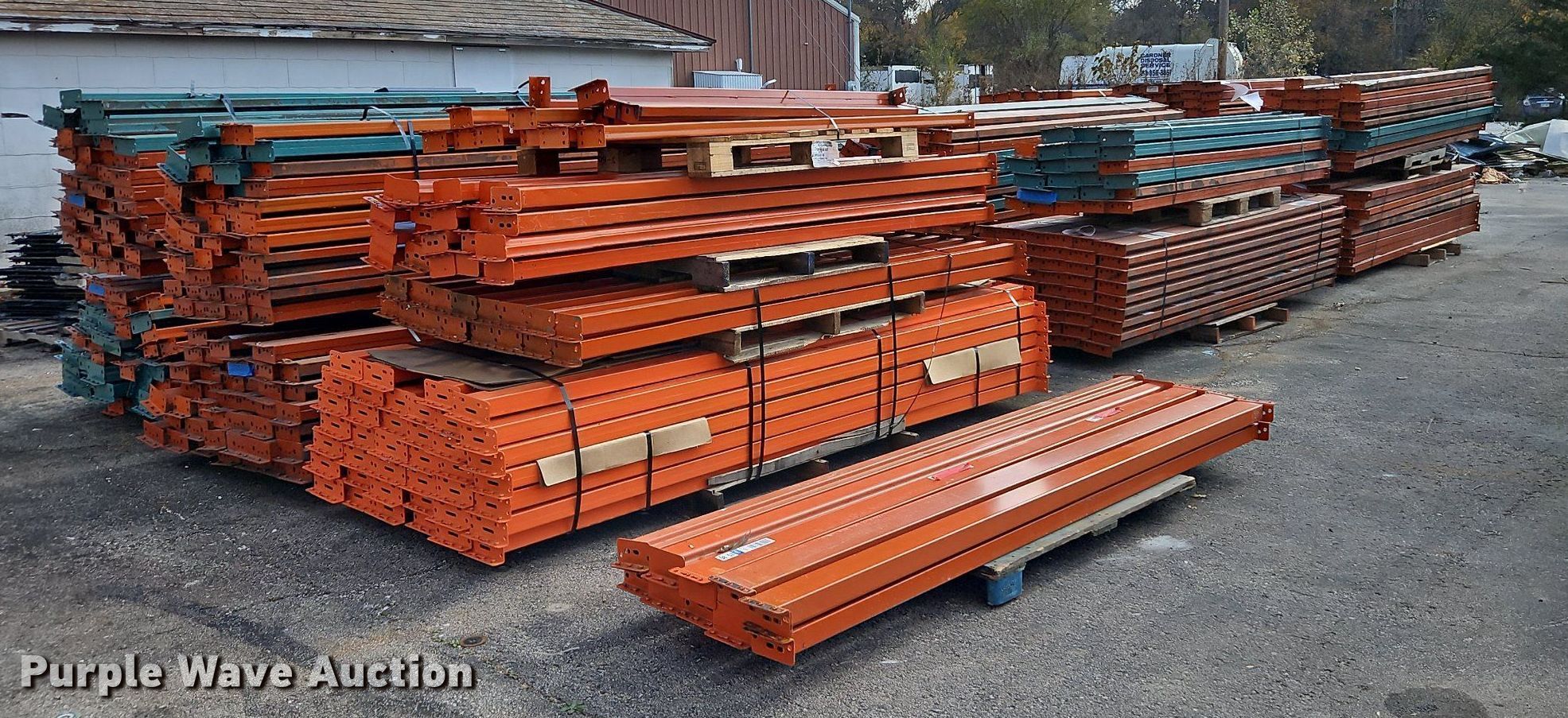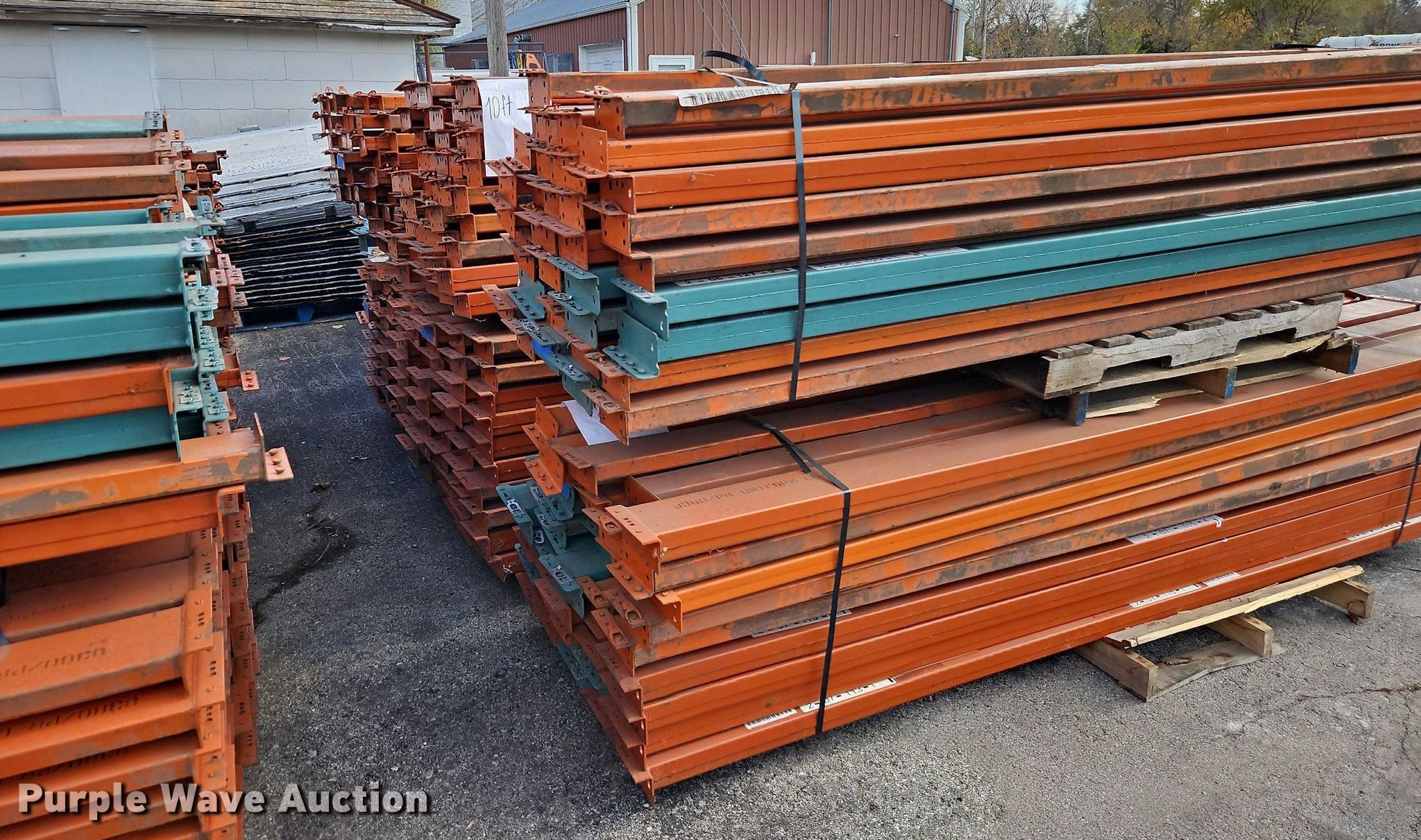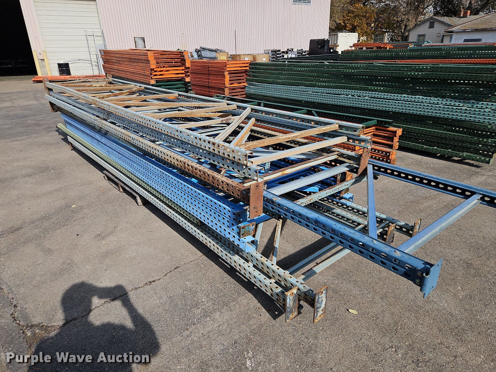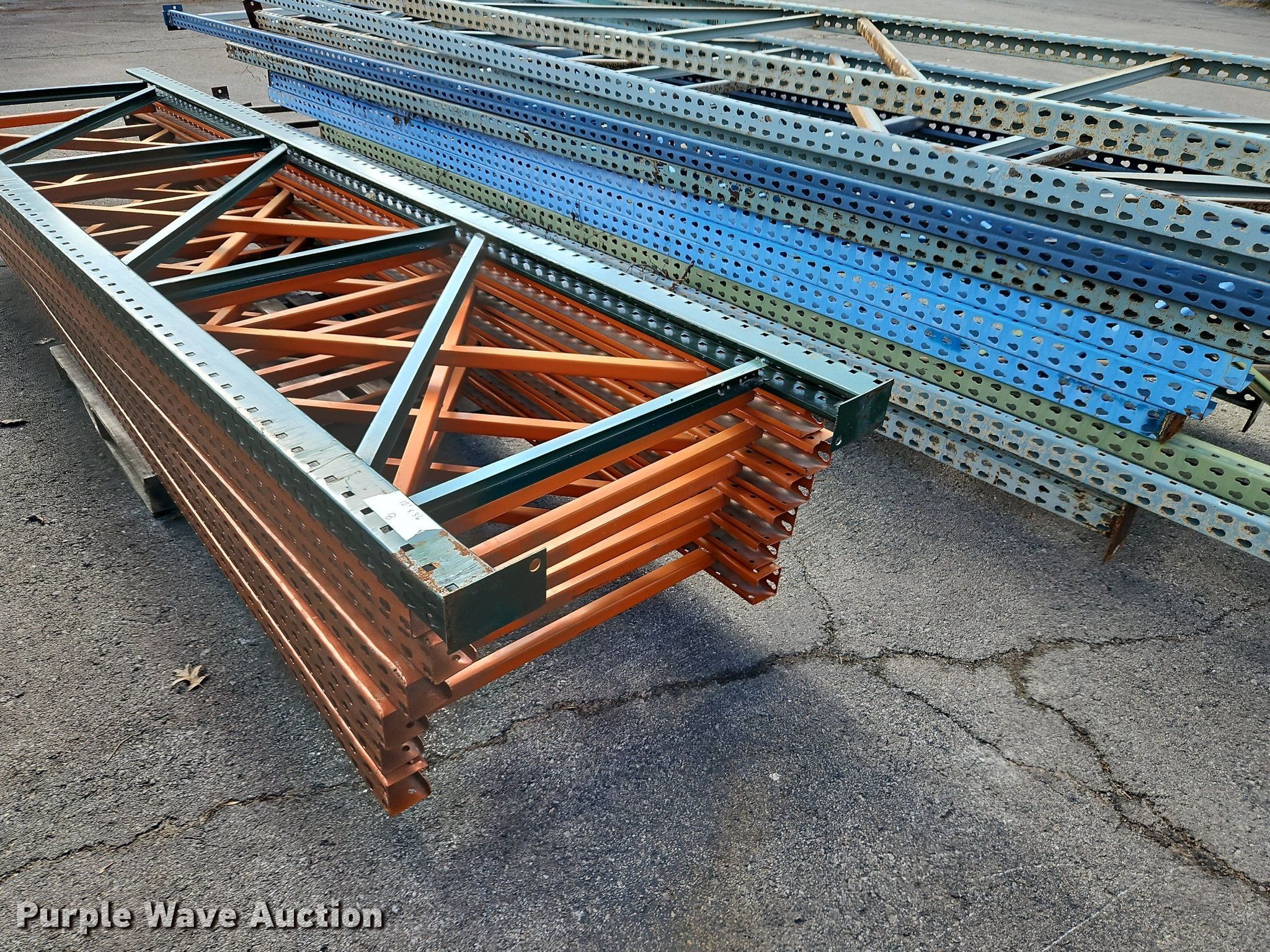 Purple Wave is selling a used Pallet Racking in Kansas. This item is a Pallet racking with the following: Approximately, (1200+) 10' horizontal beams, (16) 8' 6" horizontal beams, (20) 9' horizontal beams, (8) 7' horizontal beams, (4) 5' 6" horizontal beams, (32) 6' 6" horizontal beams, (186) 12' L x 36" W uprights, (25) 16' L x 26" W uprights, (8) 18' L x 42" W uprights, (4) 15' L x 42" W uprights, (2) pallets of 2x4 cross boards