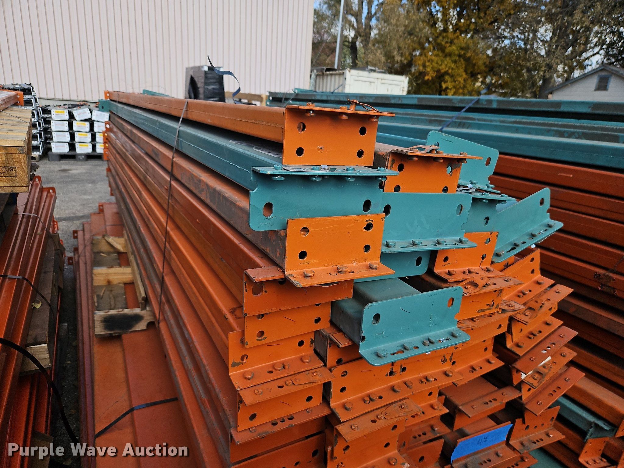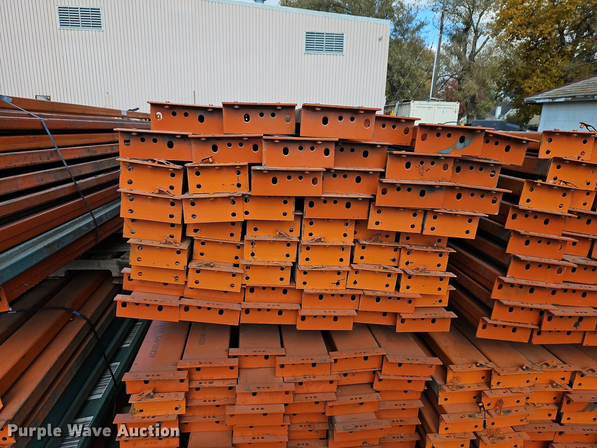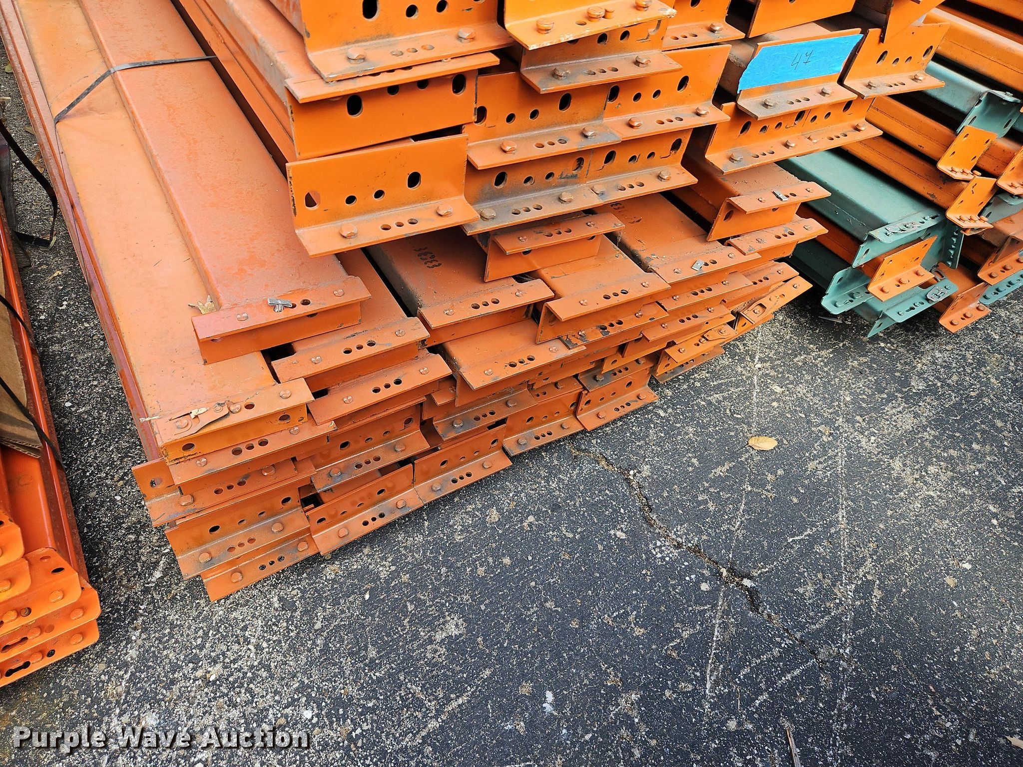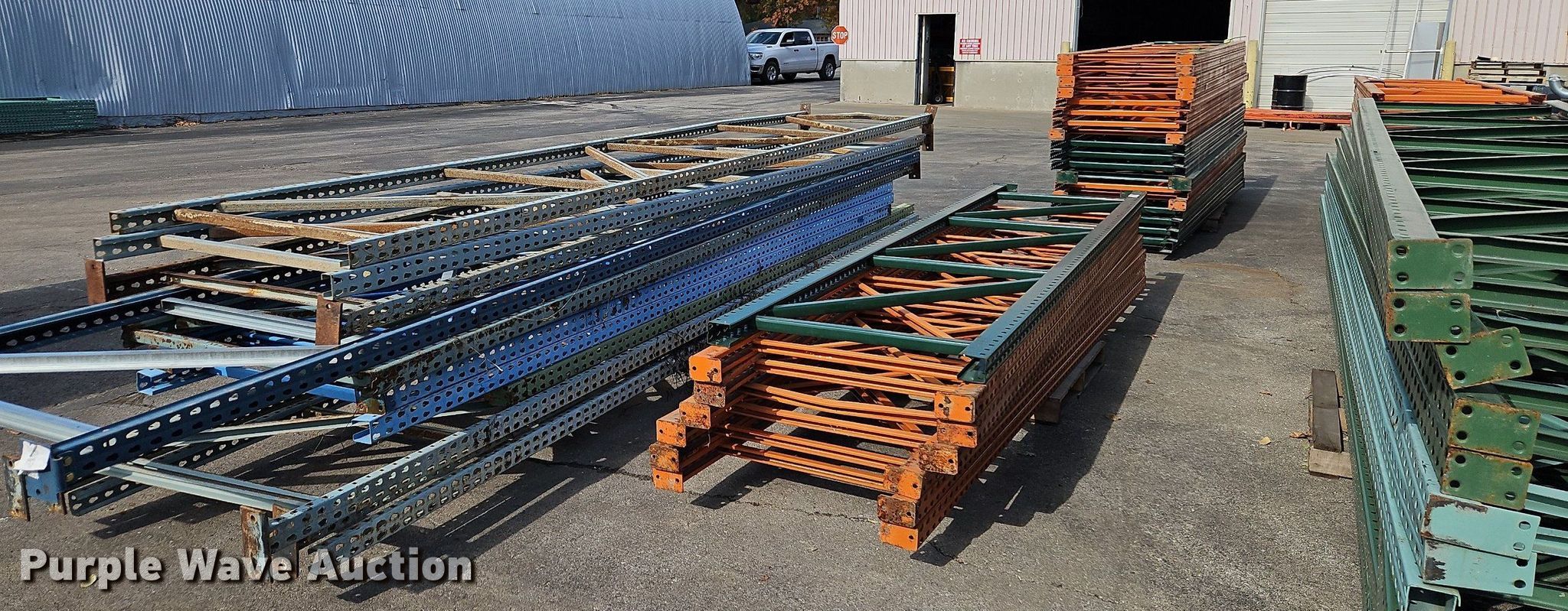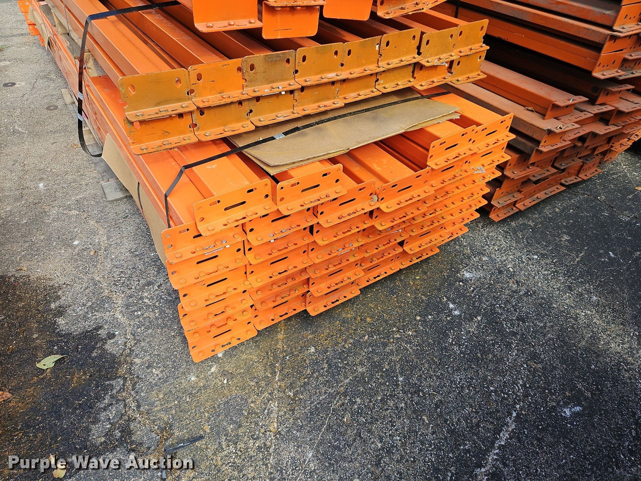 Purple Wave is selling a used Pallet Racking in Kansas. This item is a Pallet racking with the following: Approximately, (1200+) 10' horizontal beams, (16) 8' 6" horizontal beams, (20) 9' horizontal beams, (8) 7' horizontal beams, (4) 5' 6" horizontal beams, (32) 6' 6" horizontal beams, (186) 12' L x 36" W uprights, (25) 16' L x 26" W uprights, (8) 18' L x 42" W uprights, (4) 15' L x 42" W uprights, (2) pallets of 2x4 cross boards