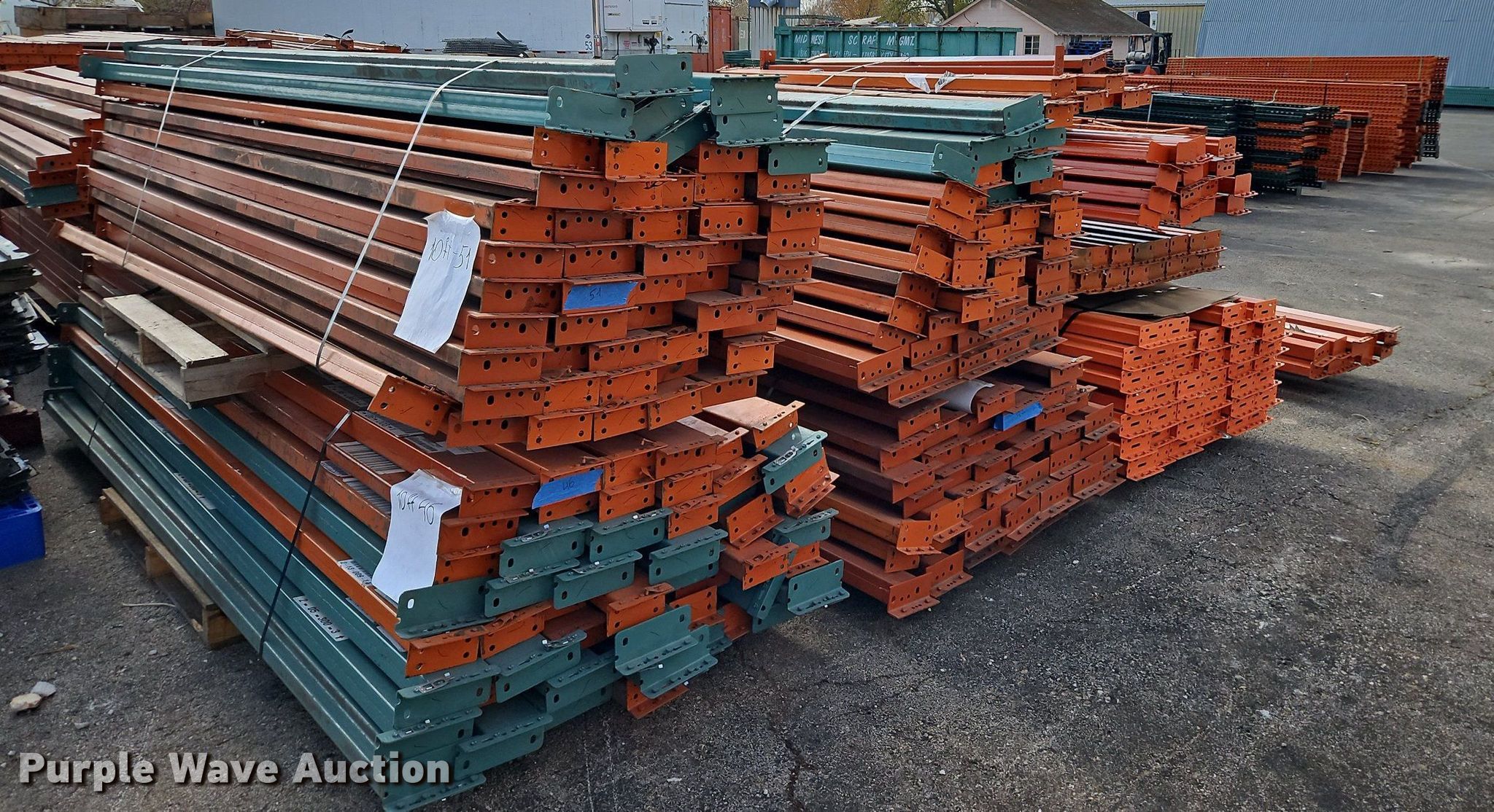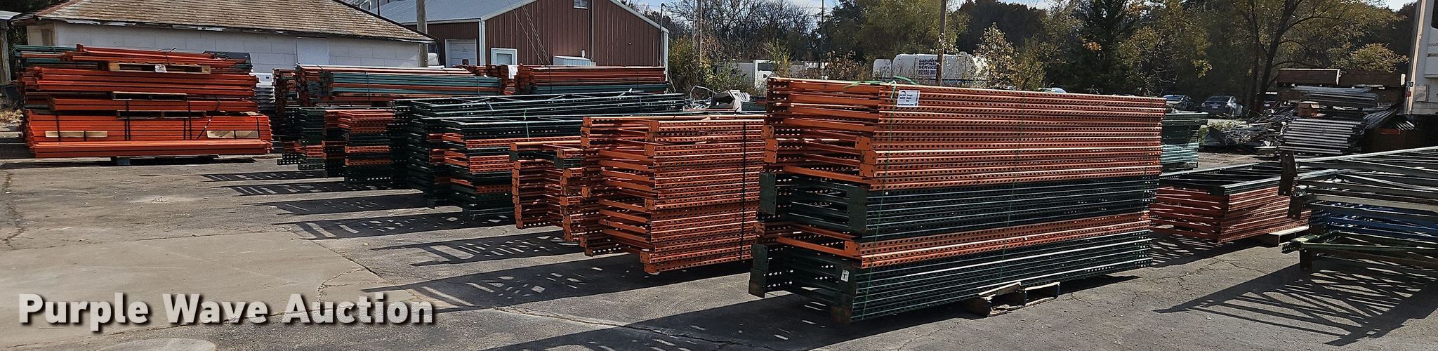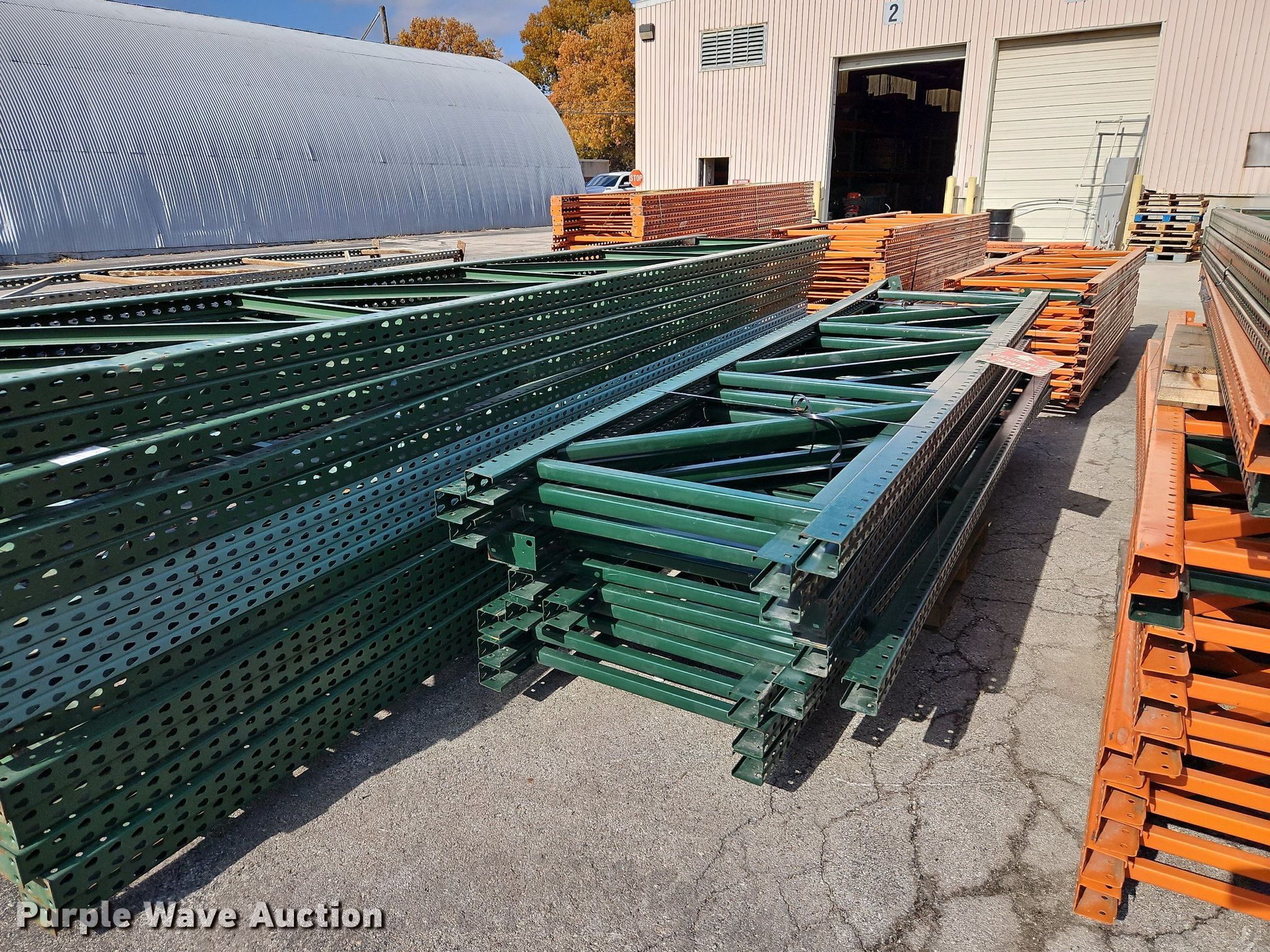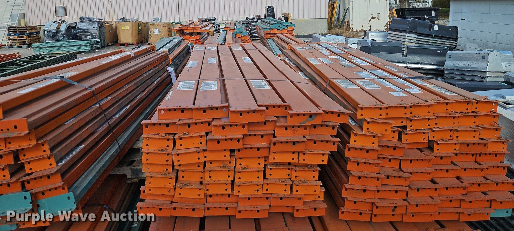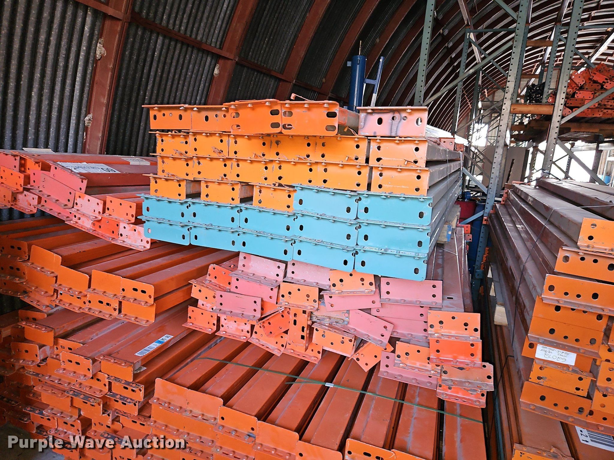 Purple Wave is selling a used Pallet Racking in Kansas. This item is a Pallet racking with the following: Approximately, (1200+) 10' horizontal beams, (16) 8' 6" horizontal beams, (20) 9' horizontal beams, (8) 7' horizontal beams, (4) 5' 6" horizontal beams, (32) 6' 6" horizontal beams, (186) 12' L x 36" W uprights, (25) 16' L x 26" W uprights, (8) 18' L x 42" W uprights, (4) 15' L x 42" W uprights, (2) pallets of 2x4 cross boards