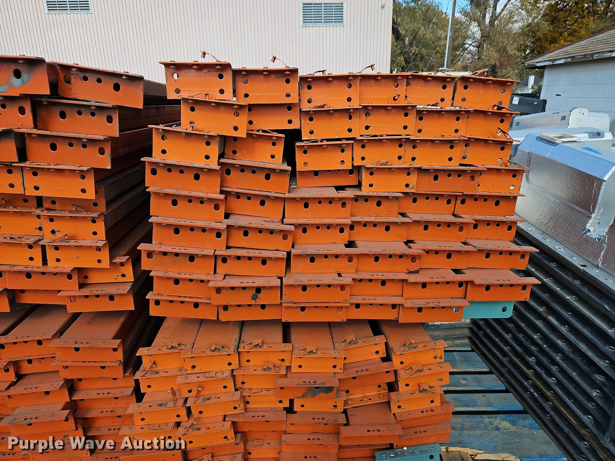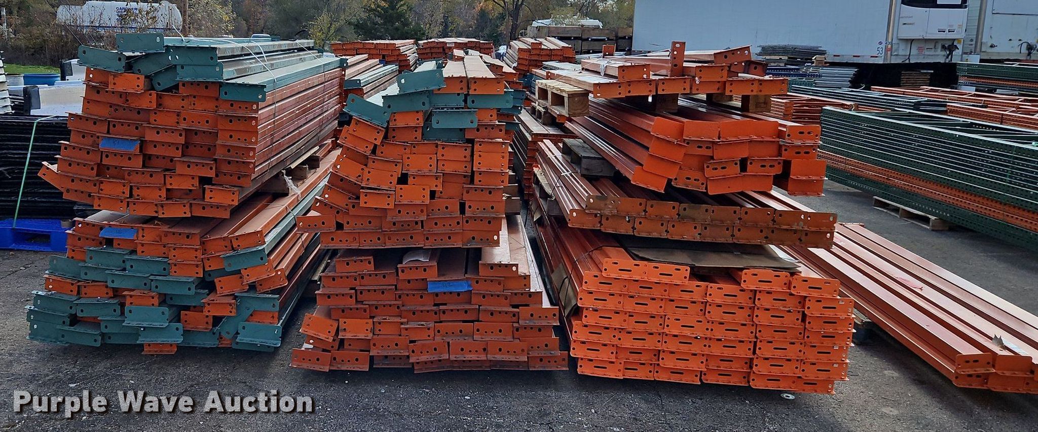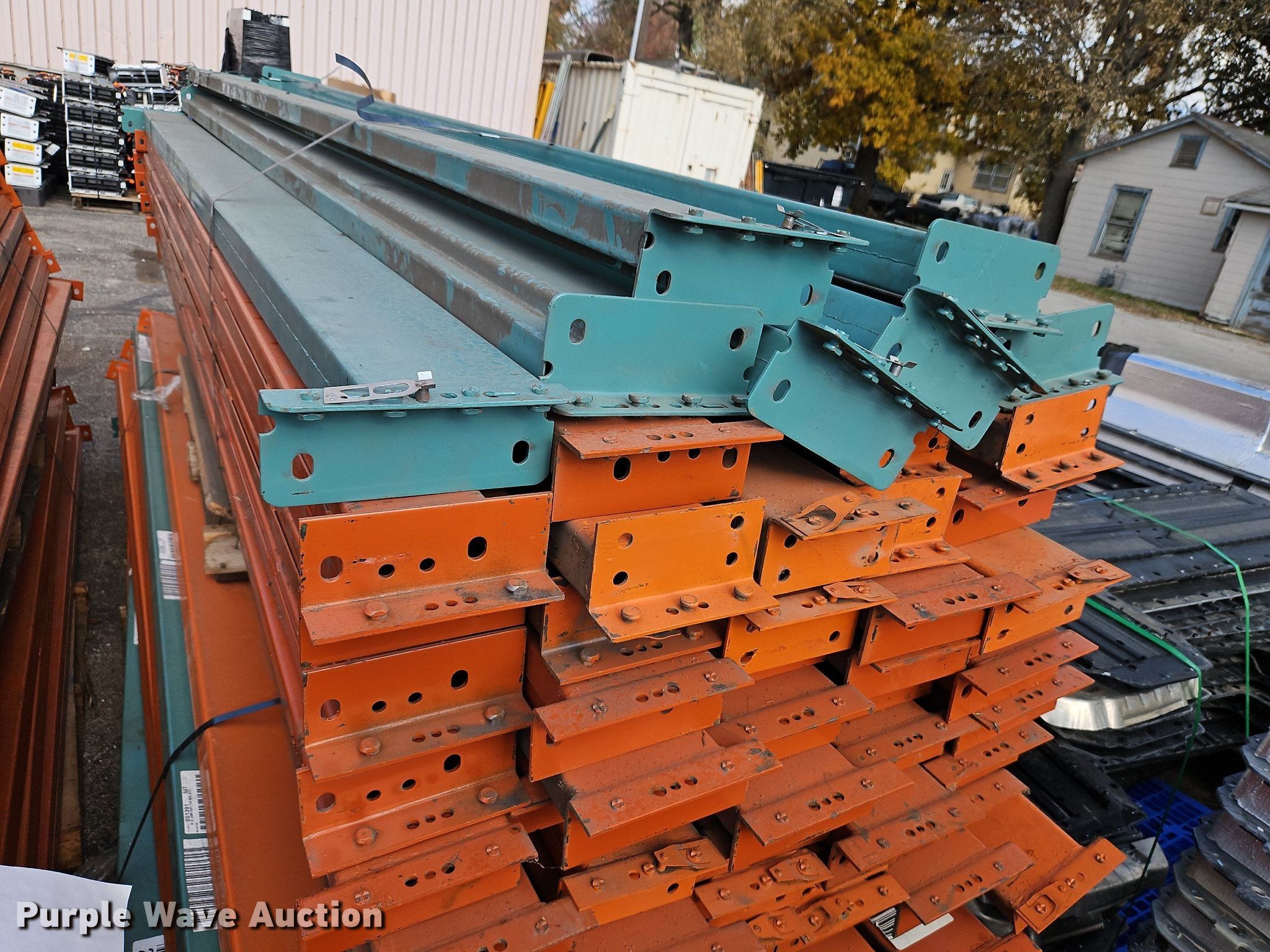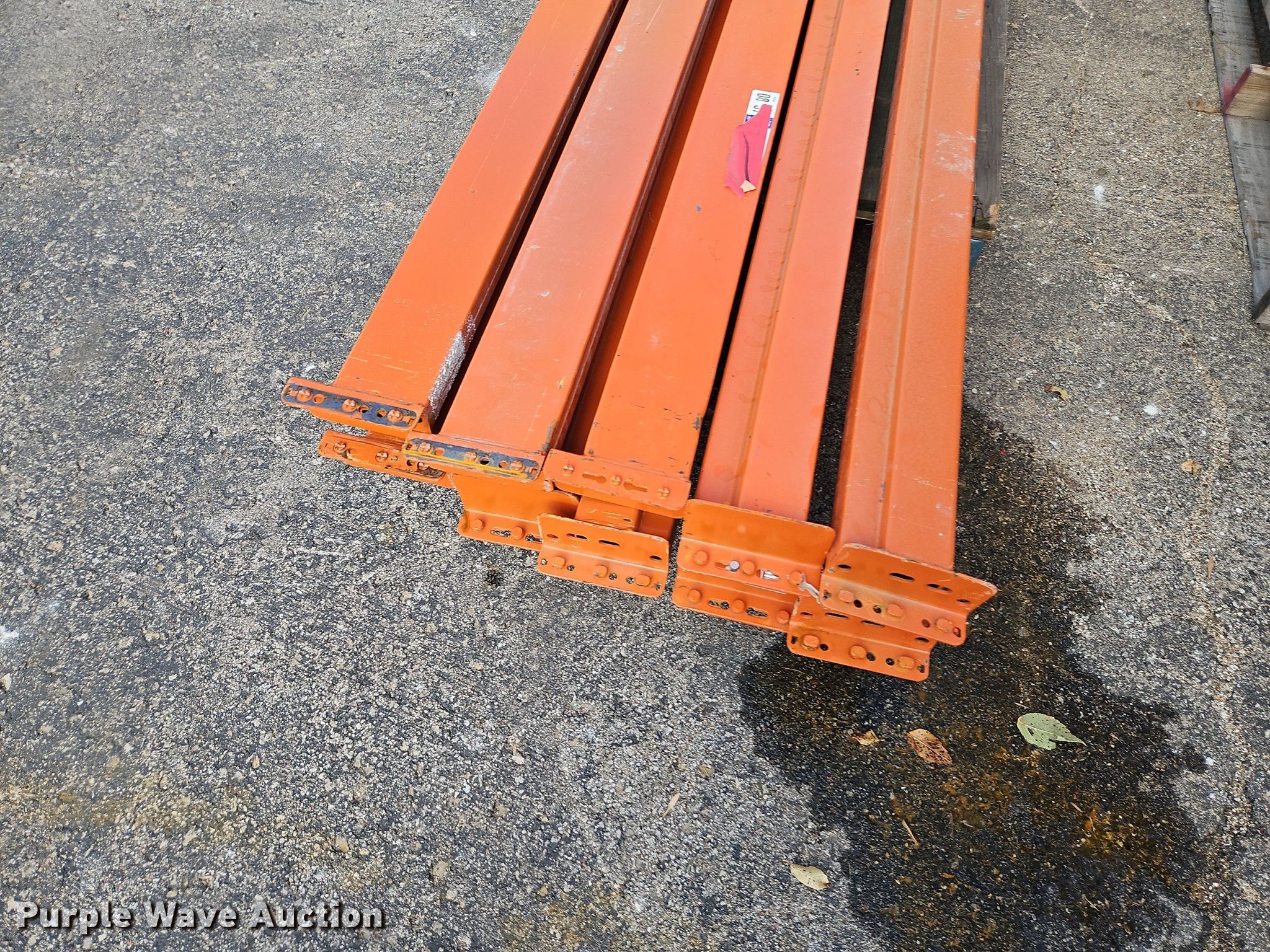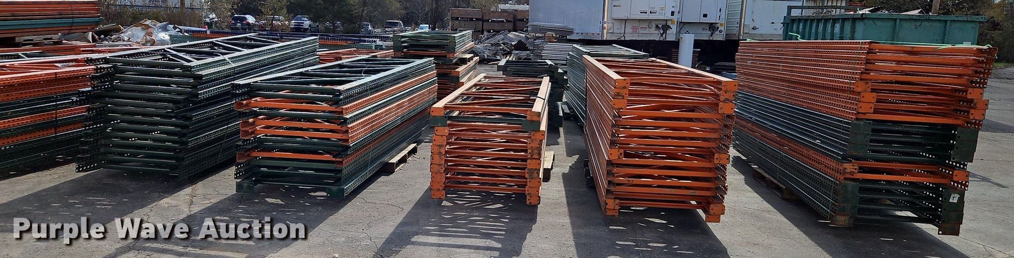 Purple Wave is selling a used Pallet Racking in Kansas. This item is a Pallet racking with the following: Approximately, (1200+) 10' horizontal beams, (16) 8' 6" horizontal beams, (20) 9' horizontal beams, (8) 7' horizontal beams, (4) 5' 6" horizontal beams, (32) 6' 6" horizontal beams, (186) 12' L x 36" W uprights, (25) 16' L x 26" W uprights, (8) 18' L x 42" W uprights, (4) 15' L x 42" W uprights, (2) pallets of 2x4 cross boards
