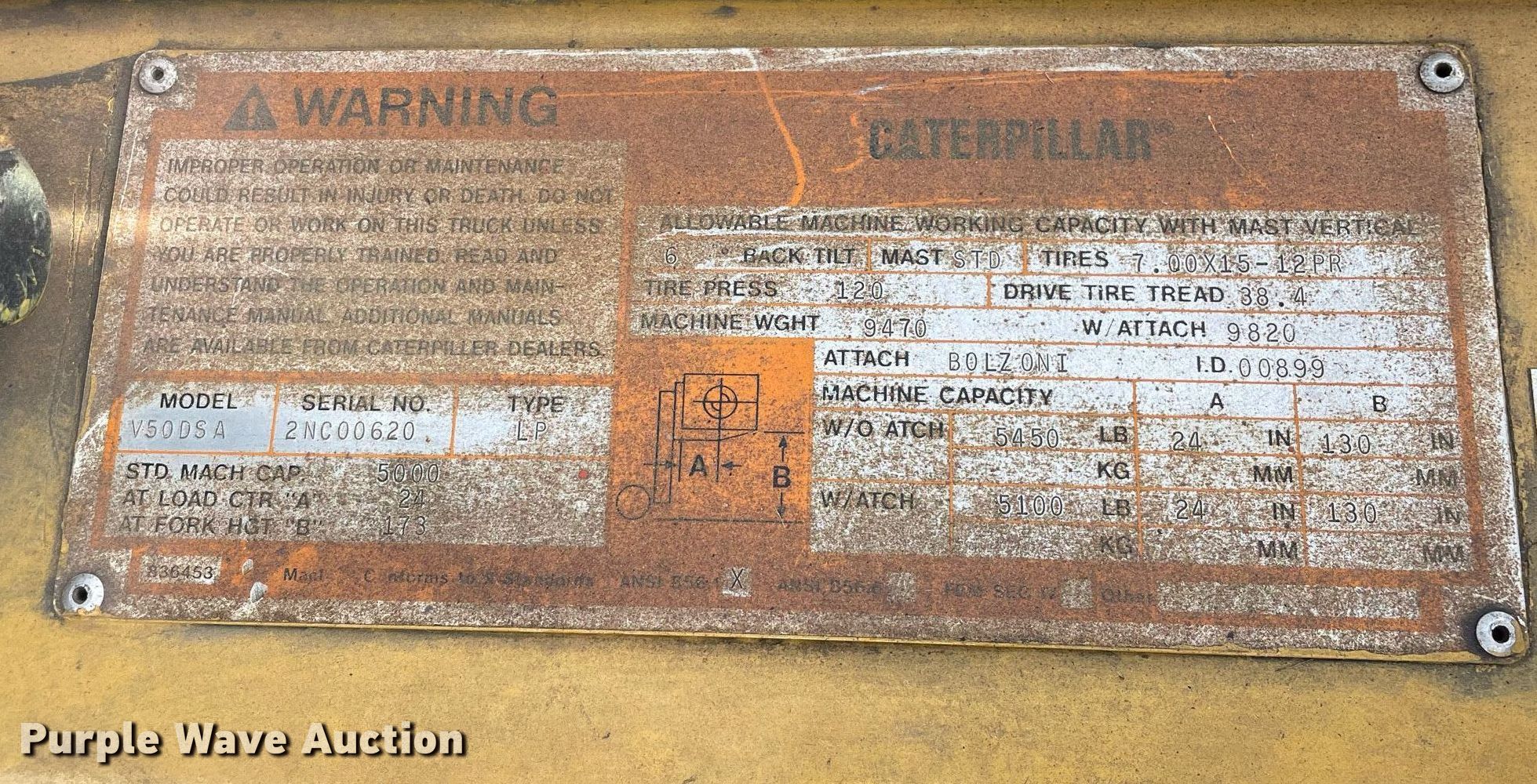 Caterpillar V50DSA forklift. Hours: 18,824 on meter, Serial: 2NC00620. Engine Caterpillar 1404, Cylinders: 4, Fuel type: LPG LP bottle: Not included. Transmission Powershift, 1F - 1R. Operators station Canopy. Features Maximum lift capacity: 5,450 lbs, Maximum lift height: 130", Mast stages: 2, Side shift, Mast tilt, Fork length: 42". Tires Front: 7.00-15, Rear: 6.00-9, Solid. 937 Detroit Avenue. Morton, IL 61550