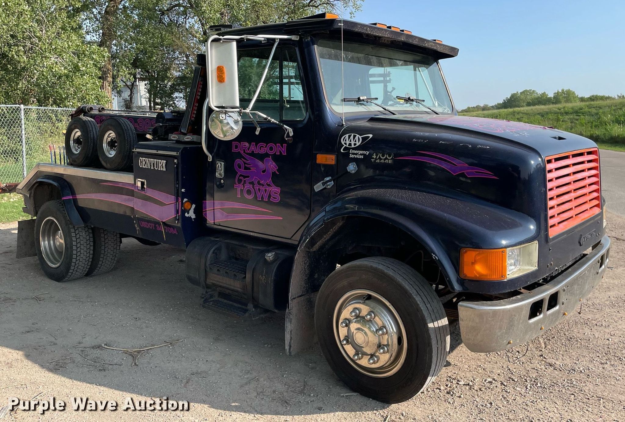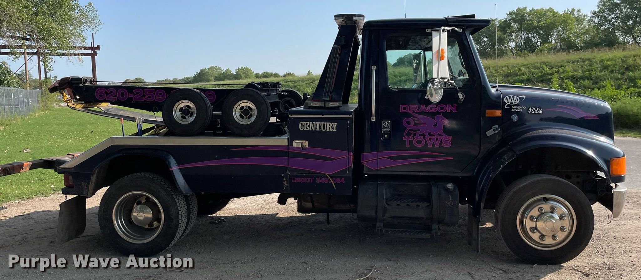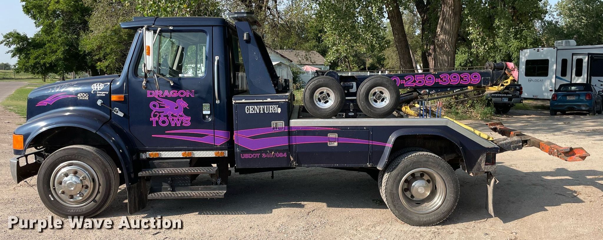 1997 International 4700 tow truck. Miles: 310,920 on odometer, VIN: 1HTSCABM3VH449013. Engine International T444E, Displacement: 7.3L, Cylinders: 8, Fuel type: Diesel. Transmission Automatic. Chassis Axles: Single, Suspension: Spring, Brakes: Hydraulic, PTO, GVWR: 23,440 lbs. Interior AC, Heat, Heated mirrors, Power windows, Cruise control. Features Wrecker bed Century , 10' L x 90" W, Wrecker boom: Hydraulic extendable, Winch Dual, Underlift. Tires Size: 245/70R19.5. Notes Non-operational lightbar, Contents included , (2) dollies included Capacity: 4,000 lbs, Windshield chipped or cracked. Kansas title. Title has a lien that will be released following the close of the auction. A paper title will be printed once the lien is released. Title distribution may be delayed up to 30 days from verification of funds. Dragon Tows Retirement. 13505 Southwest 140th St. Rose Hill, KS 67133