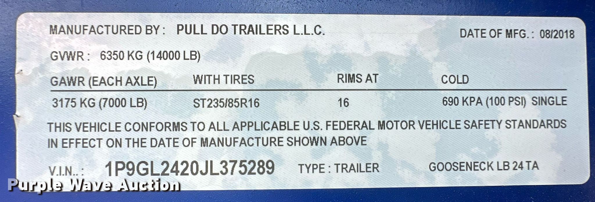 Purple Wave is selling a used Equip. Trailer in Oklahoma. This item is a 2018 Pull Do equipment trailer with the following: VIN: 1P9GL2420JL375289