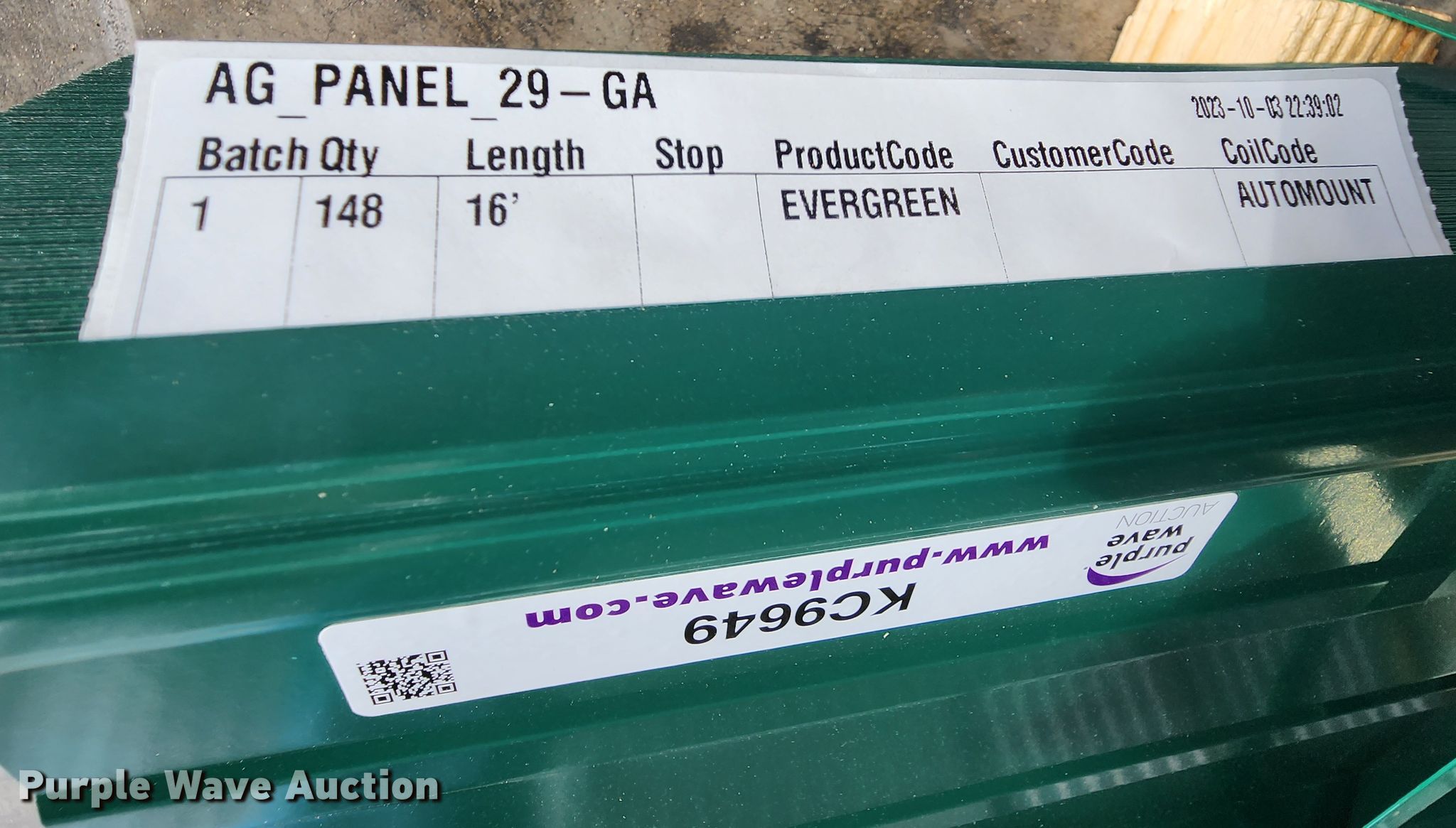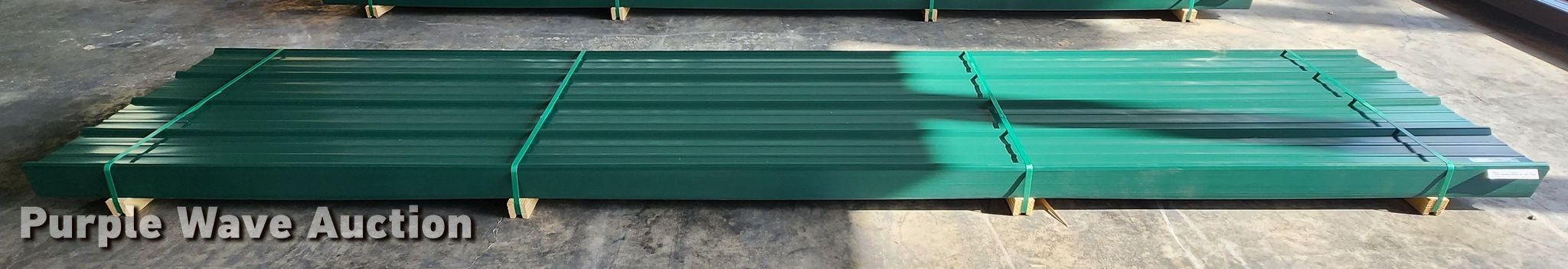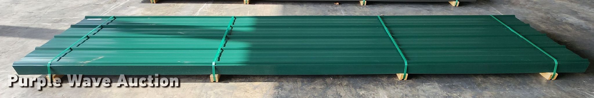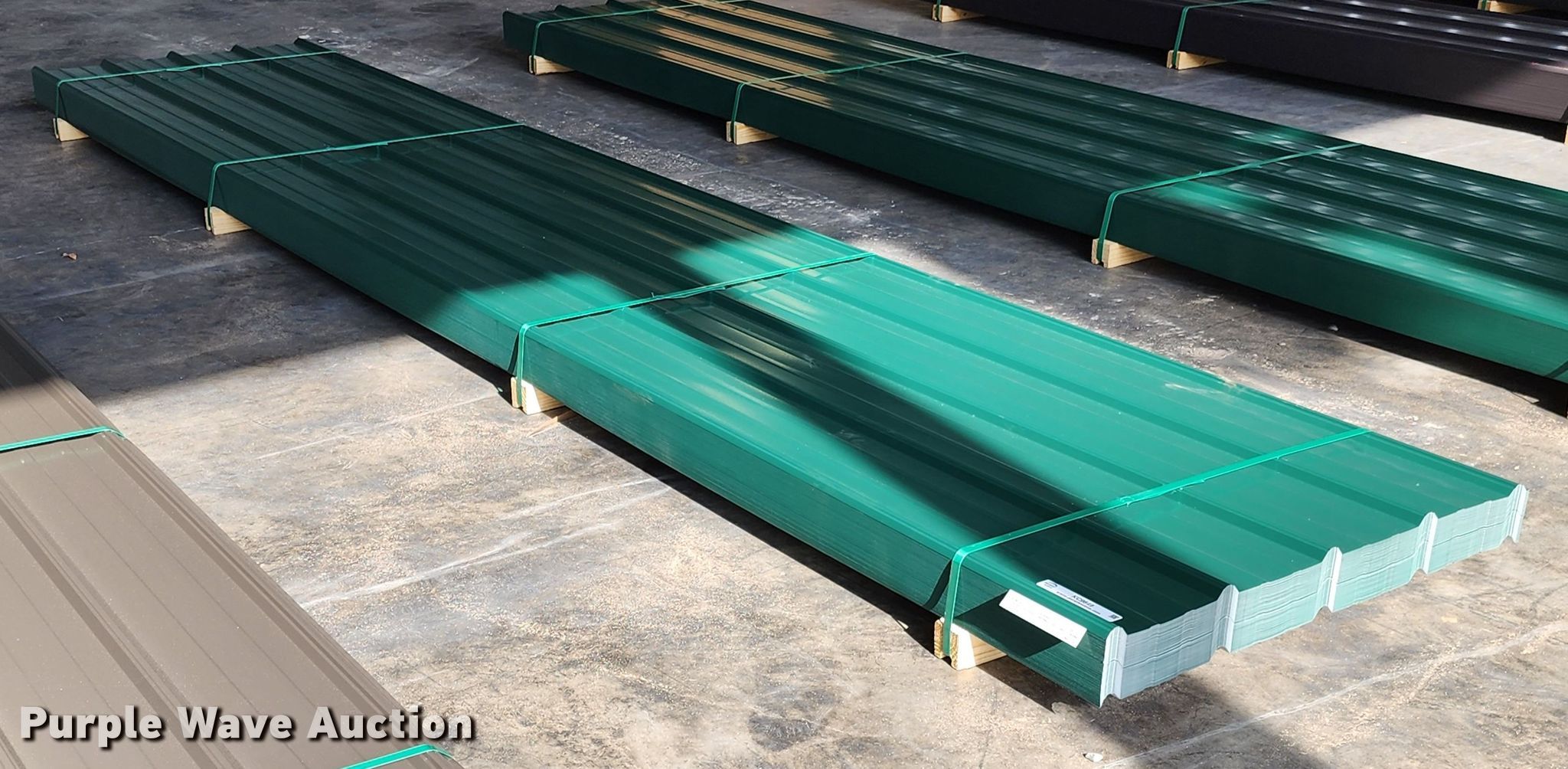 Purple Wave is selling a used Building Materials in Texas. This item is a (148) sheets of Doerkson Metal Components metal siding/roofing with the following: 16' L x 36" W overlap coverage, AG panel profile, 29 gauge, Color: Evergreen, Possible blemishes
