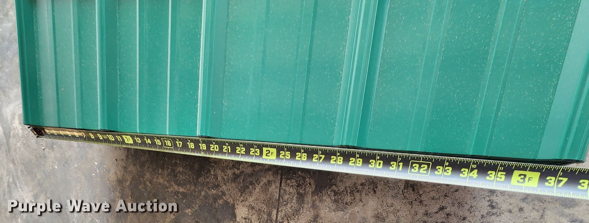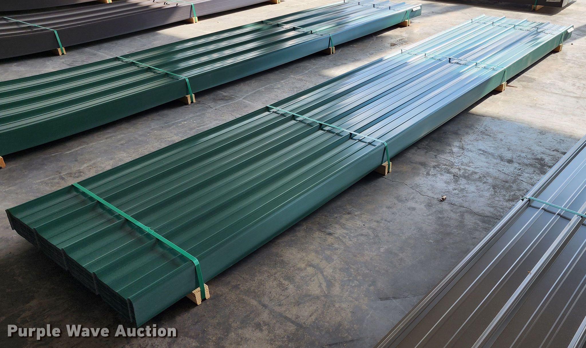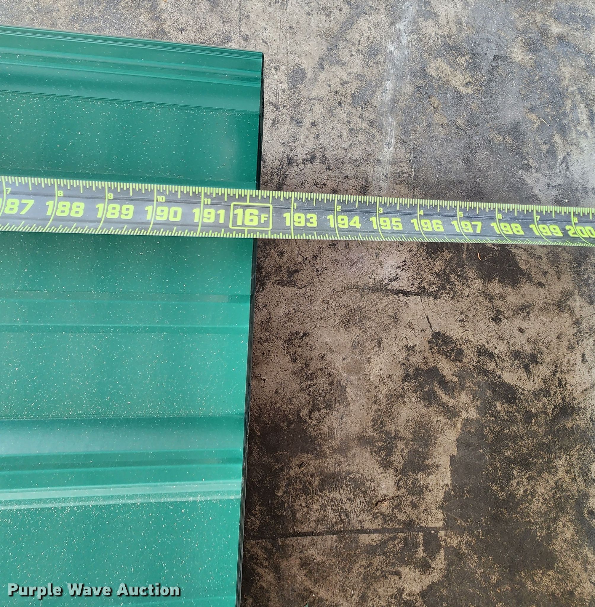 Purple Wave is selling a used Building Materials in Texas. This item is a (148) sheets of Doerkson Metal Components metal siding/roofing with the following: 16' L x 36" W overlap coverage, AG panel profile, 29 gauge, Color: Evergreen, Possible blemishes