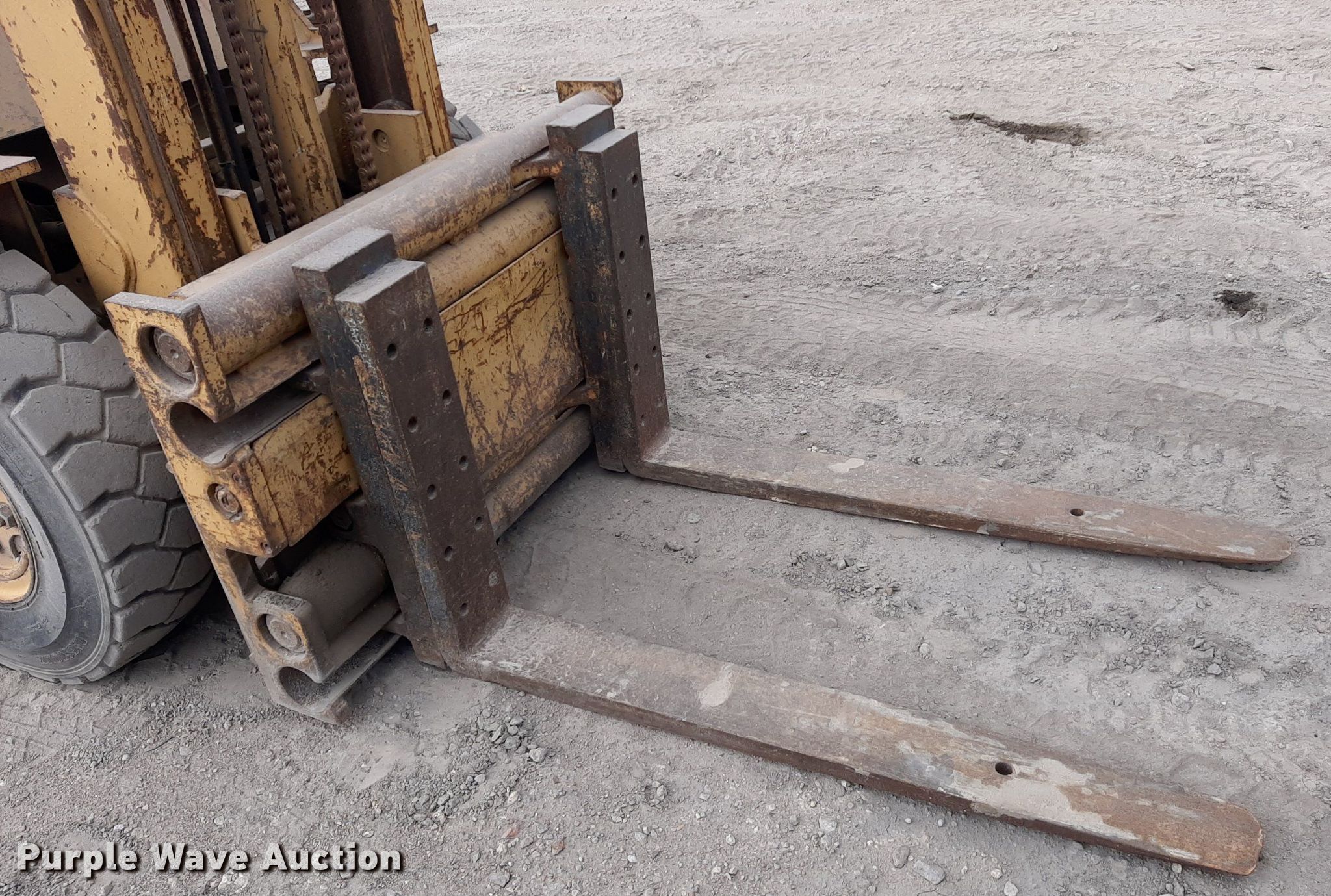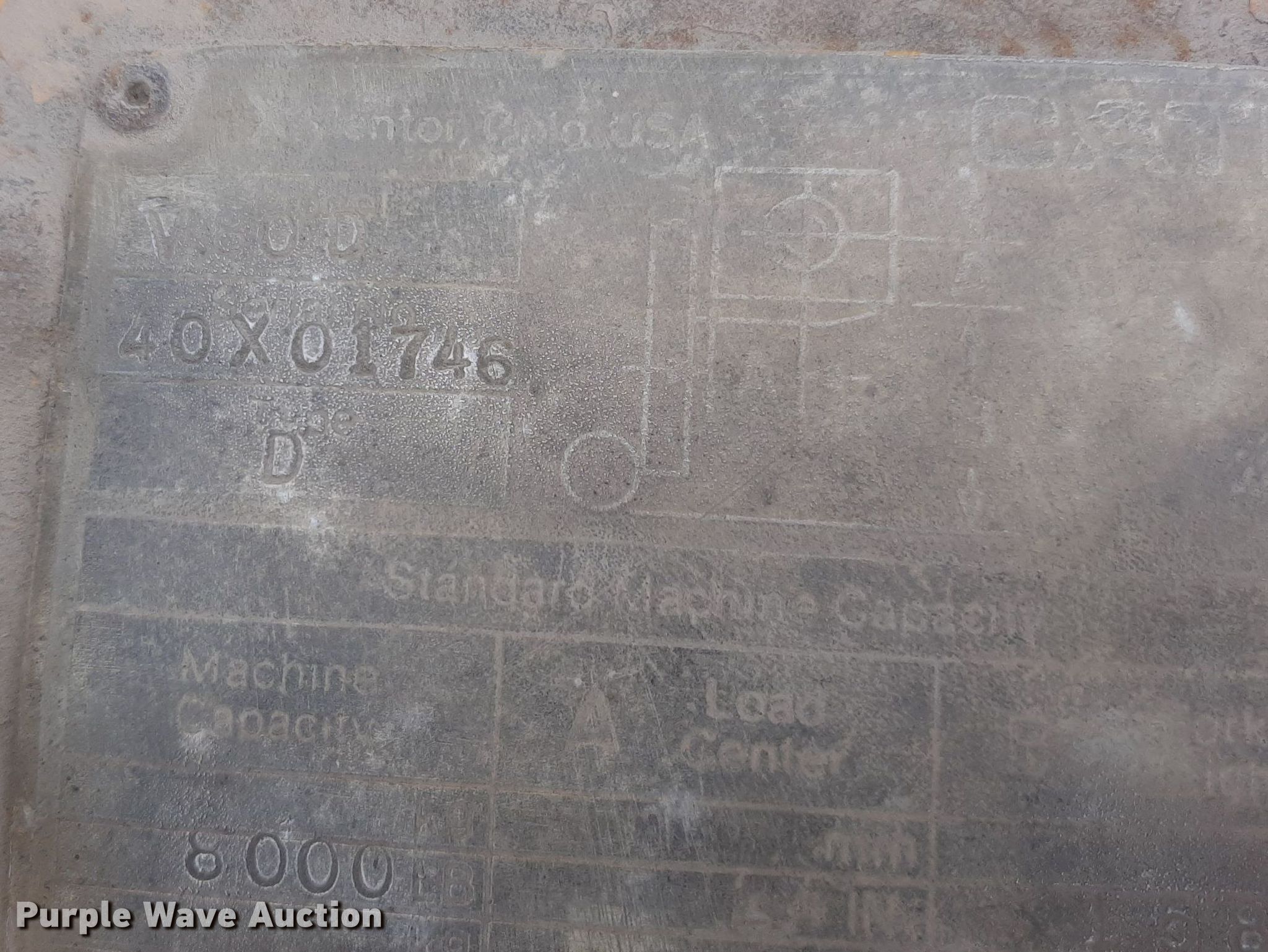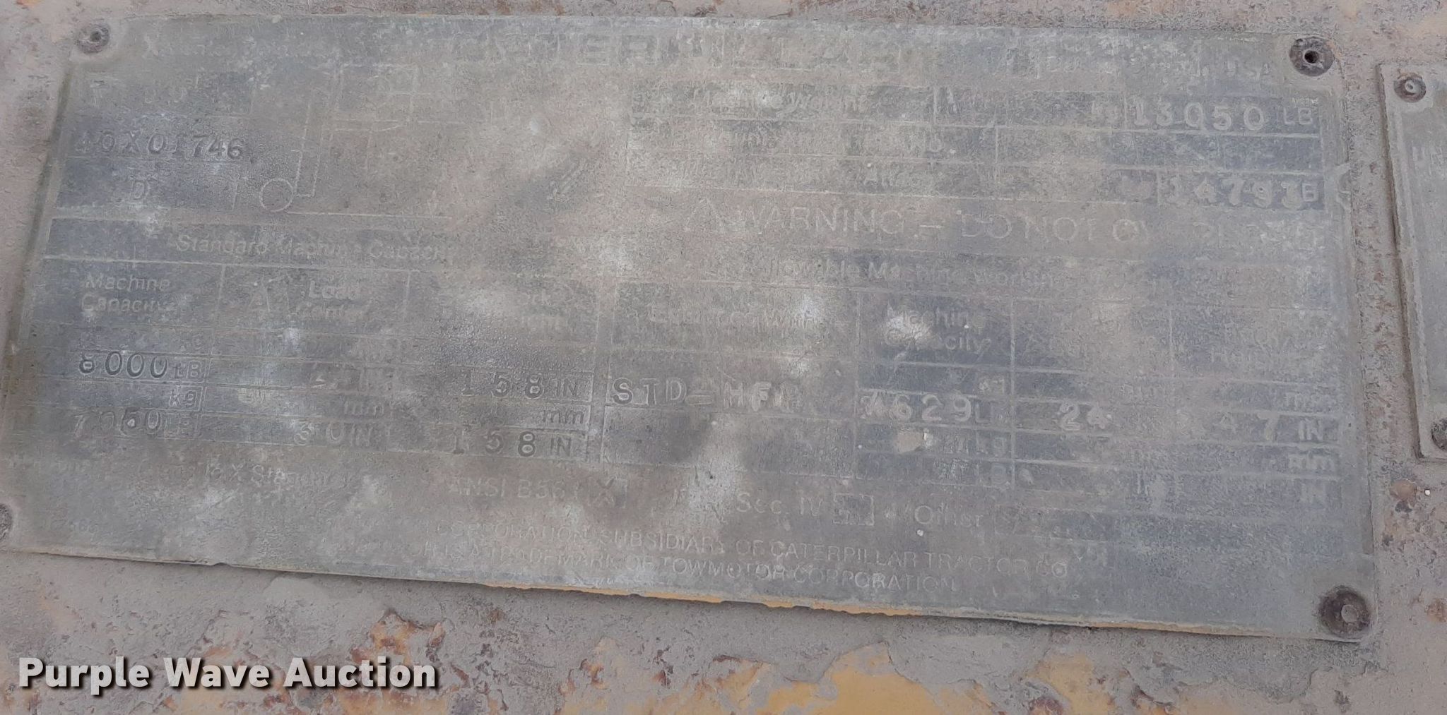 Caterpillar V80D forklift. Serial: 40X01746. Engine Cylinders: 4, Fuel type: Diesel. Transmission Powershift. Operators station OROPS. Features Maximum lift capacity: 8,000 lbs, Maximum lift height: 158", Mast stages: 2, Mast tilt, Fork length: 50". Tires Front: 8.25-15, Rear: 7.00-12. Notes Dead battery. Wichita Trailer, Inc.. 335 East 49th Street North. Park City, KS 67219