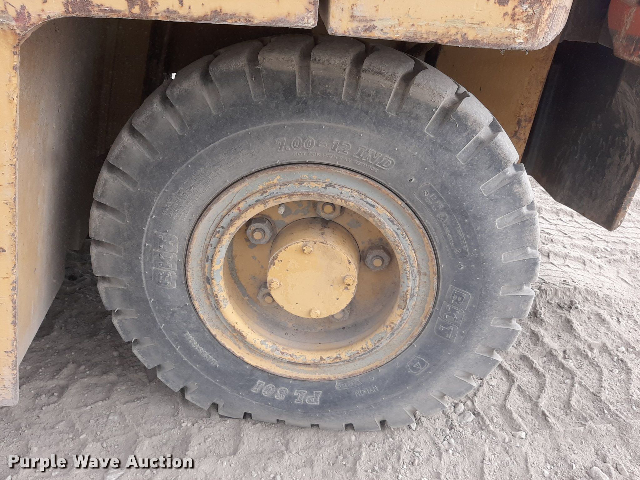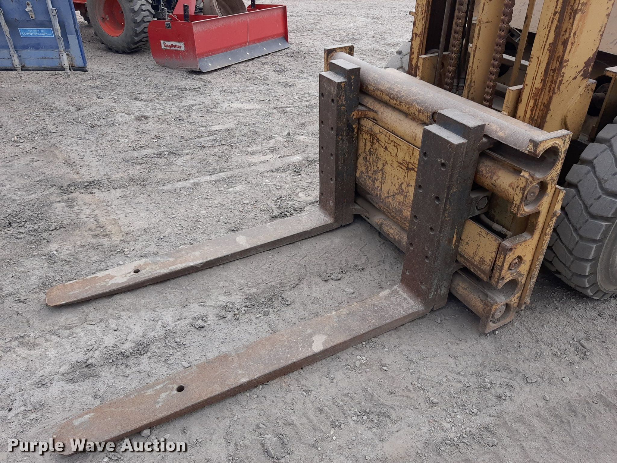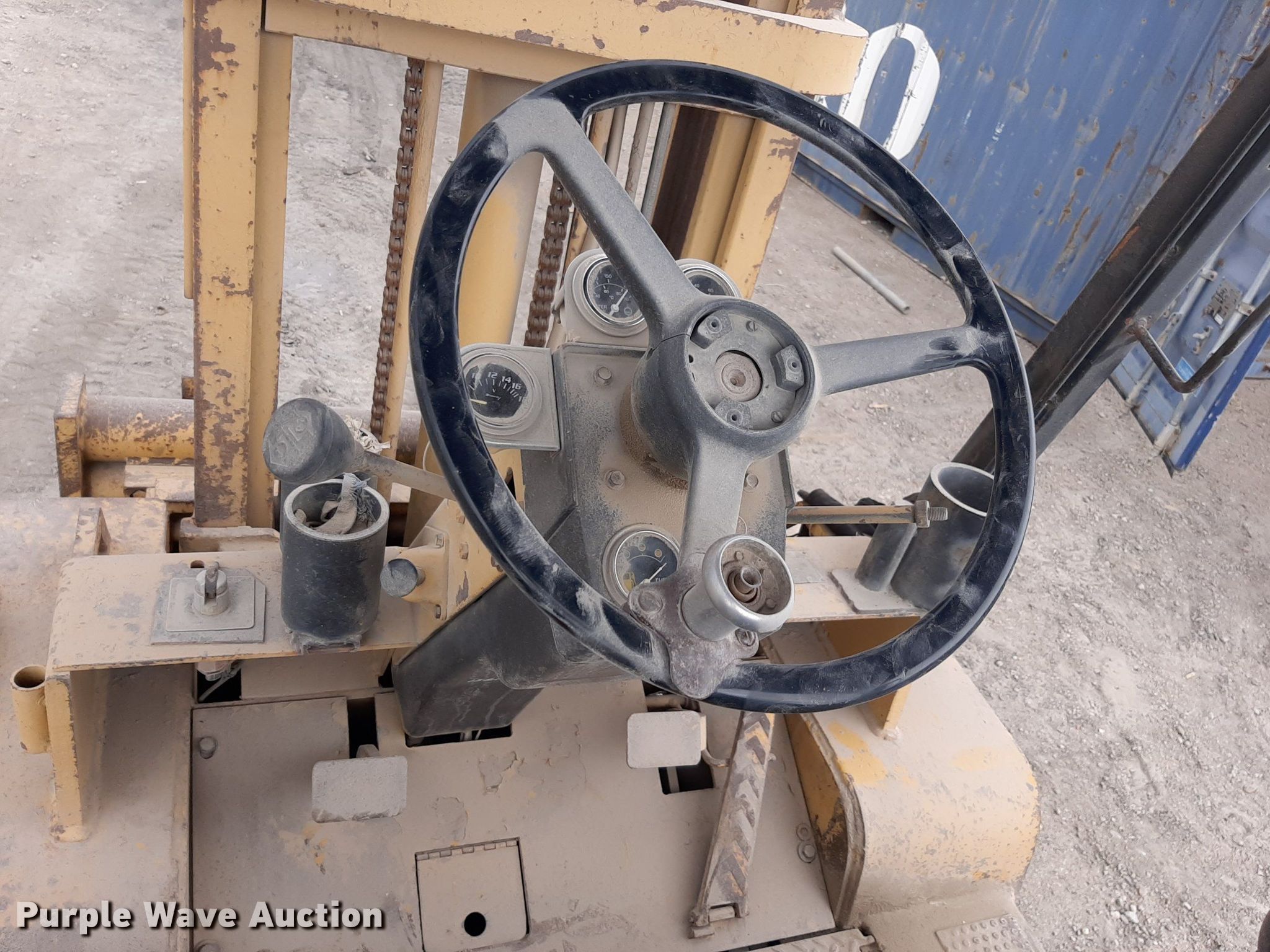 Caterpillar V80D forklift. Serial: 40X01746. Engine Cylinders: 4, Fuel type: Diesel. Transmission Powershift. Operators station OROPS. Features Maximum lift capacity: 8,000 lbs, Maximum lift height: 158", Mast stages: 2, Mast tilt, Fork length: 50". Tires Front: 8.25-15, Rear: 7.00-12. Notes Dead battery. Wichita Trailer, Inc.. 335 East 49th Street North. Park City, KS 67219