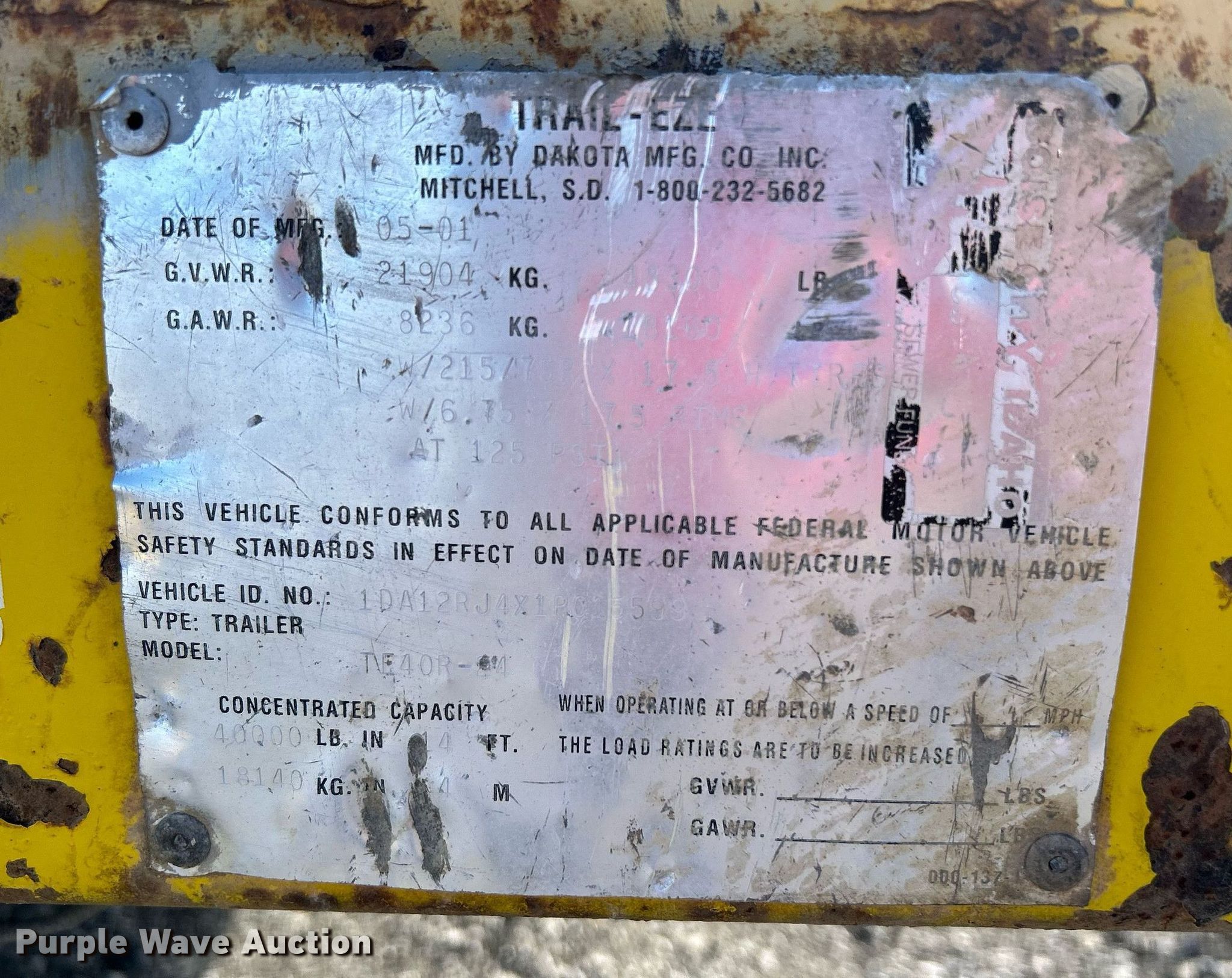 Purple Wave is selling a used Equip. Trailer in Oklahoma. This item is a 2001 Dakota MFG Trail-Eze equipment trailer with the following: VIN: 1DA12RJ4X1P015599