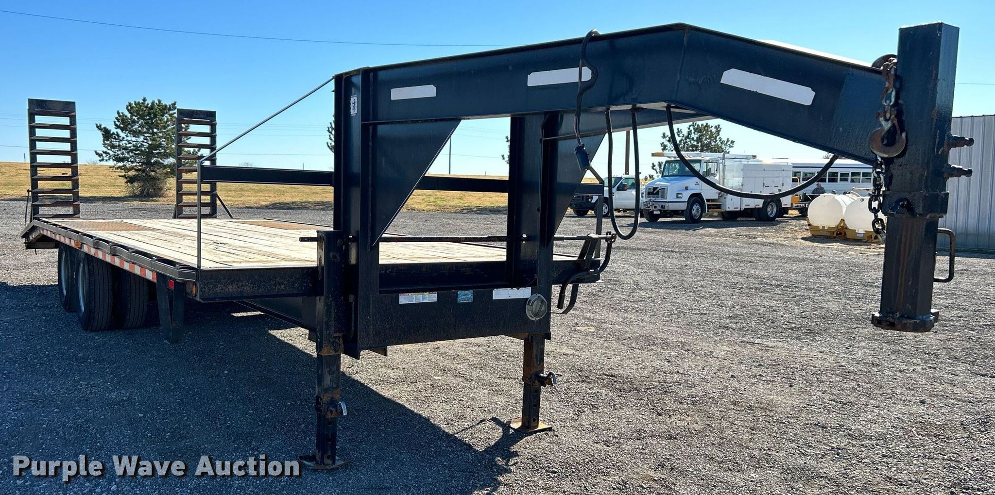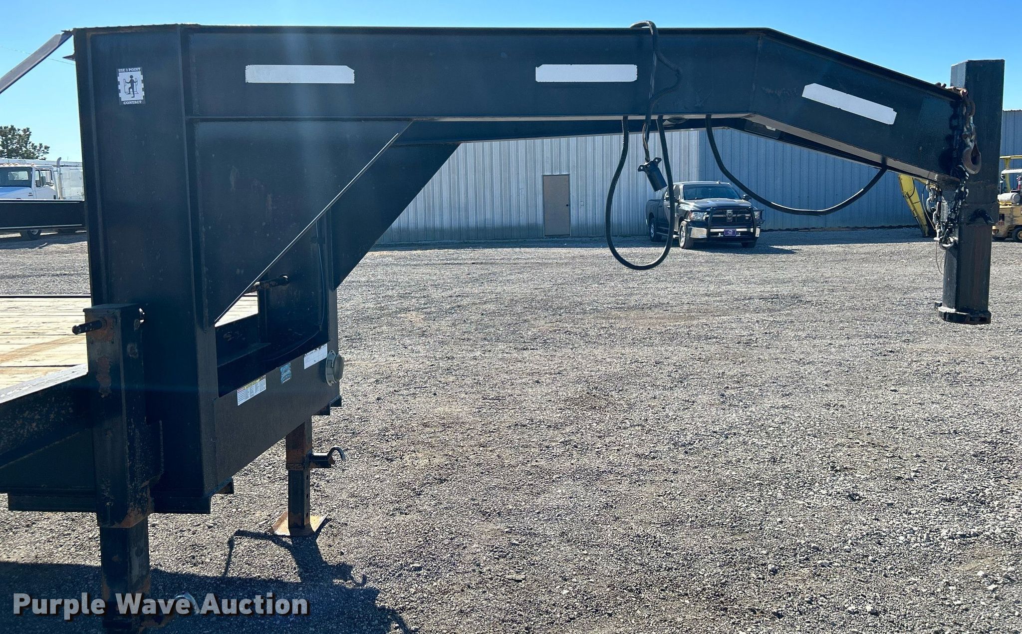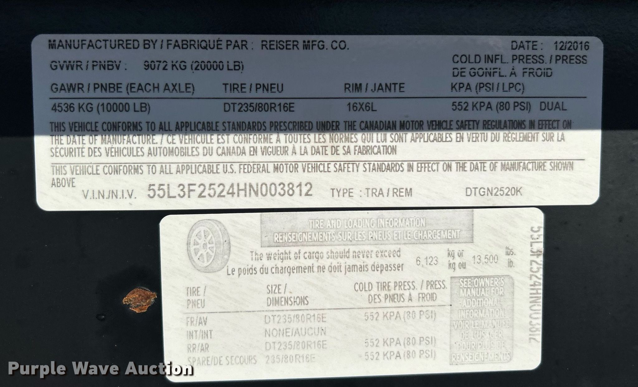2017 Reiser DTGN2520K equipment trailer. VIN: 55L3F2524HN003812. Dimensions Overall: 34' L x 101" W, Deck: 20' L x 92" W, Tail length: 5', Ramps: Manual Length: 5'. Features Deck type: Wood. Chassis Hitch: Gooseneck, Landing gear: Dual, Suspension: Spring, Brakes: Electric, Axles: Tandem, GVWR: 20,000 lbs, GAWR: 10,000 lbs. Tires Size: ST235/80R16. Oklahoma title. Title distribution may be delayed up to 14 days from verification of funds. 15107 North 137th East Avenue. Collinsville, OK 74021