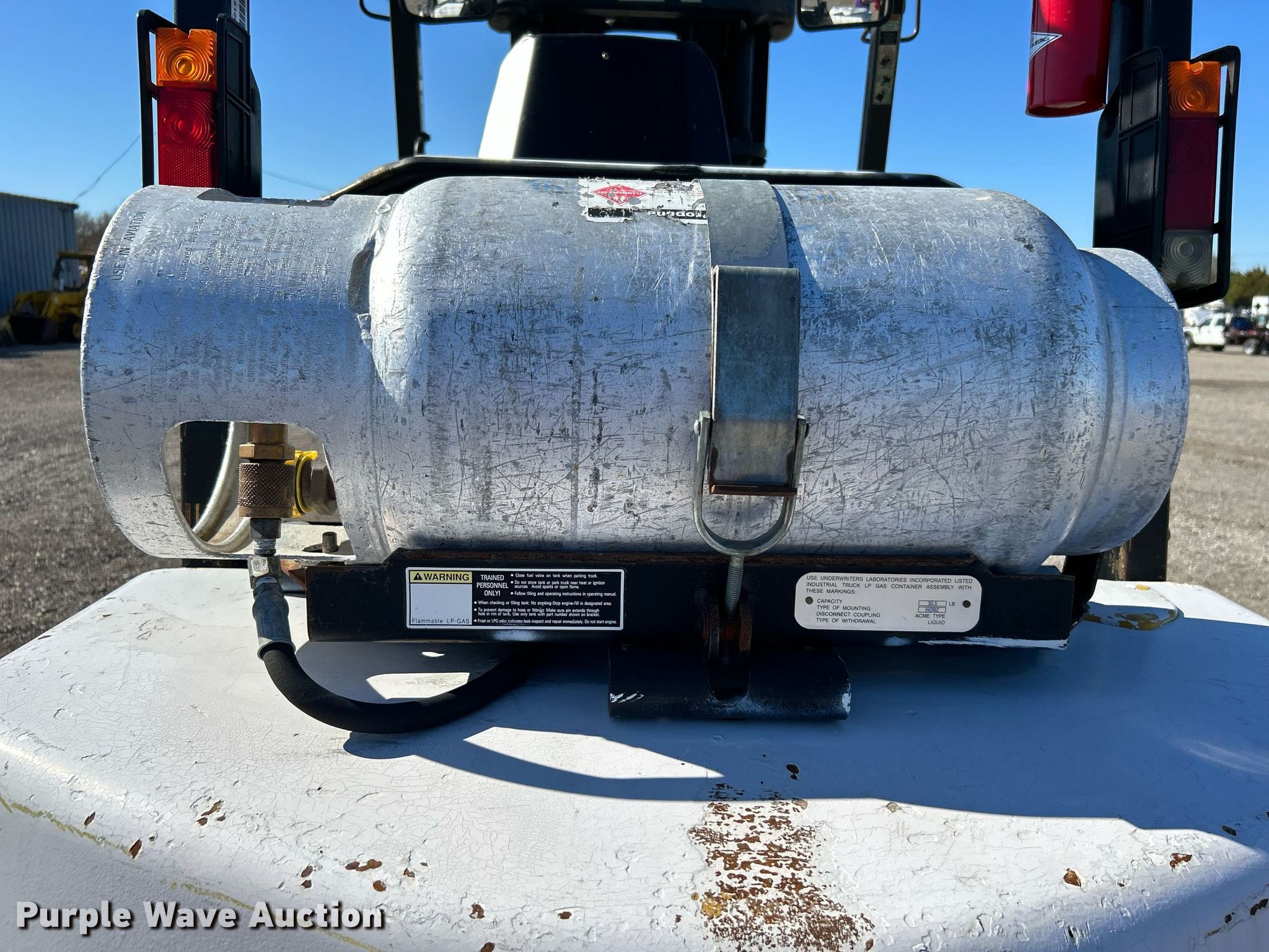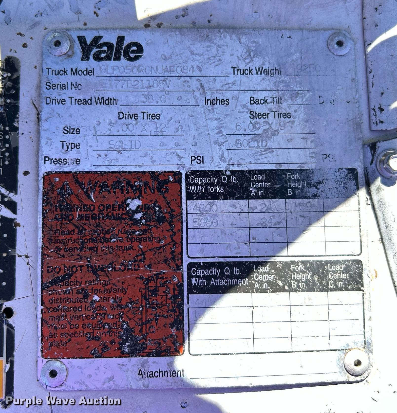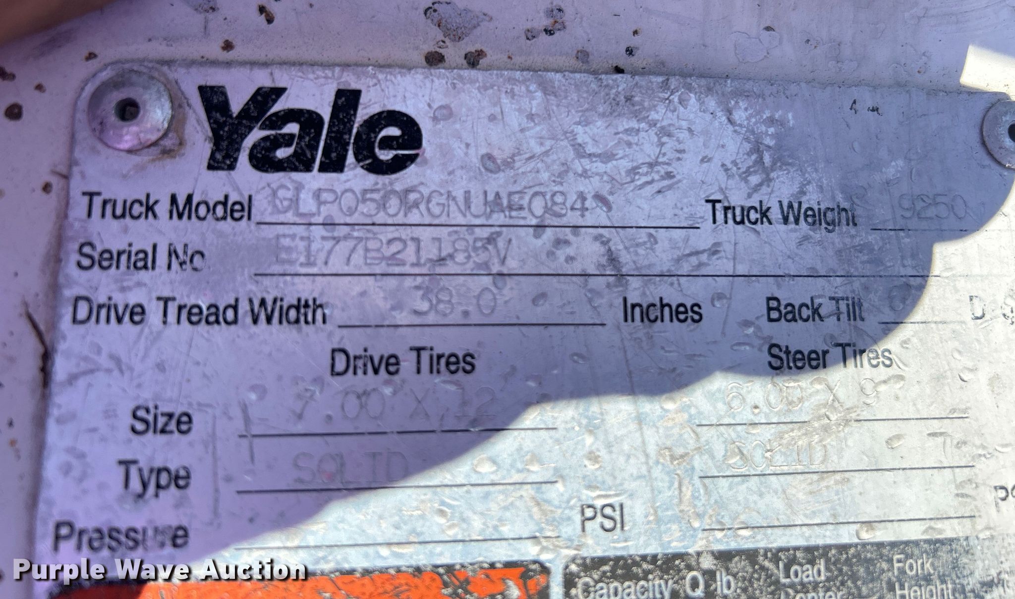 Yale GLP050RGNUAE084 forklift. Hours: 13,107 on meter, Serial: E177B21185V. Engine Cylinders: 4, Fuel type: LPG LP bottle: Included. Transmission Hydrostatic. Operators station Canopy. Features Maximum lift capacity: 5,000 lbs, Maximum lift height: 189", Mast stages: 3, Side shift, Mast tilt, Fork length: 69". Tires Front: 7.00-12, Rear: 6.00-9, Solid. 15107 North 137th East Avenue. Collinsville, OK 74021