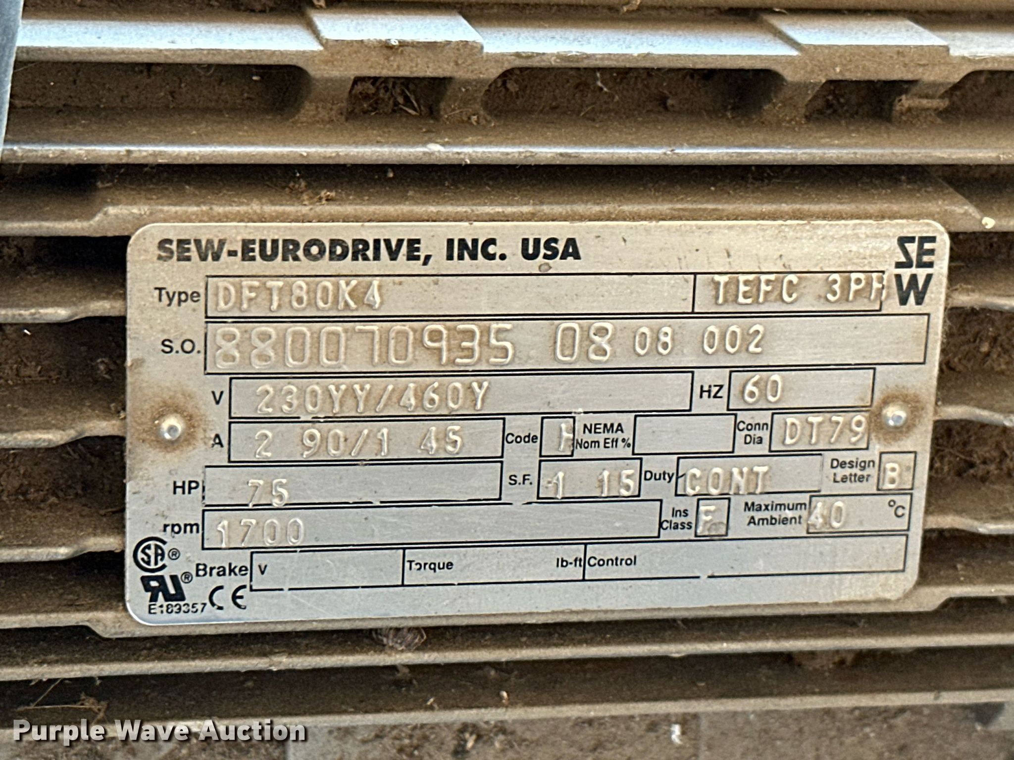 Purple Wave is selling a used Electric Motor in Kansas. This item is a (2) electric motors with the following: Sew-Eurodrive DFT8OK4, Hp: 75, Phase: Single, Volts: 230/460, Emerson EL10, Volts: 208-230/460, Phase: Three, Tuthill 5003 high pressure blower