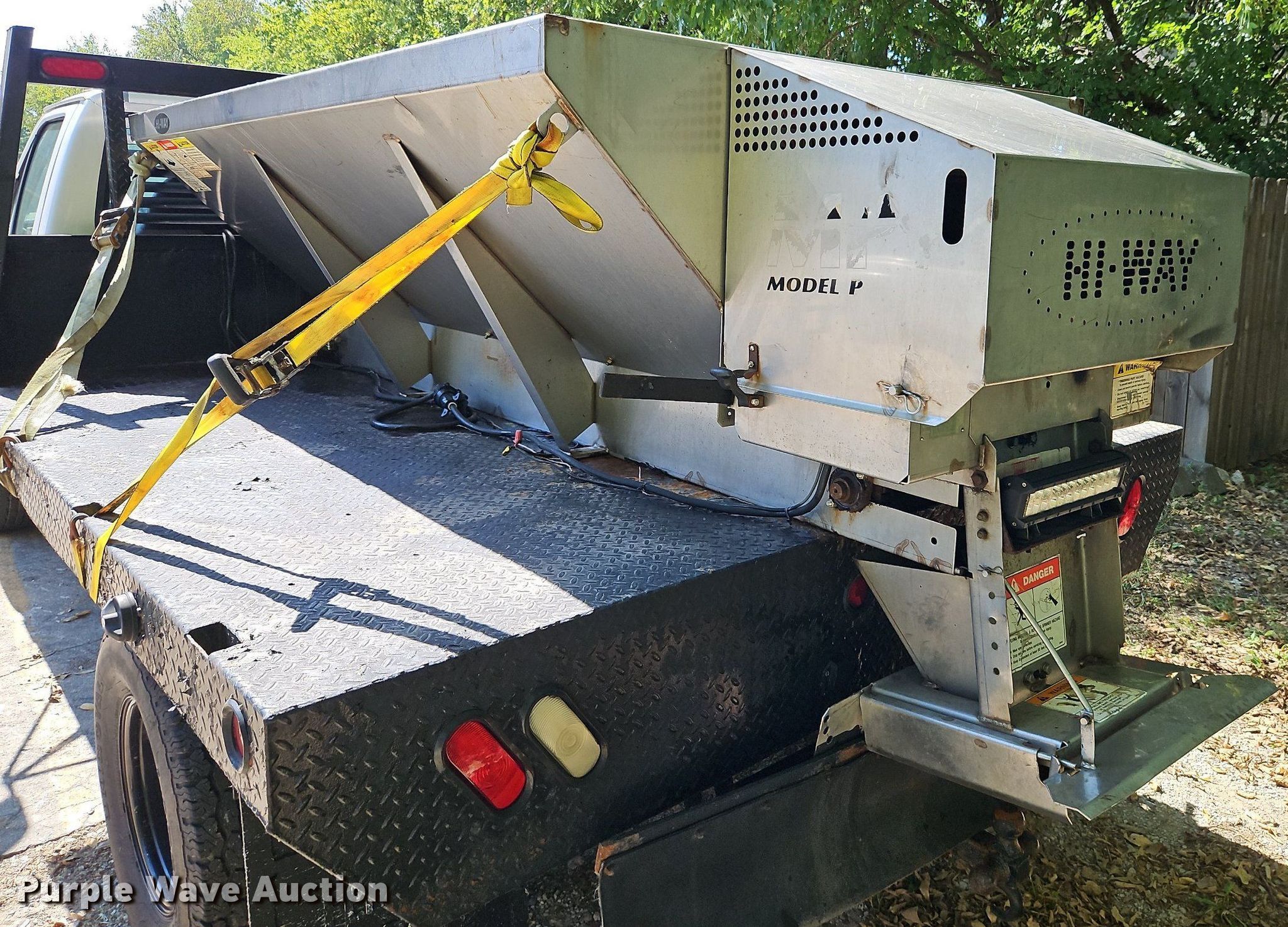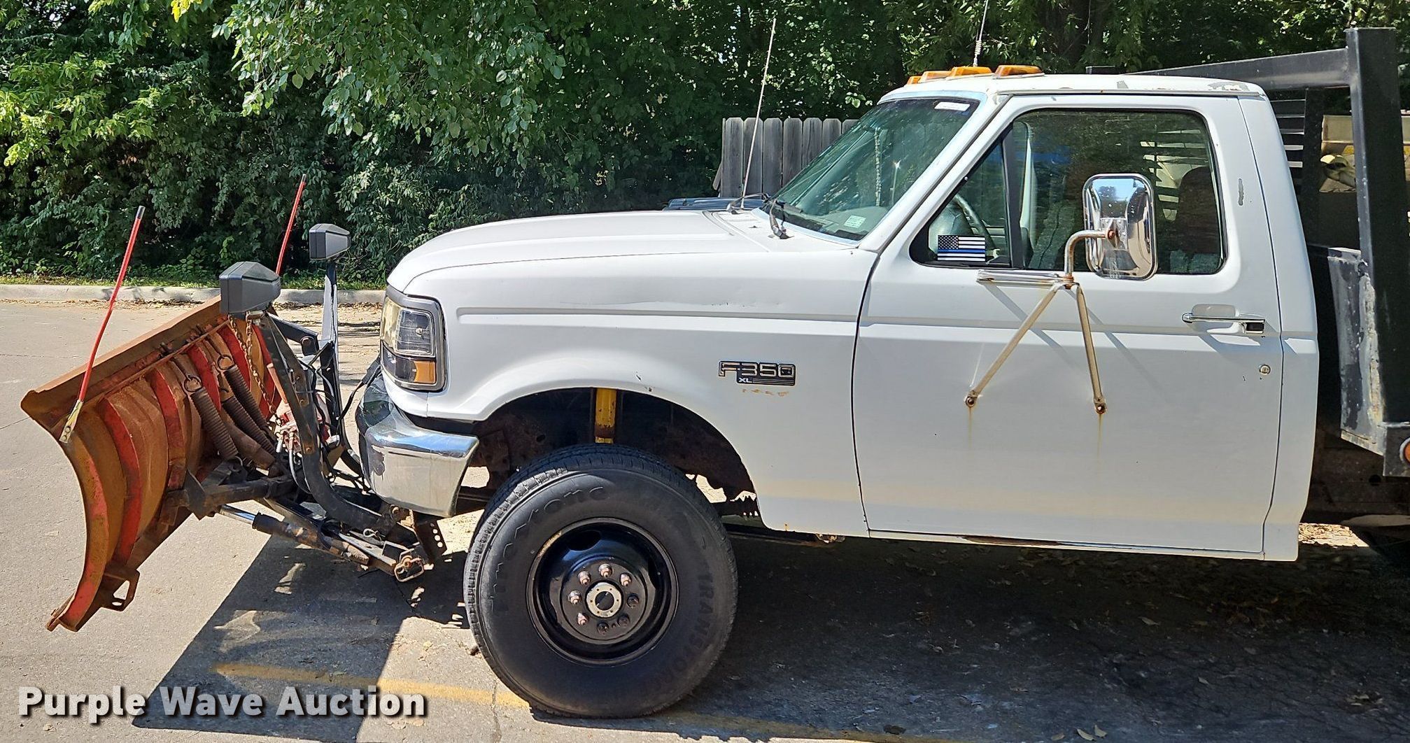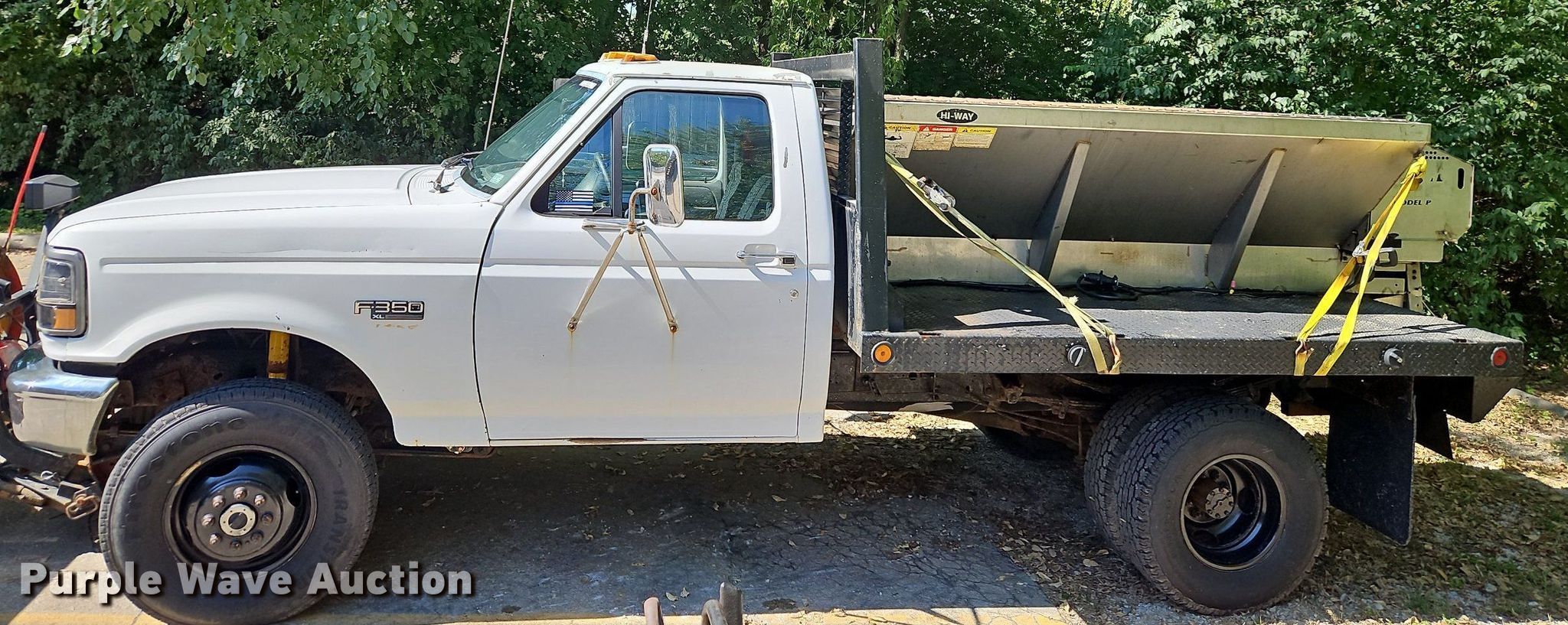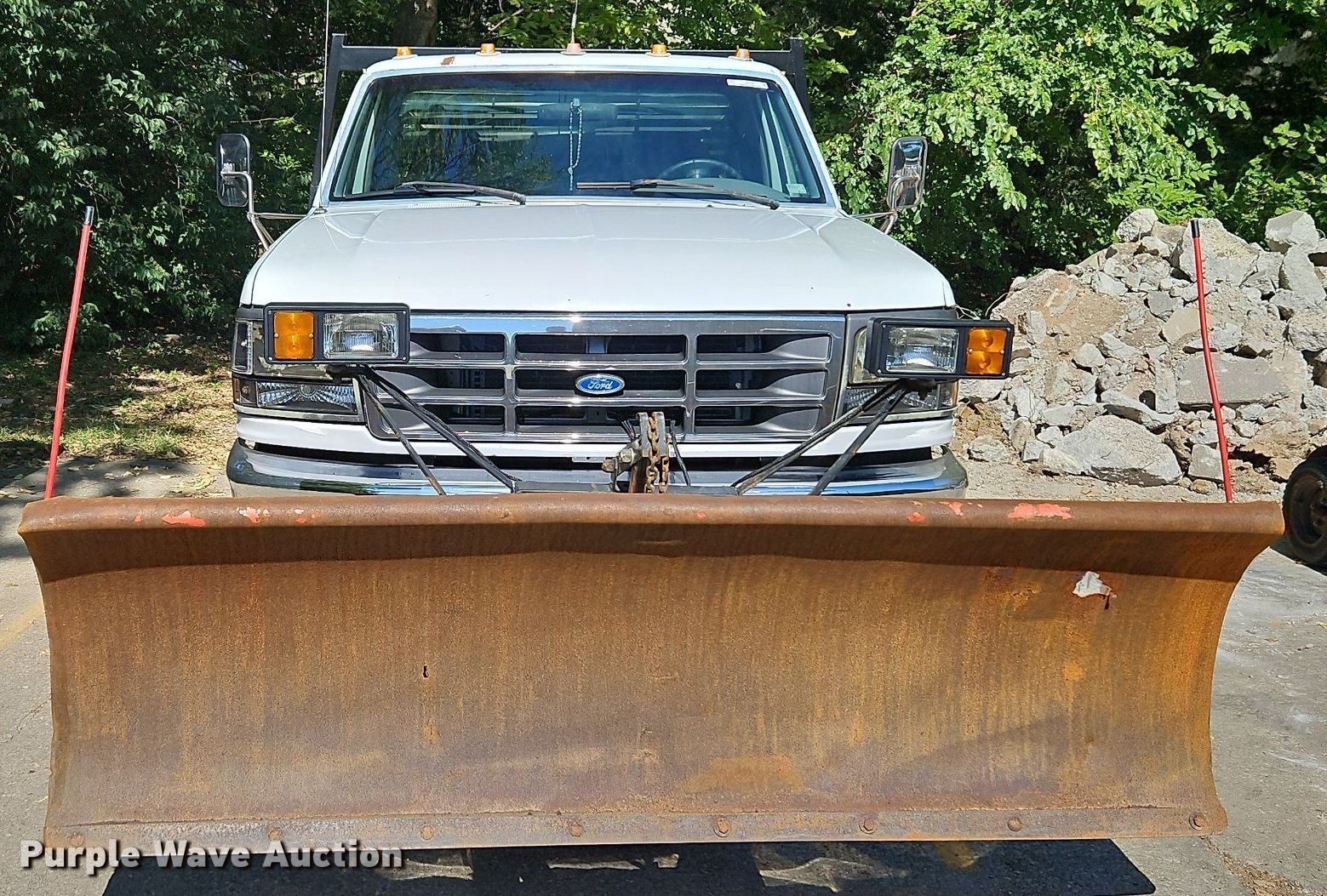 1995 Ford F350 flatbed pickup truck. Miles: 161,270 on odometer, VIN: 1FDKF38G2SEA74063. Engine Displacement: 7.5L V8 OHV, Cylinders: 8, Fuel type: Gas. Transmission Manual, Speed: 5, Four wheel drive. Interior AC, Heat. Features Flatbed 8' 6" L x 7' 9" W, Hitch: Gooseneck, Hi-Way MP-8 stainless steel spreader Engine: Briggs and Stratton , 10.5 hp, Weston snow blade Width: 7' 6". Tires Size: 235/85R16. Kansas title. Title distribution may be delayed up to 14 days from verification of funds. Equity Management. 625 Folks Road. Lawrence, KS 66049