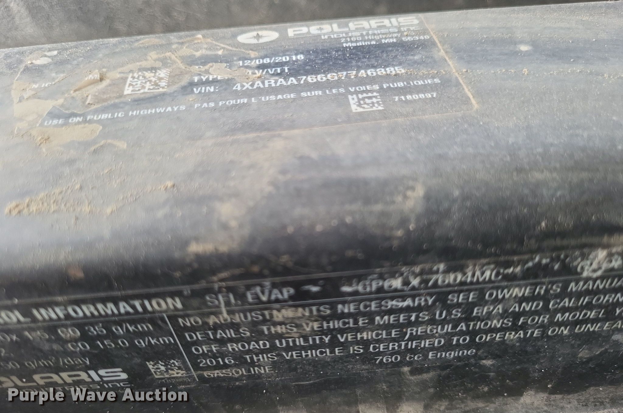 Purple Wave is selling a used Utility Vehicle in Missouri. This item is a 2016 Polaris Ranger 6x6 utility vehicle with the following: Miles: 3,367 on odometer, VIN: 4XARAA766G7746885, Unit #: 123