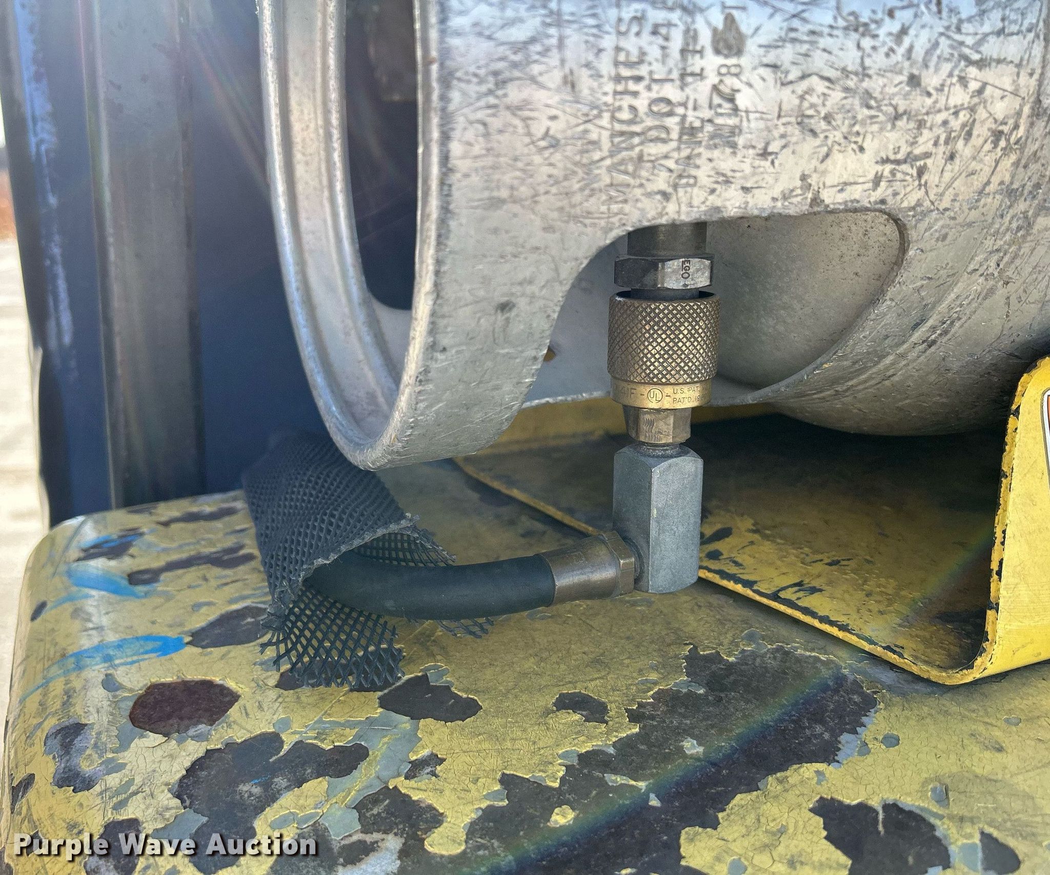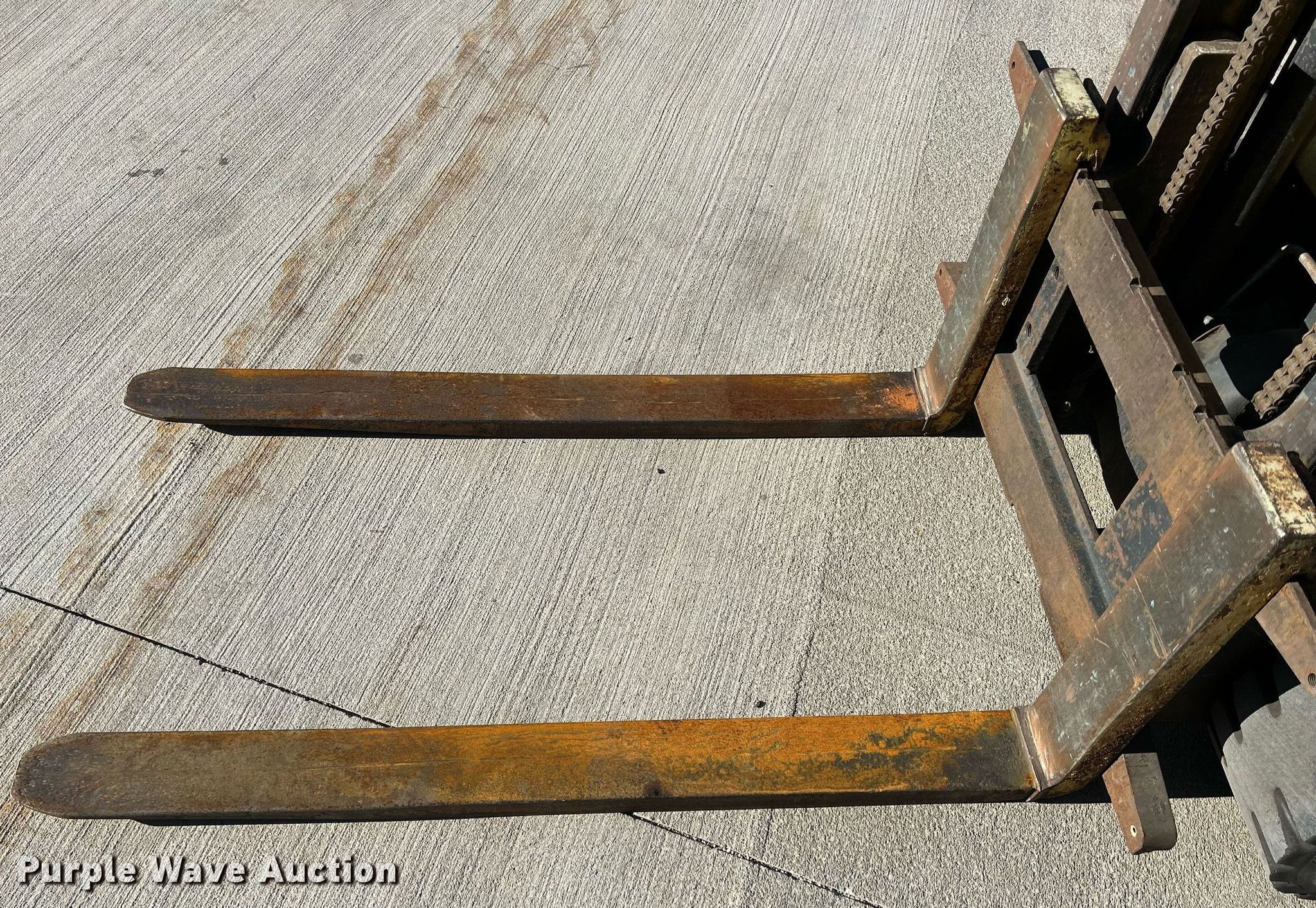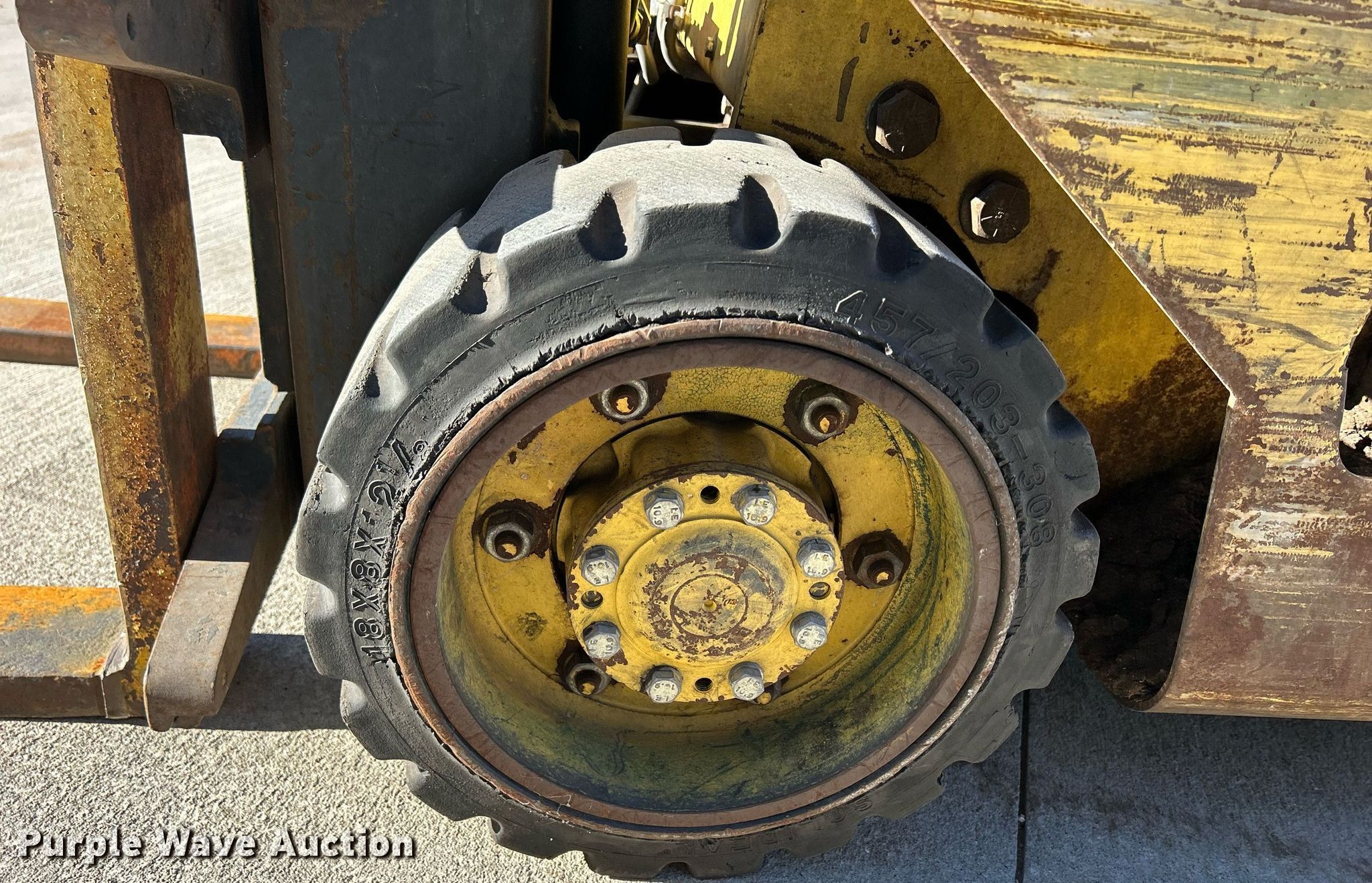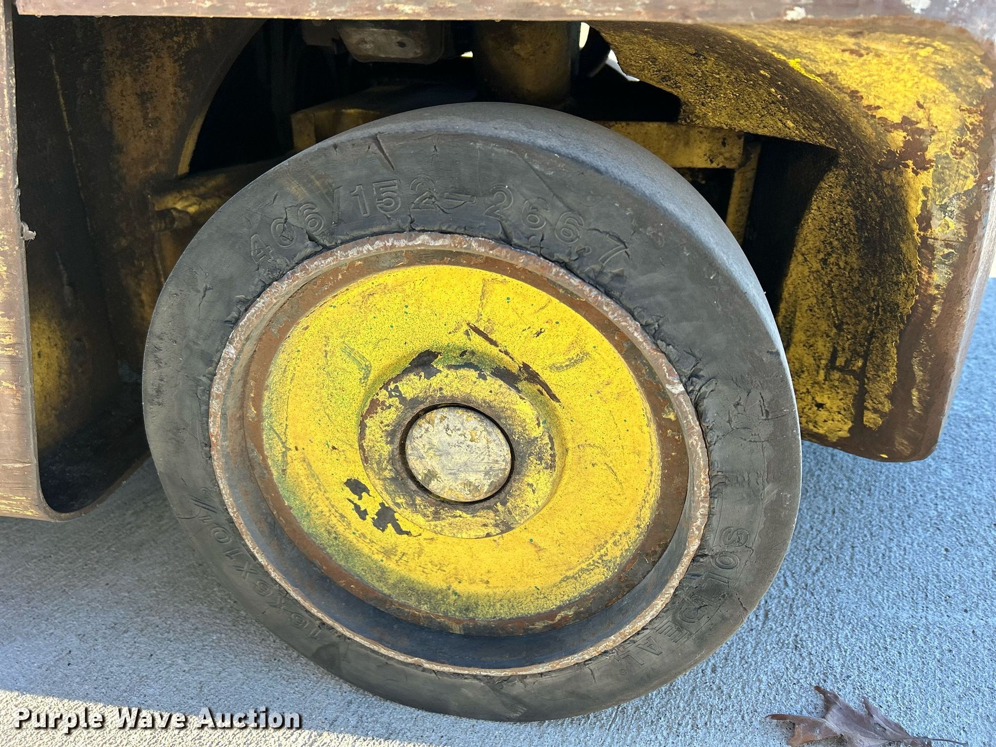 Hyster S50 forklift. Hours: 2,469 on meter, Serial: C187V06760P. Engine Cylinders: 4, Fuel type: LPG LP bottle: Not included. Transmission Hydrostatic. Operators station OROPS. Features Maximum lift capacity: 5,700 lbs, Maximum lift height: 82", Mast stages: 2, Mast tilt, Fork length: 48". Tires Front: 18x8x12.5, Rear: 16x6x10.5, Solid. Notes Dead battery, Starter issues, Transmission issues, leaks, Non-operational unit. 2086 231st Street. Muscatine, IA 52761