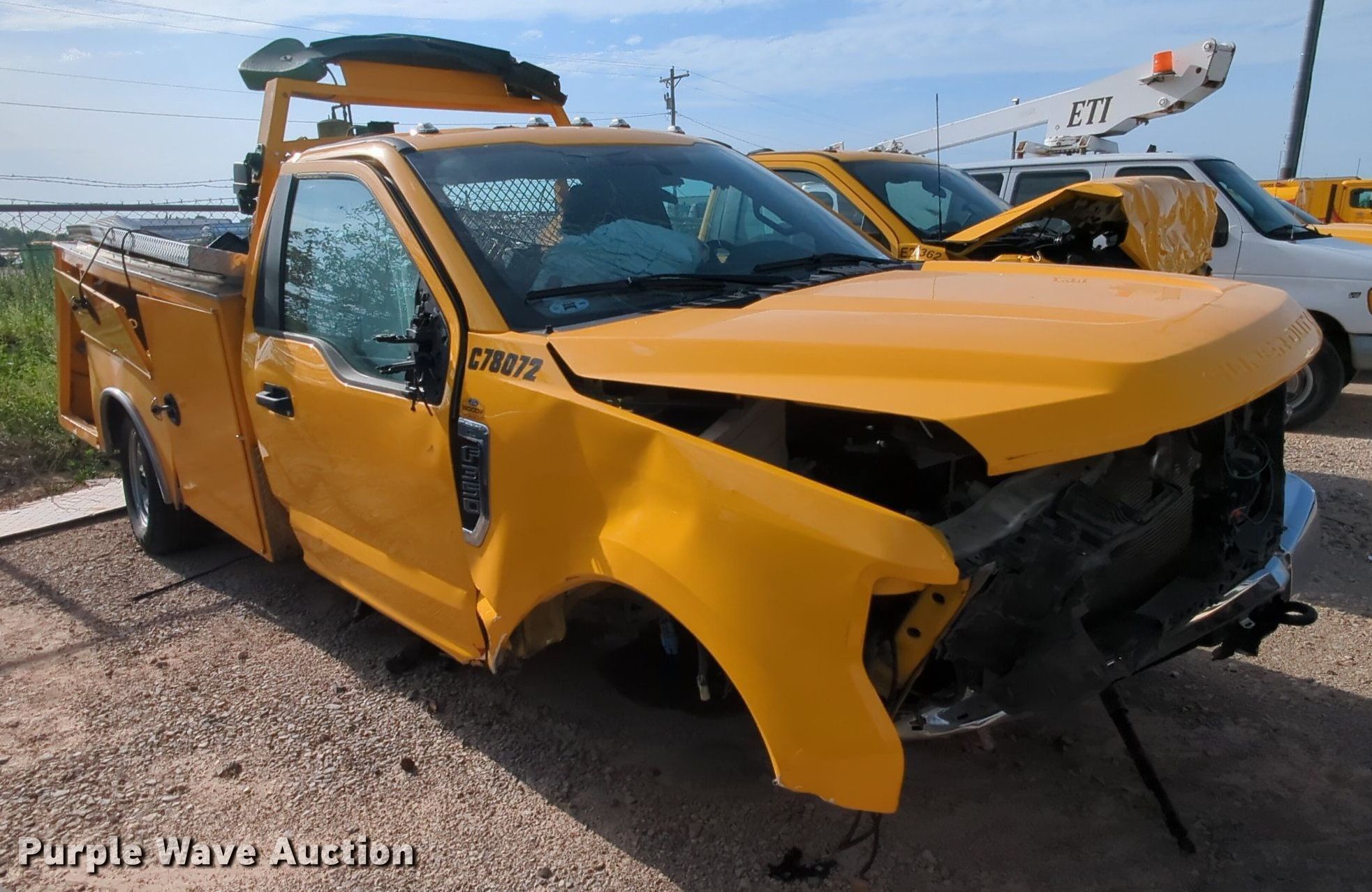 Purple Wave is selling a used 3/4 or 1 Ton Pickup or Van in Oklahoma. This item is a 2022 Ford F350 Super Duty utility bed pickup truck with the following: Miles: 53,995 on odometer, VIN: 1FDRF3E66NEC78072